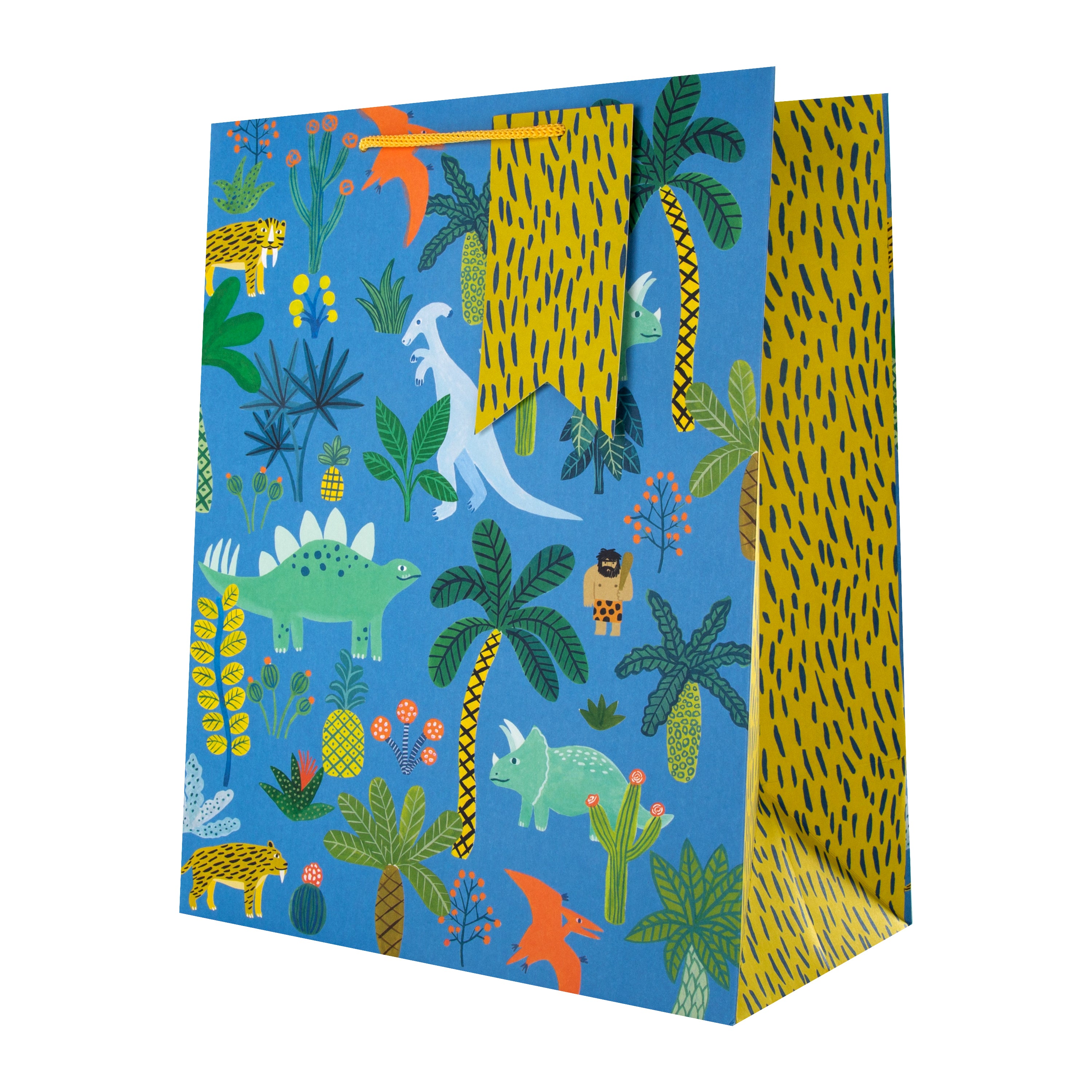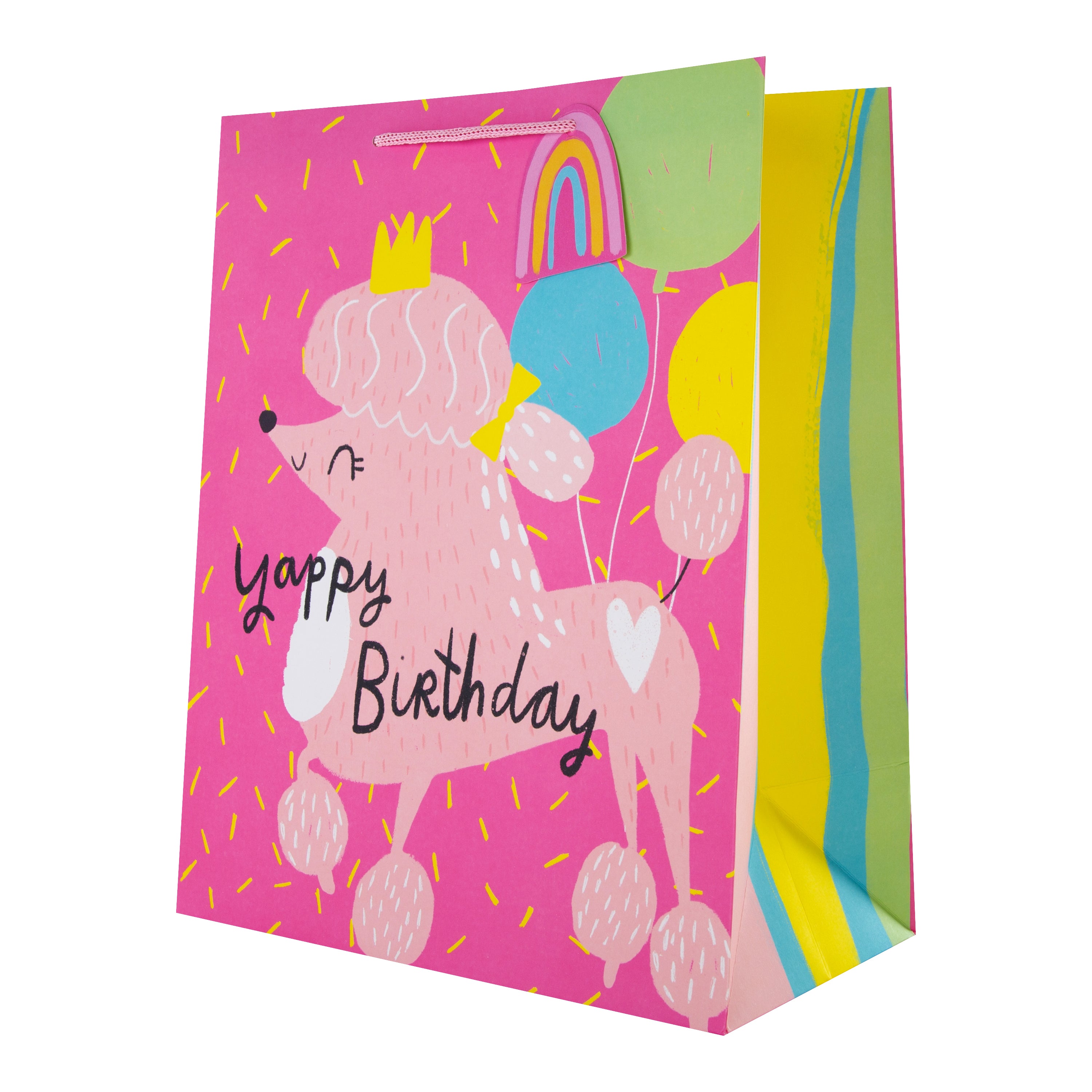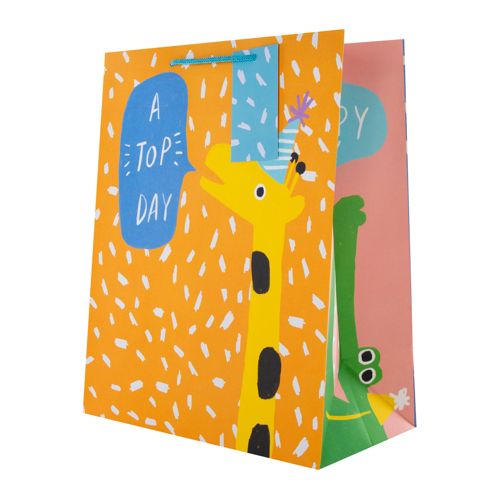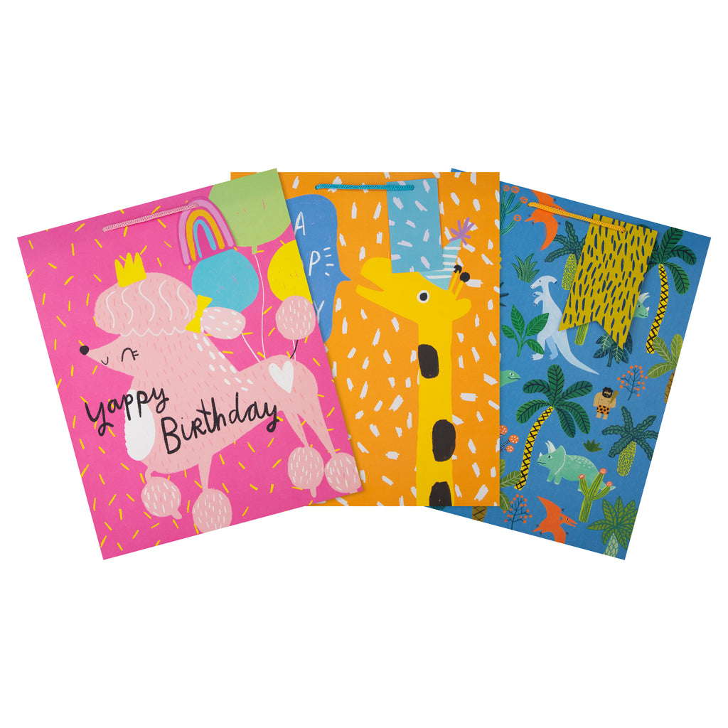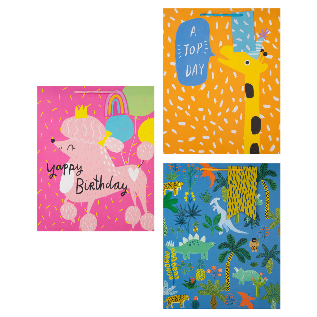 This pack includes 3 large gift bags; Bag 1 features an illustrated design with multi-coloured sides, light pink knitted paper handles, a rainbow shaped gift tag and text which reads: "Yappy Birthday". Bag 2 features an illustrated animal design with illustrated animal sides, blue knitted paper handles, a light blue patterned gift tag and text which reads: "A top day", "Party Time!" & "Have a Snappy Day". Bag 3 features an illustrated dinosaur design with yellow patterned sides, yellow knitted paper handles and a yellow patterned gift tag.