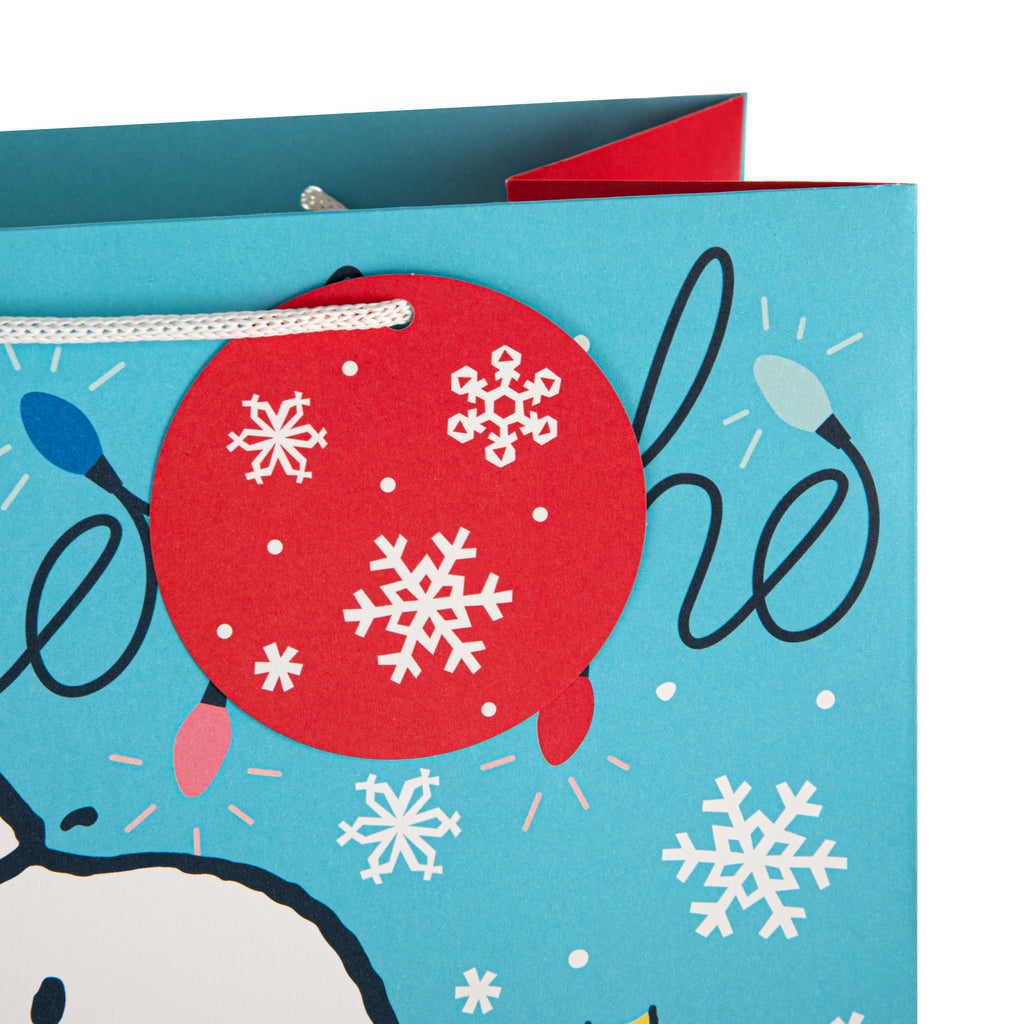 This pack contains 3 large gifts bags in 1 Christmas SNOOPY design, and are the perfect way to deliver their gifts. Each bag features white knitted paper handles, SNOOPY and Woodstock with fairy lights, with the message 'ho ho ho', and each bag comes complete with a round die-cut, red gift tag with a snowflake design.
