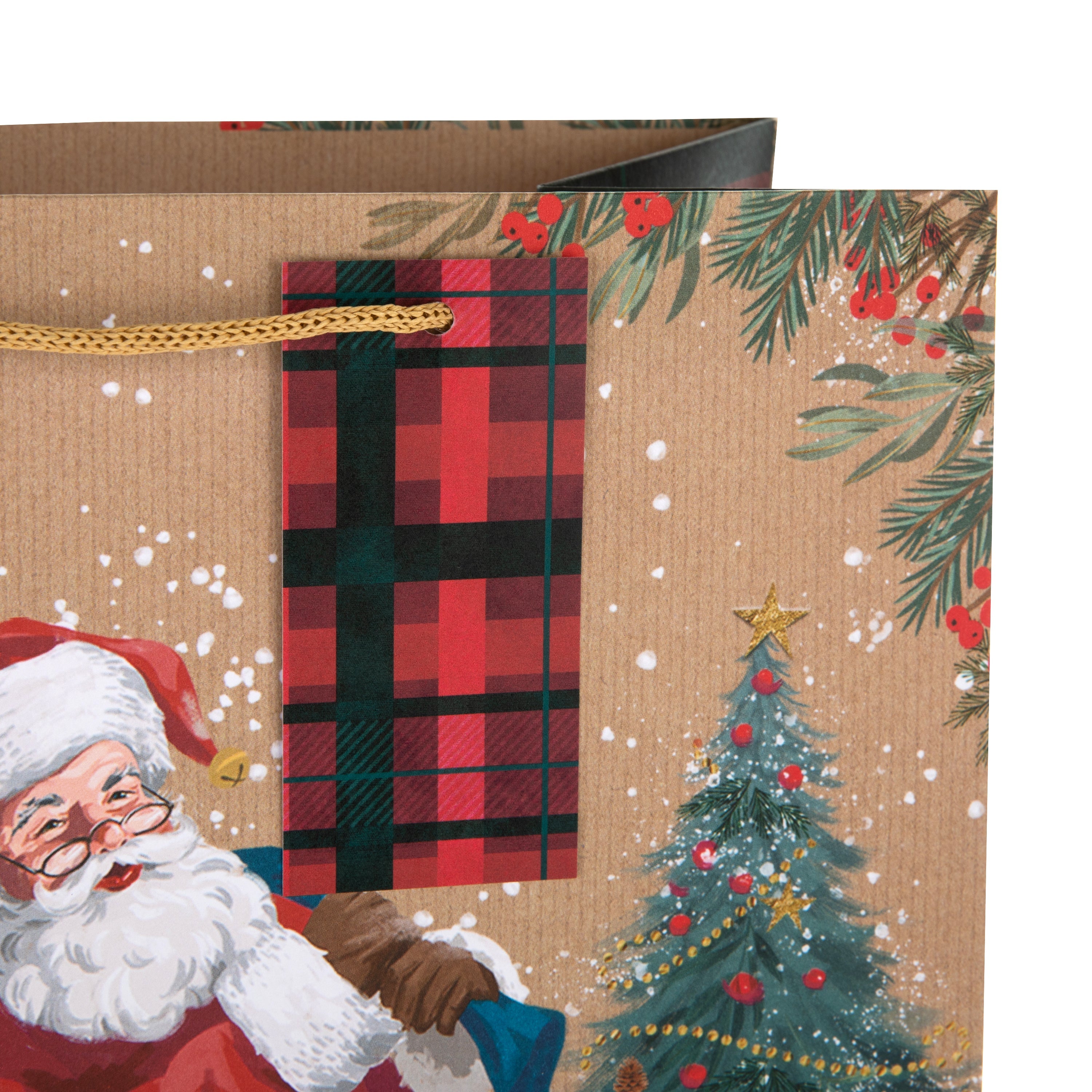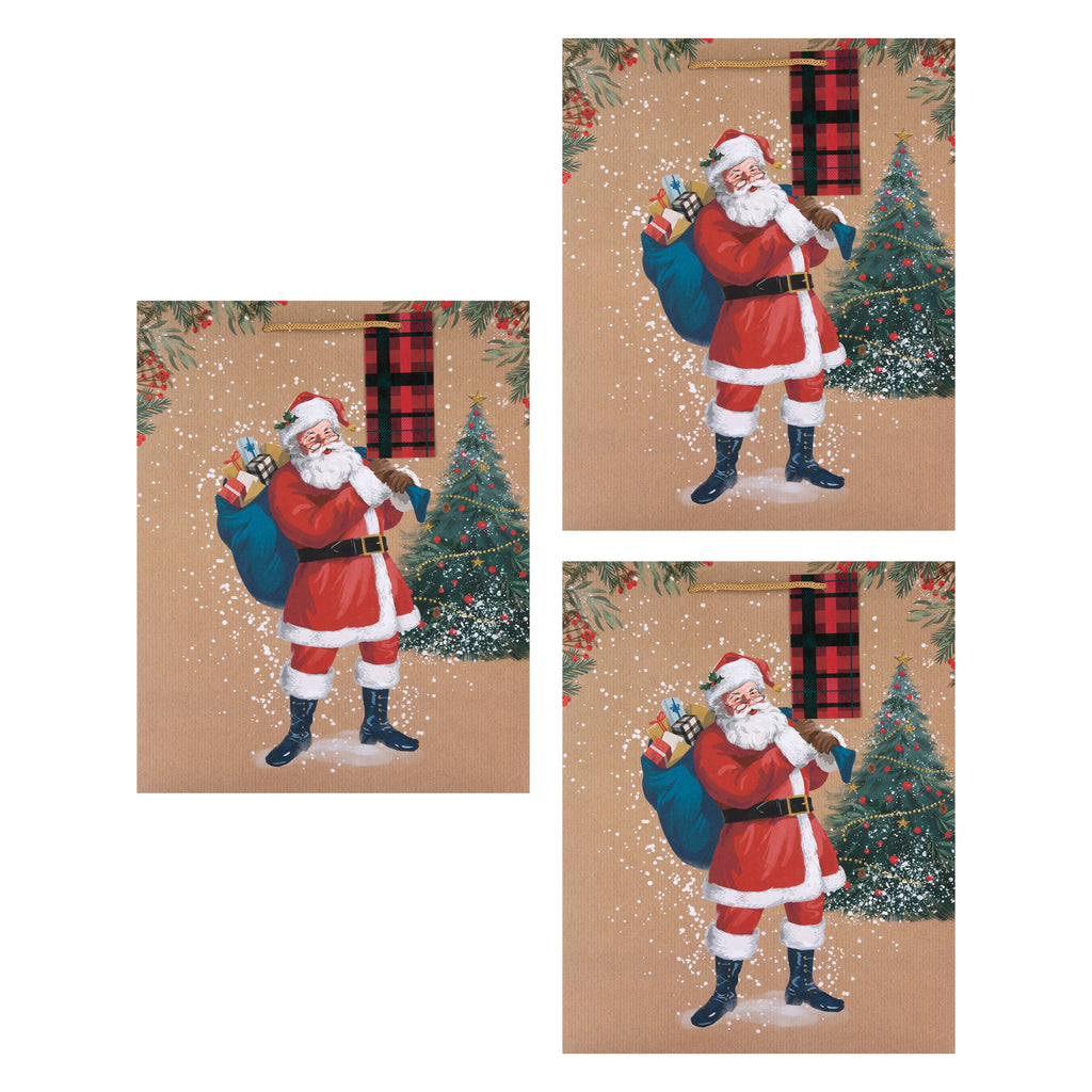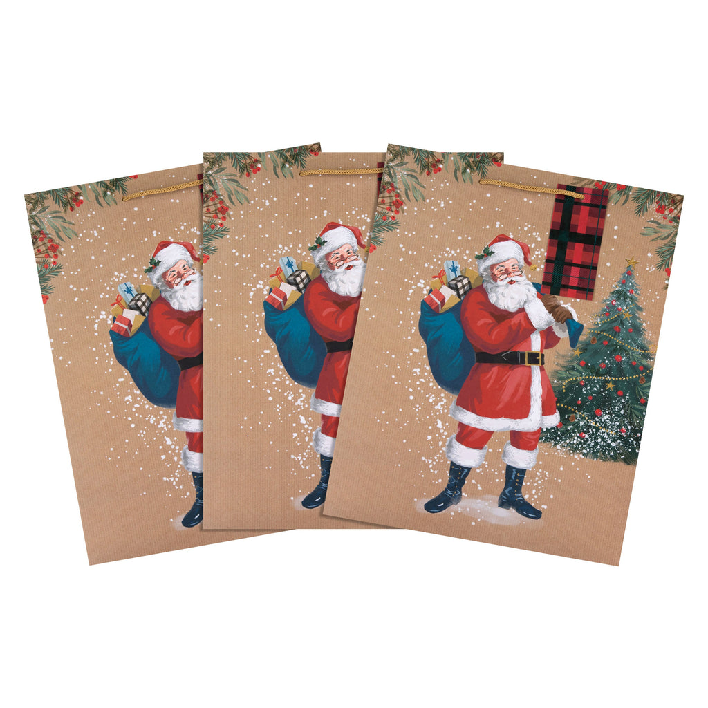 This pack contains 3 large Christmas gift bags in one traditional Father Christmas design. Each bag features a brown kraft background with red tartan sides, a traditional illustration of Santa with his sack next to a decorated Christmas tree with festive foliage and snow flurries, brown knitted paper handles, and traditional red tartan rectangular gift tags.