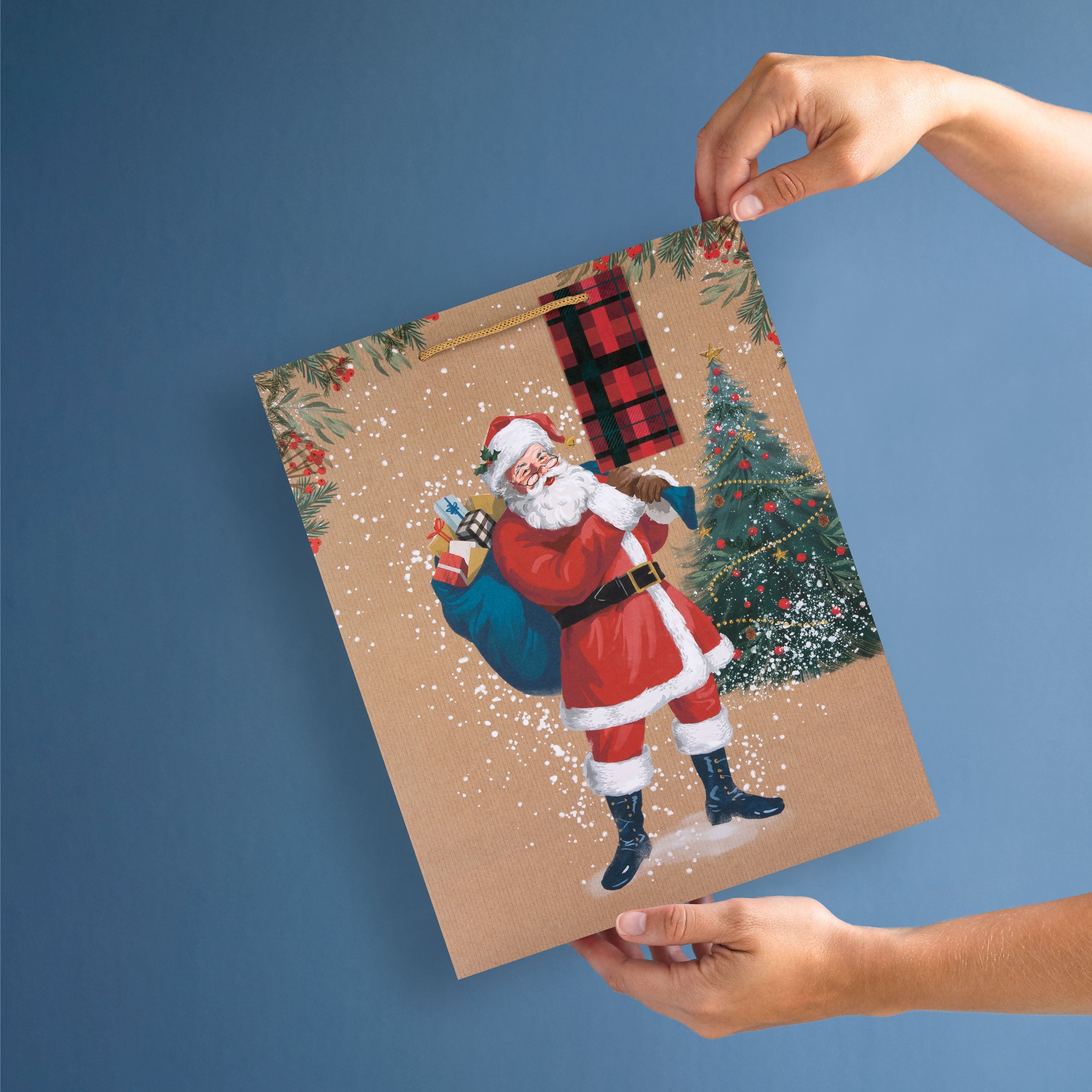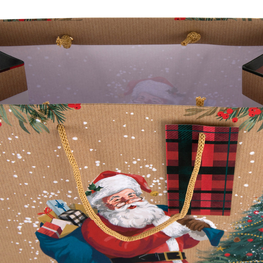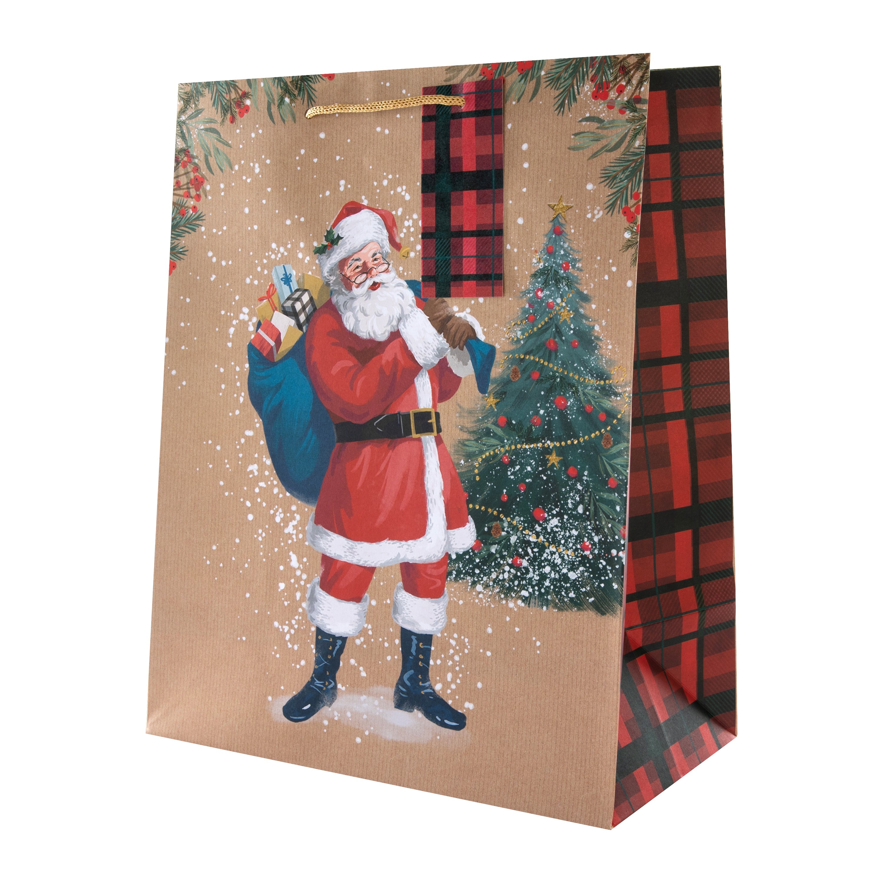 This pack contains 3 large Christmas gift bags in one traditional Father Christmas design. Each bag features a brown kraft background with red tartan sides, a traditional illustration of Santa with his sack next to a decorated Christmas tree with festive foliage and snow flurries, brown knitted paper handles, and traditional red tartan rectangular gift tags.