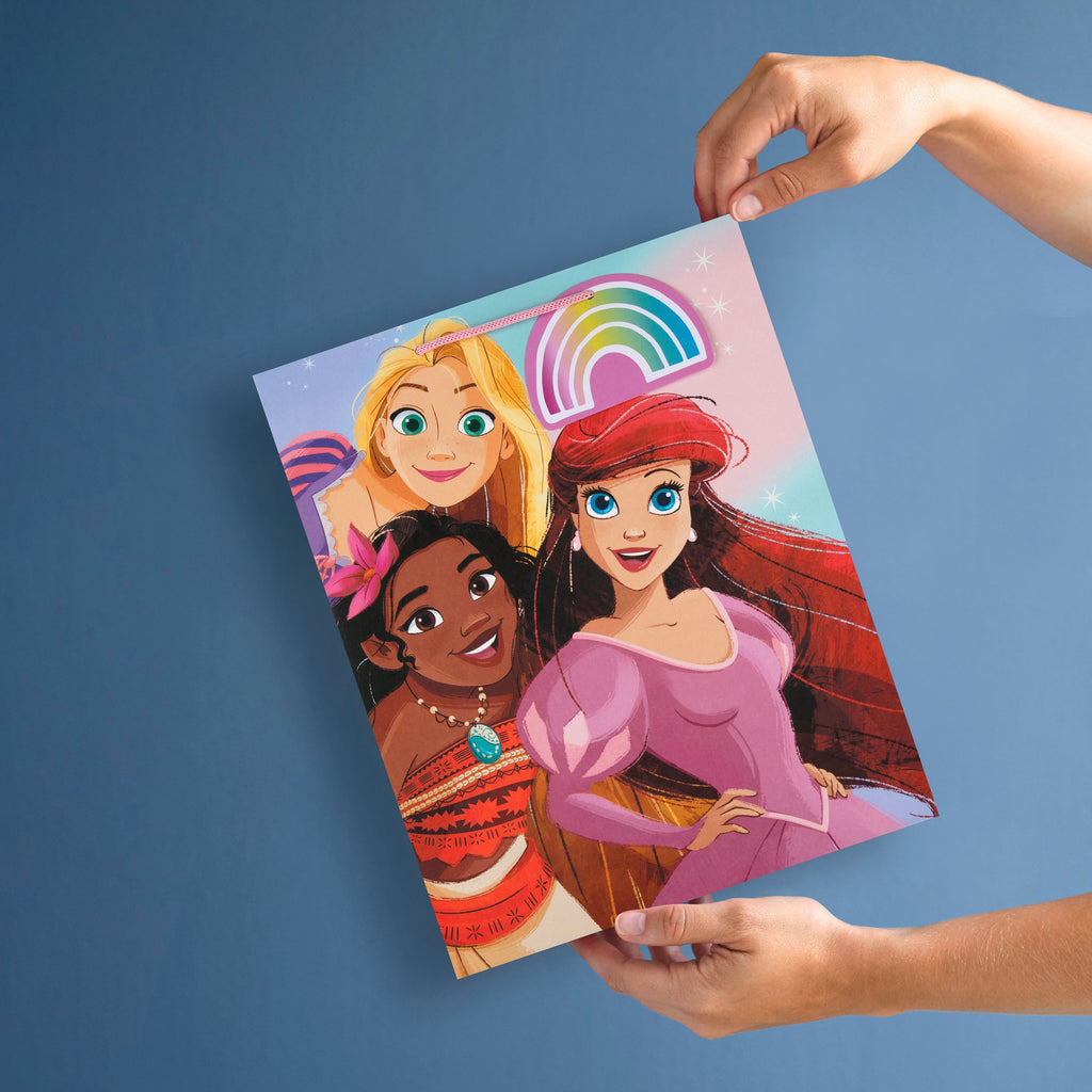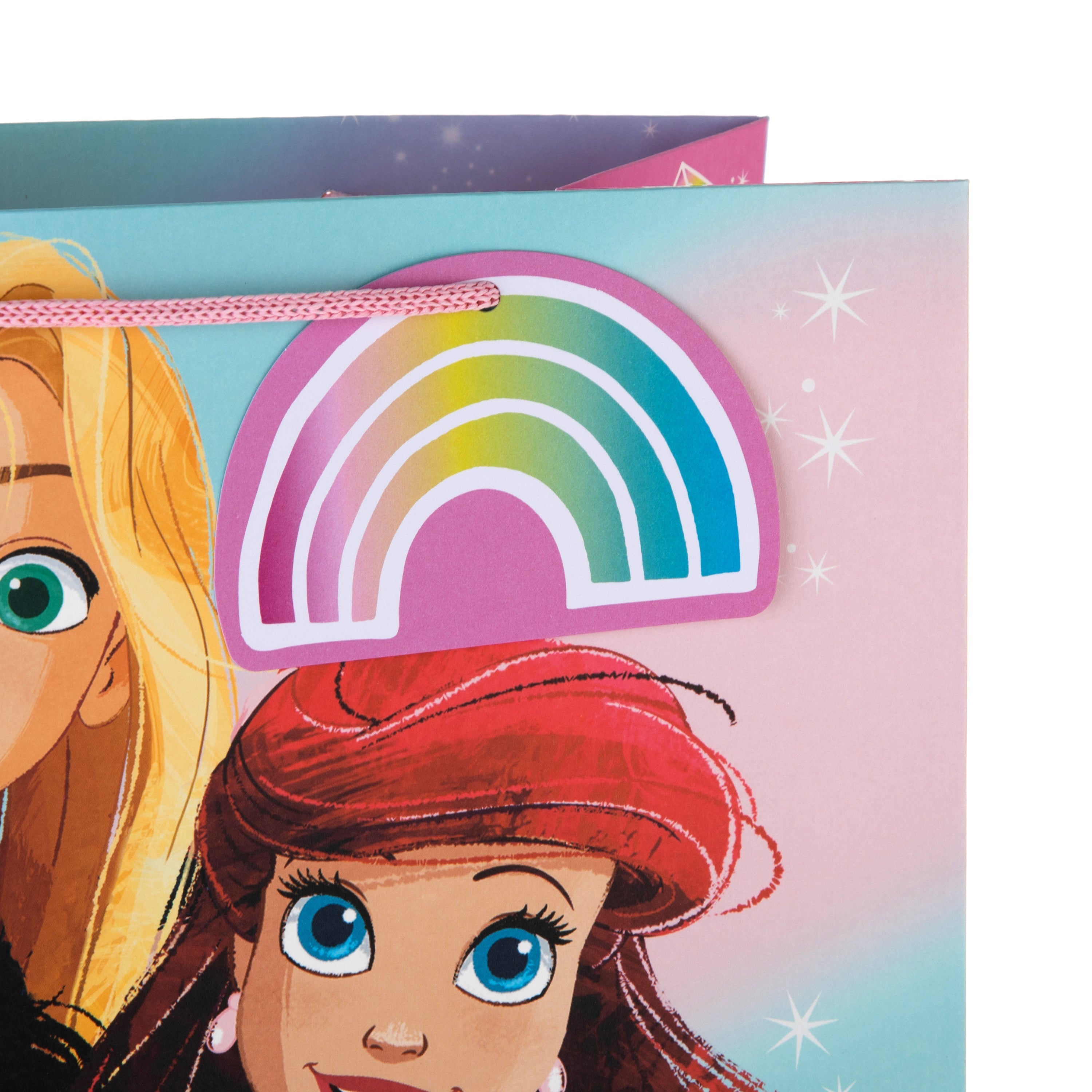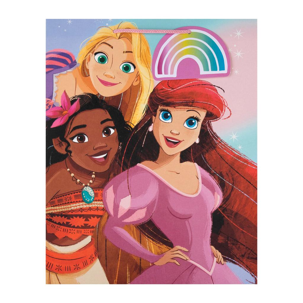 This large bag features an illustrated design on the front and sides, includes the Princesses, Ariel, Moana and Rapunzel. Gift bag also features, pink knitted paper handles and comes complete with a co-ordinating rainbow shaped gift tag.