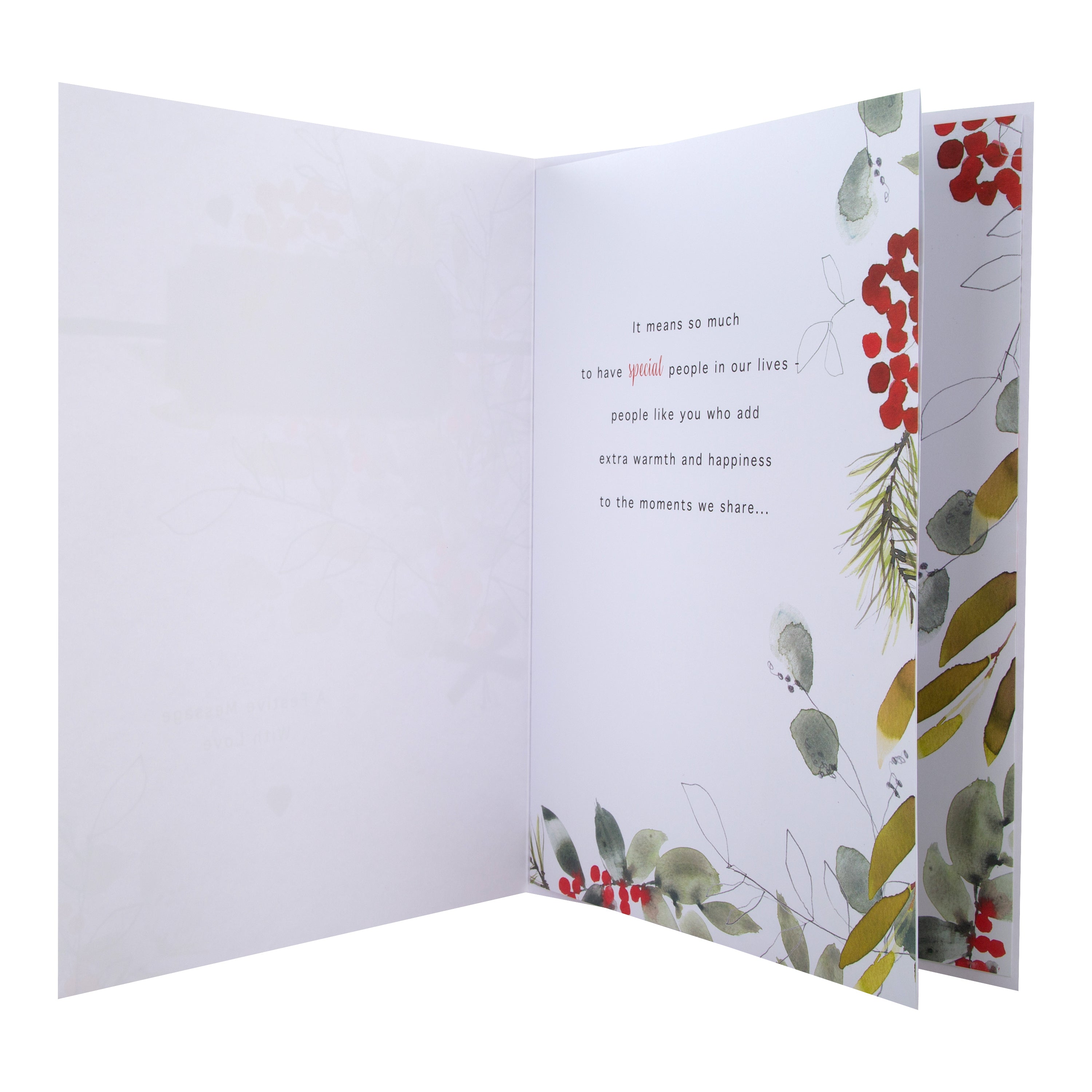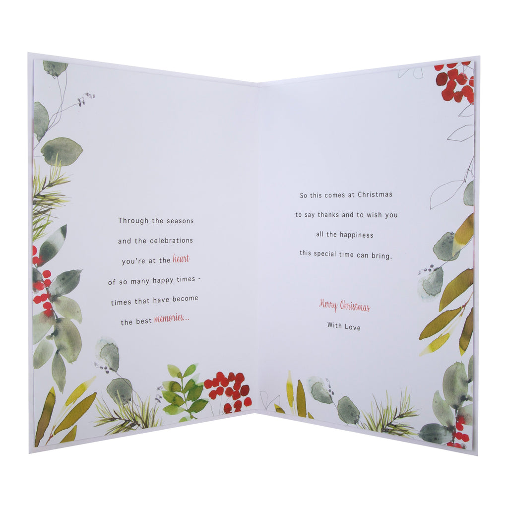 Message Inside Card Reads: It means so much to have special people in our lives - people like you who add extra warmth and happiness to the moments we share... Through the seasons and the celebrations you're at the heart of so many happy times - times that have become the best memories... So this comes at Christmas to say thanks and to wish you all the happiness this special time can bring. Merry Christmas With Love
