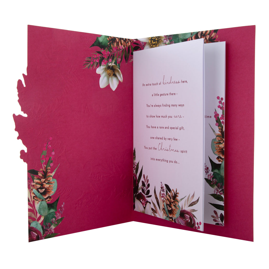 Message Inside Card Reads: An extra touch of kindness here, a little gesture there - You're always finding many ways to show how much you care - You have a rare and special gift, one shared by very few - You put the Christmas spirit into everything you do... You bring a world of happiness everywhere you go - It's no wonder you mean such a lot to everyone you know... So hope the festive season's filled with laughter, fun and love - For that's the kind of Christmas time you're so deserving of. Have a very Happy Christmas