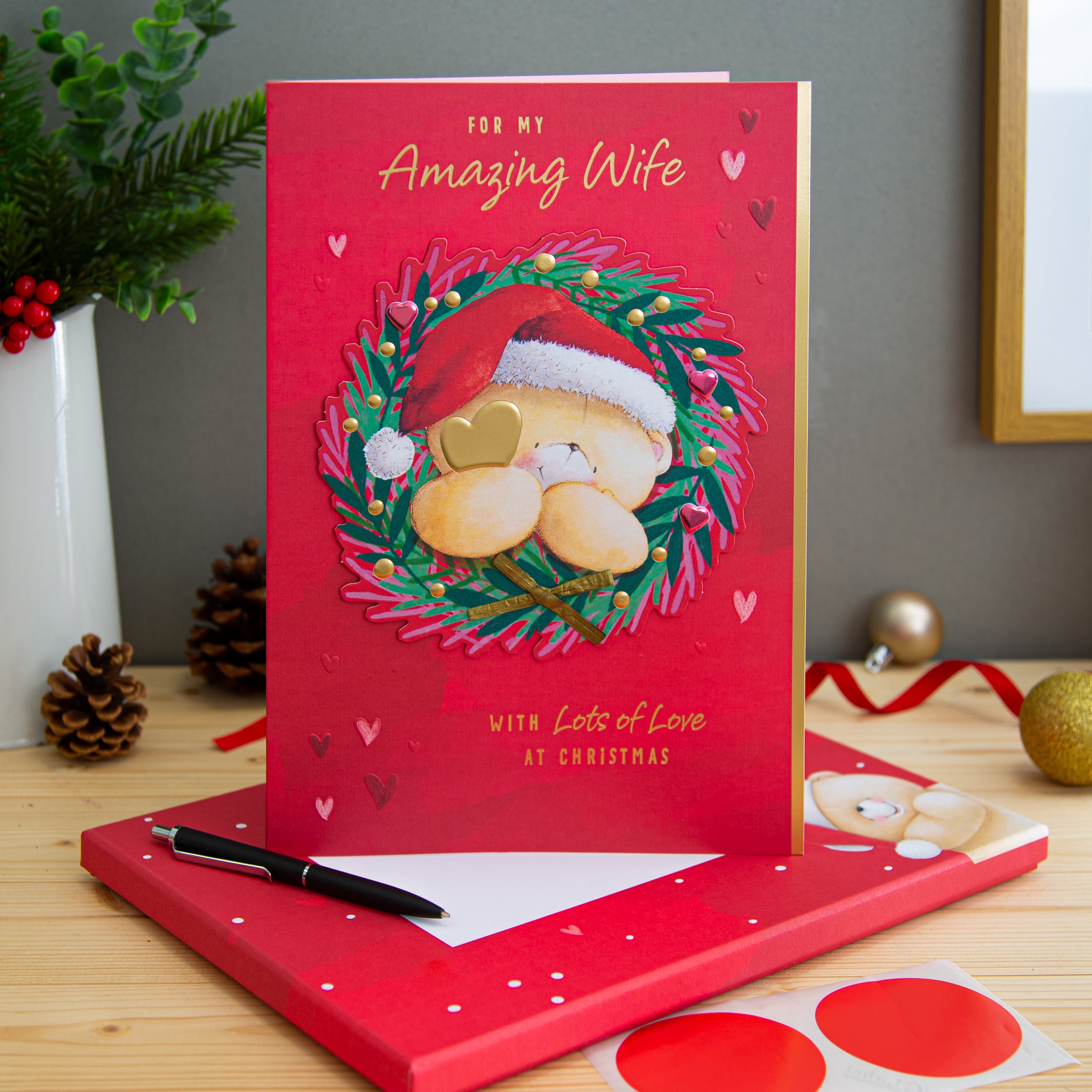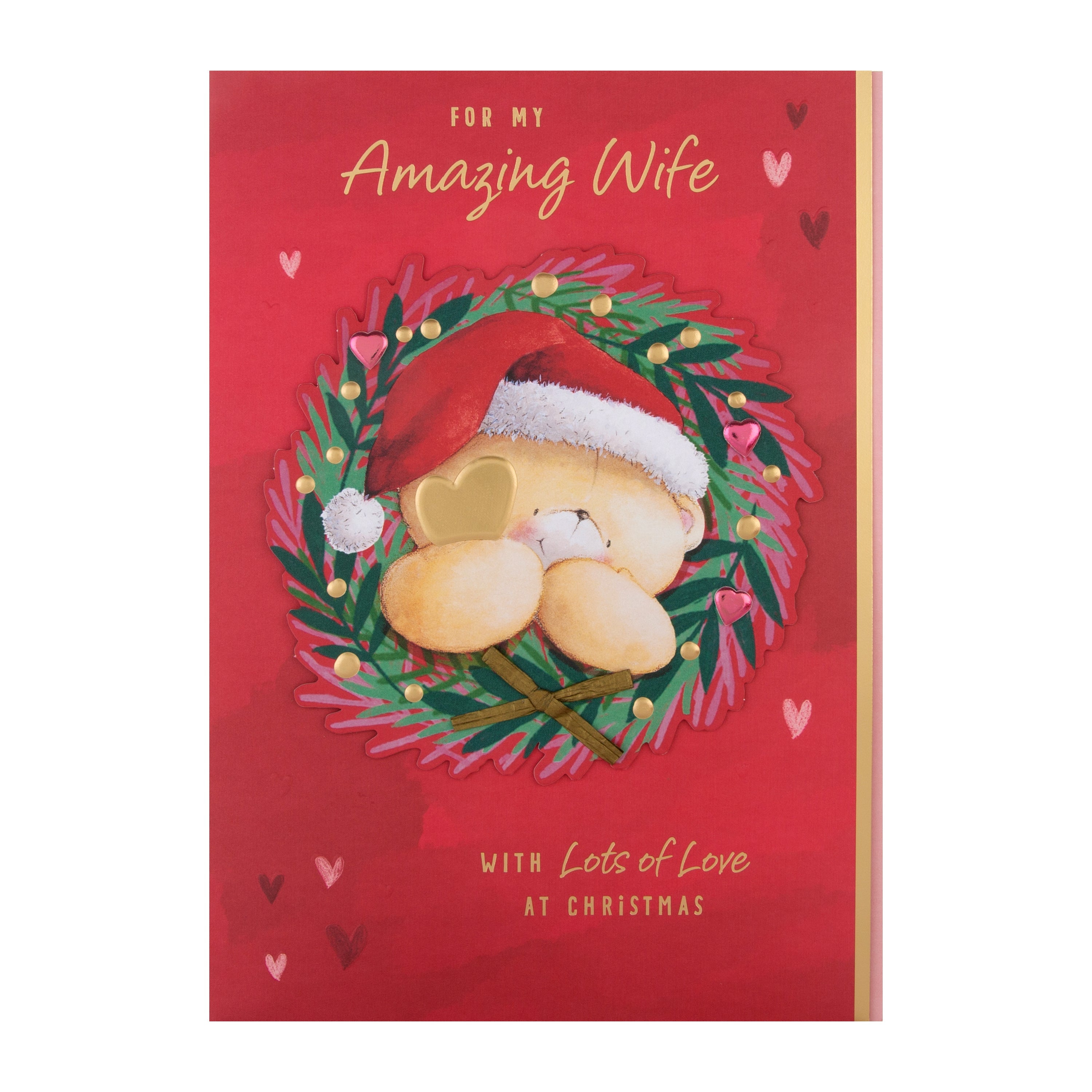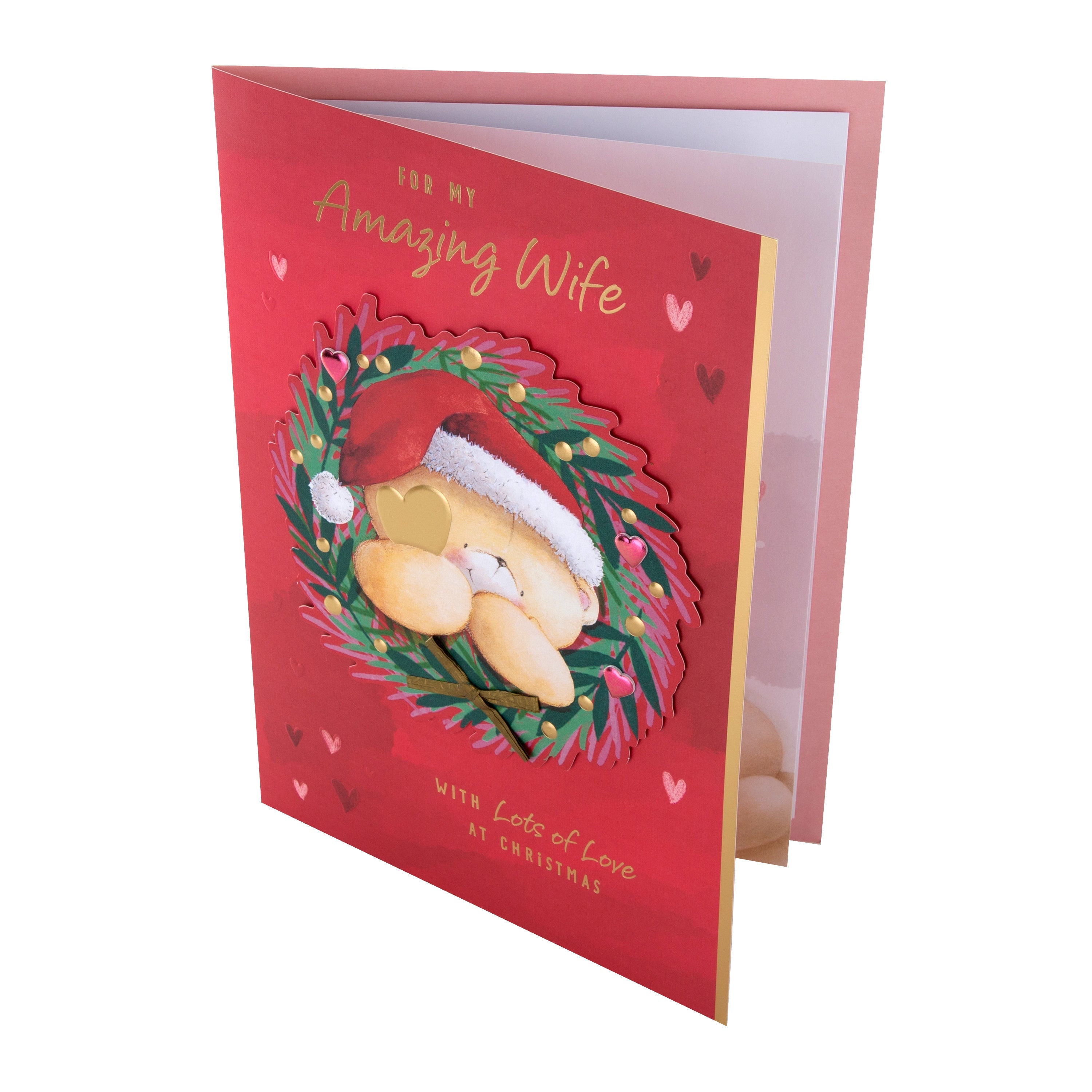 Large Luxury Boxed Christmas Card for Wife - Cute Forever Friends Bear in Wreath Design