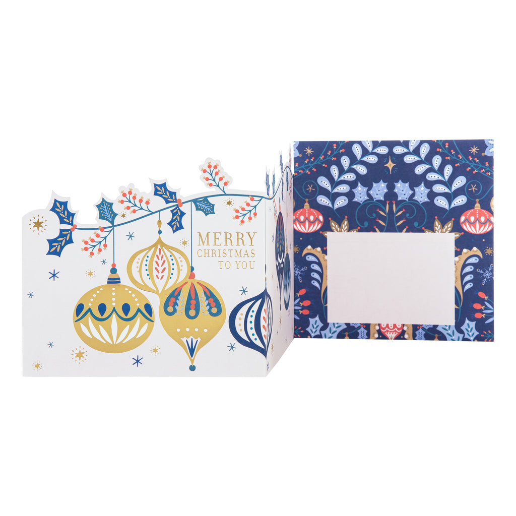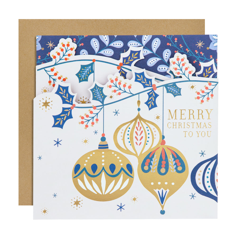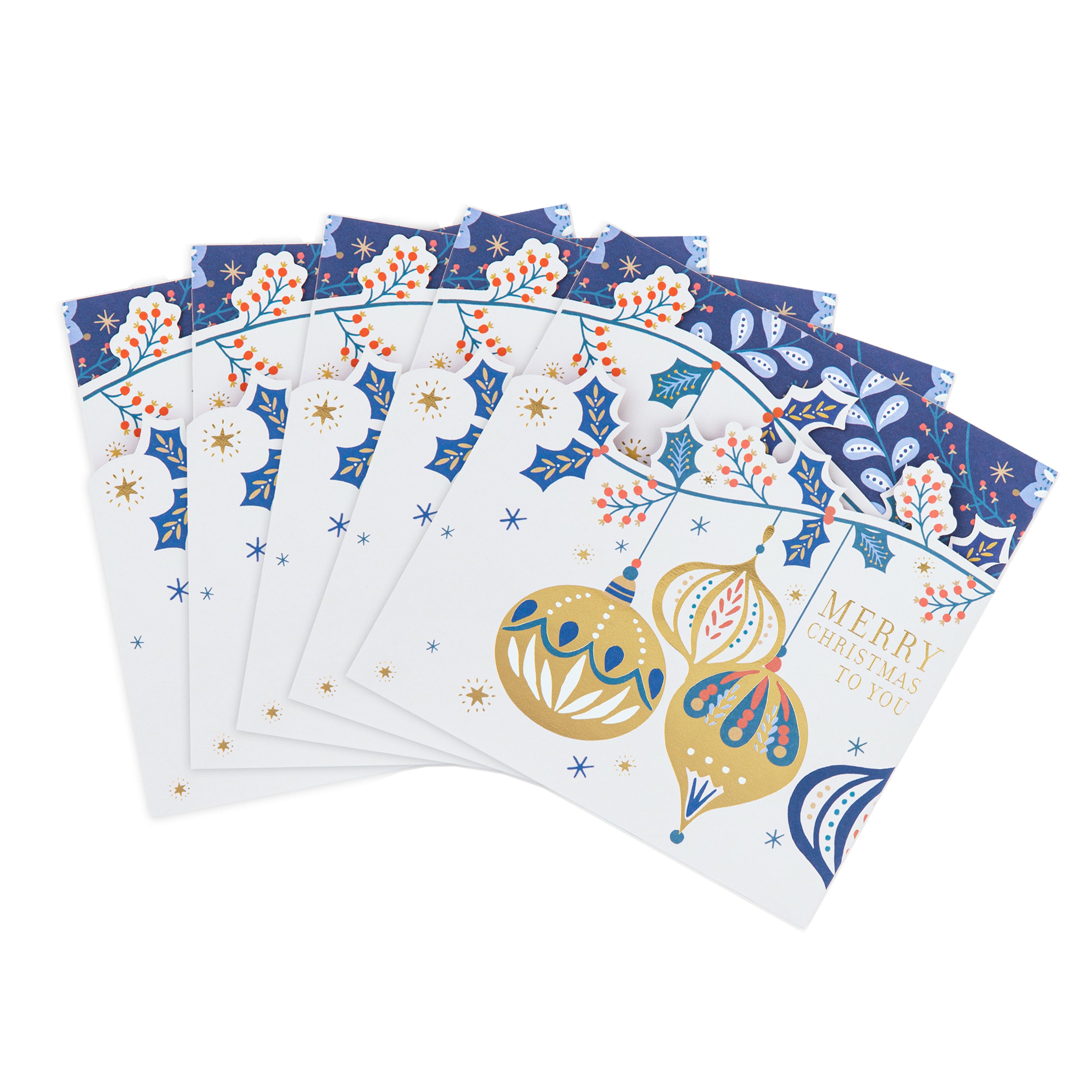 Printed on high-quality board, this pack of 5 luxury Christmas cards come in 1 festive bauble design. Each card unfolds into tri-fold design and features the message 'Merry Christmas to you' on the front, metallic gold foil details, die-cut details and every card comes complete with a co-ordinating Hallmark branded, gold envelope.