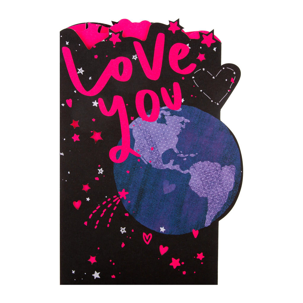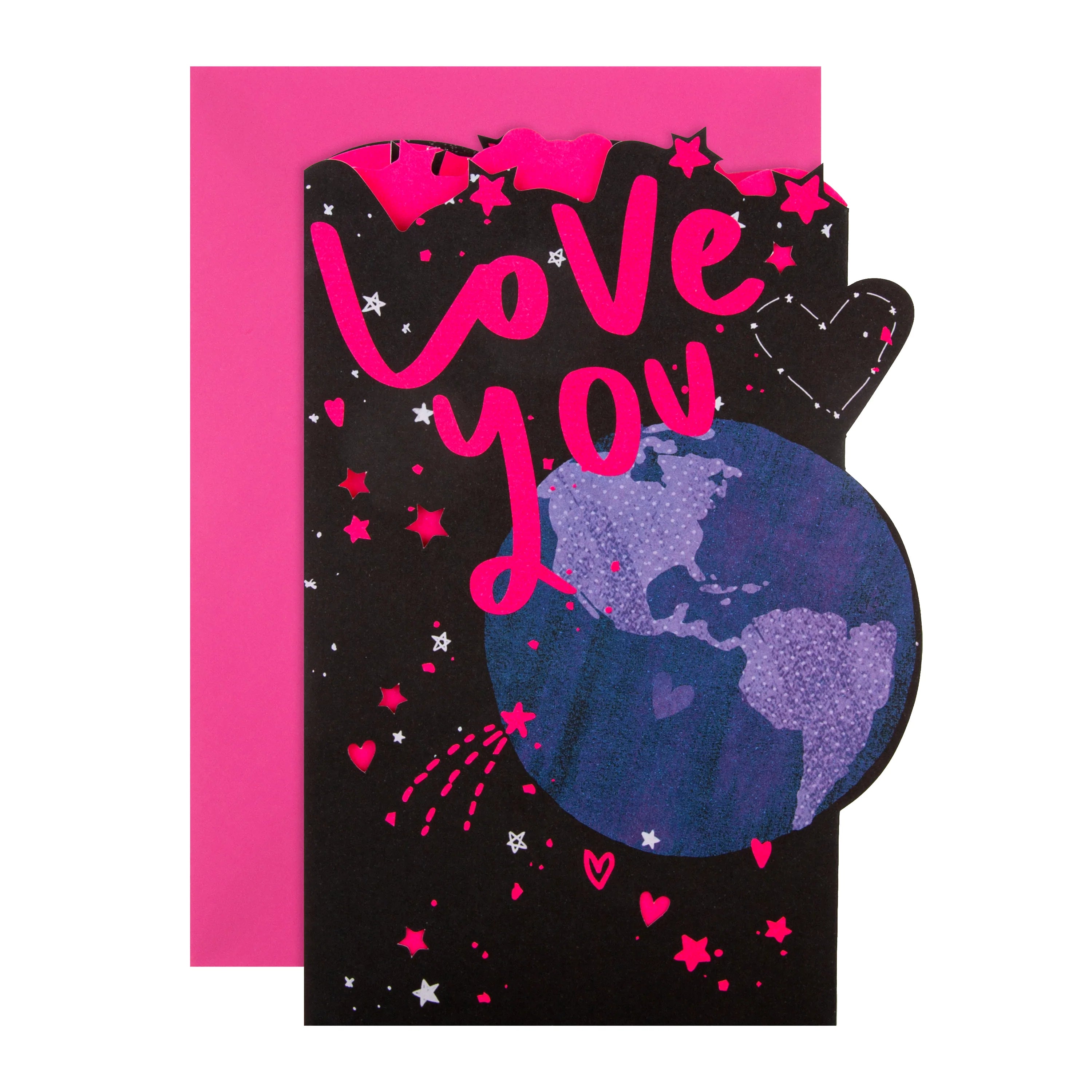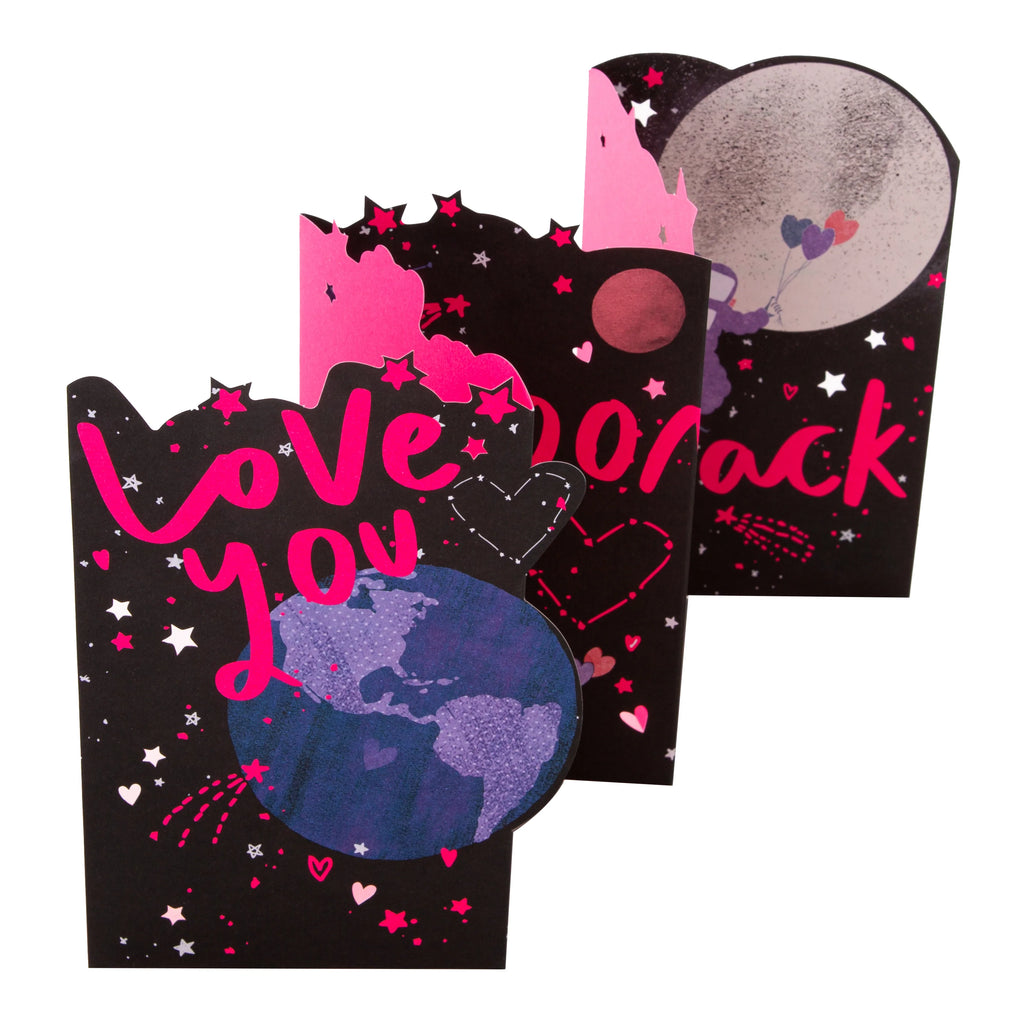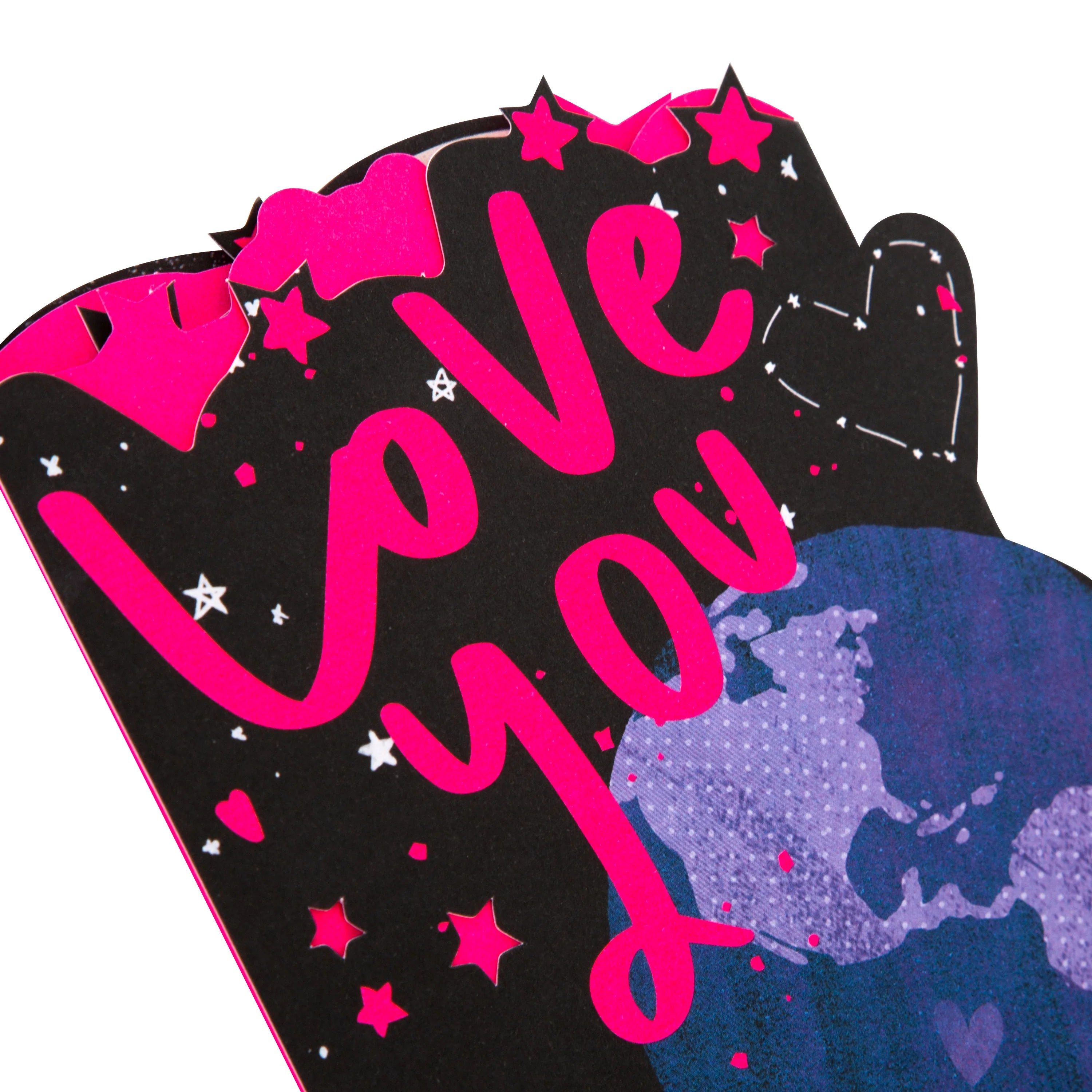 Printed on high-quality board, this card pulls put and reads 'to the moon and back' in big letters, die cut details and comes complete with a co-ordinating pink, Hallmark branded envelope.