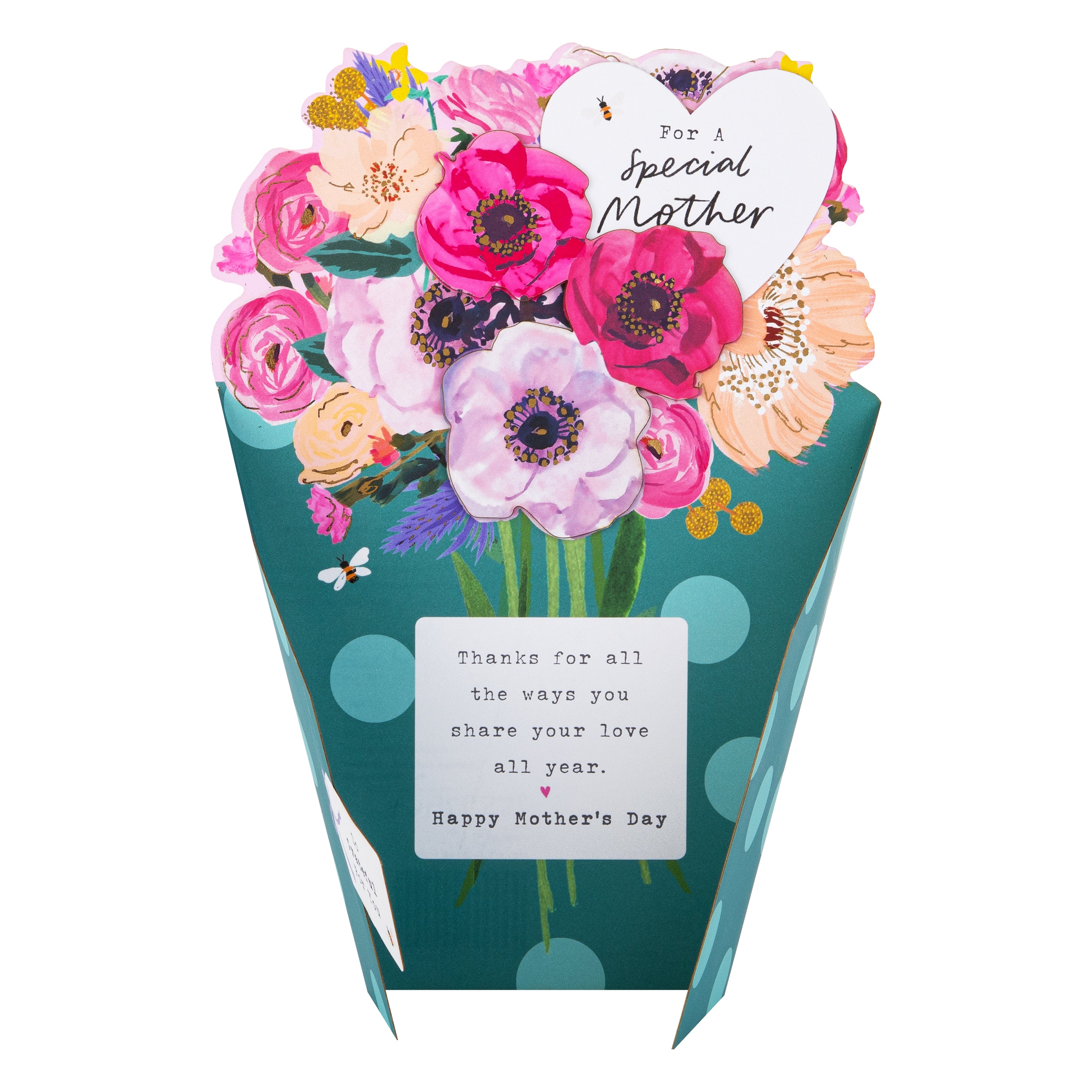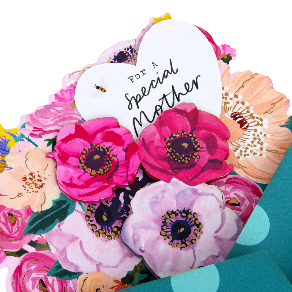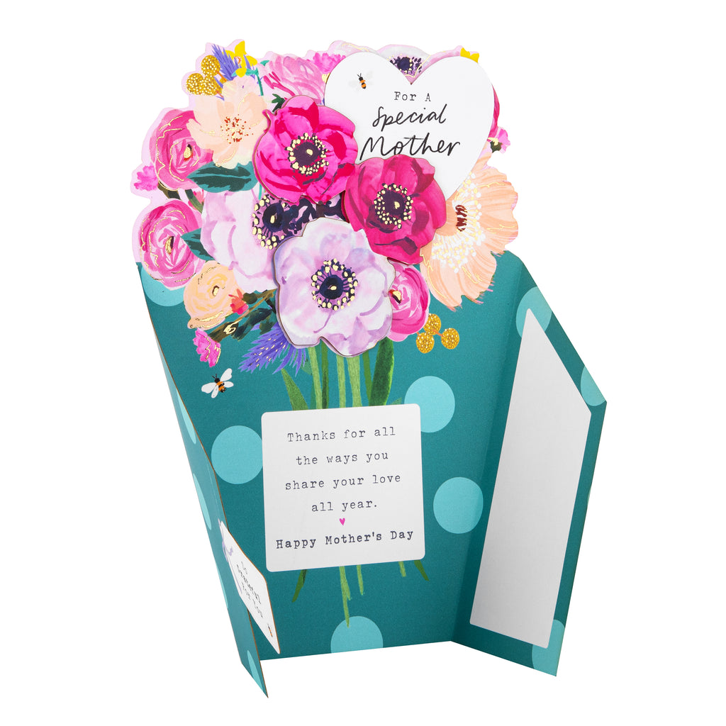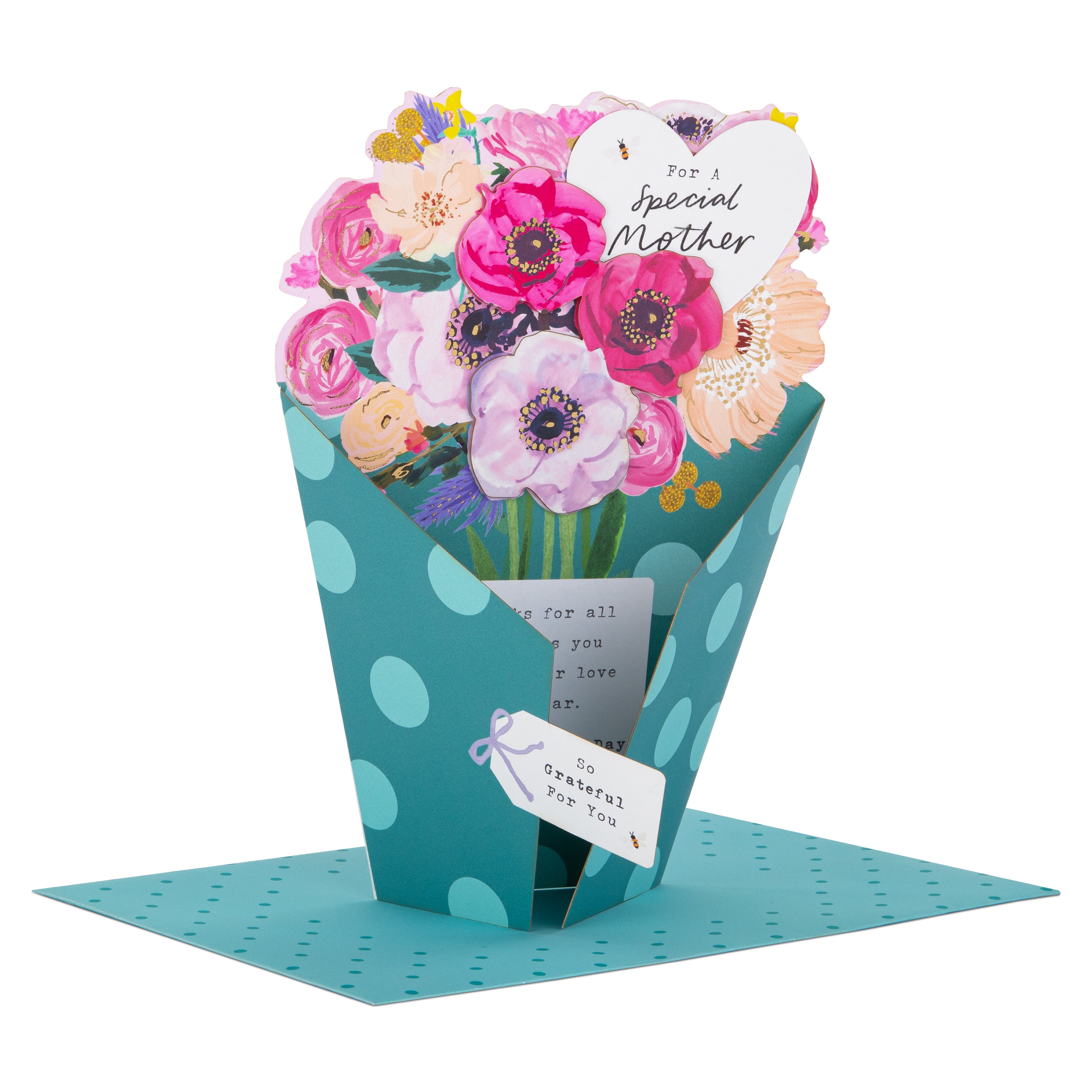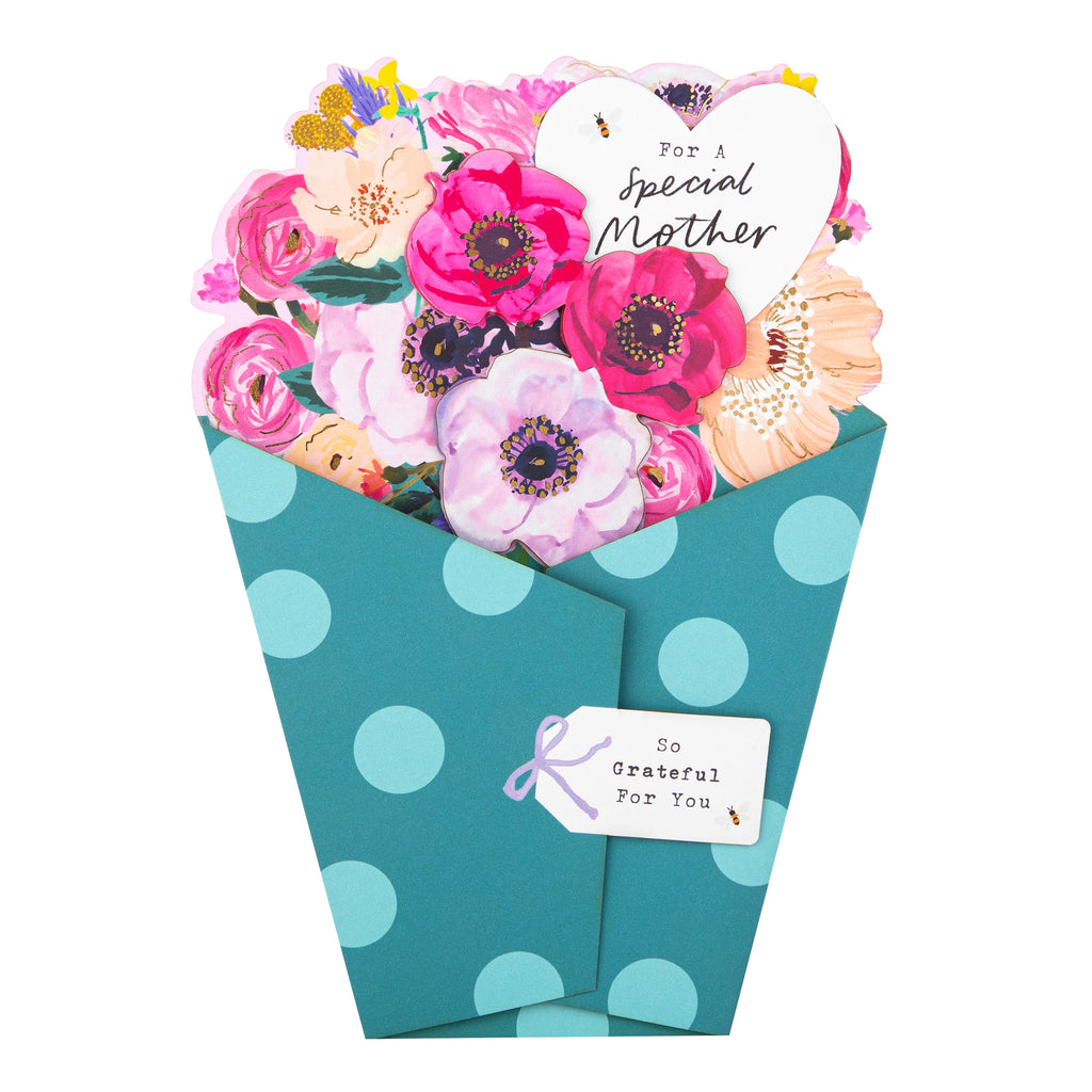 Printed on high-quality board, this Mother's day card features a bouquet of flowers, metallic gold foil details, die-cut details, 3D attachment, with the message 'For a special mother, so grateful for you' on the front. This card comes complete with a Hallmark branded, turquoise patterned envelope.