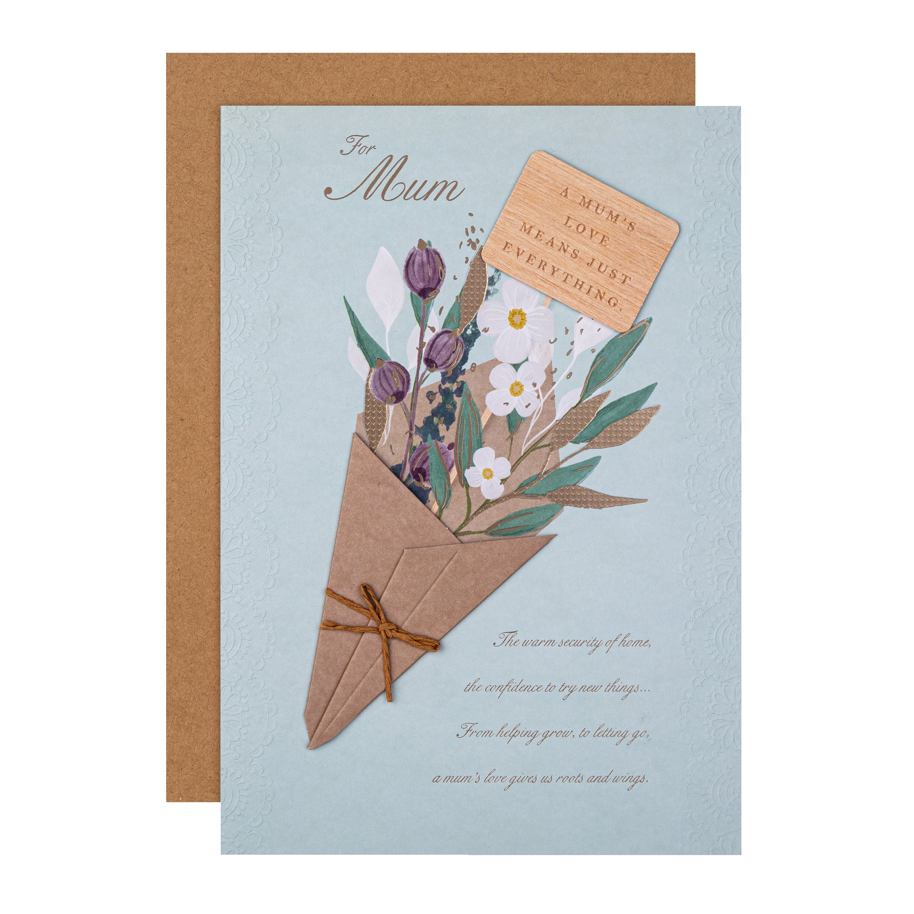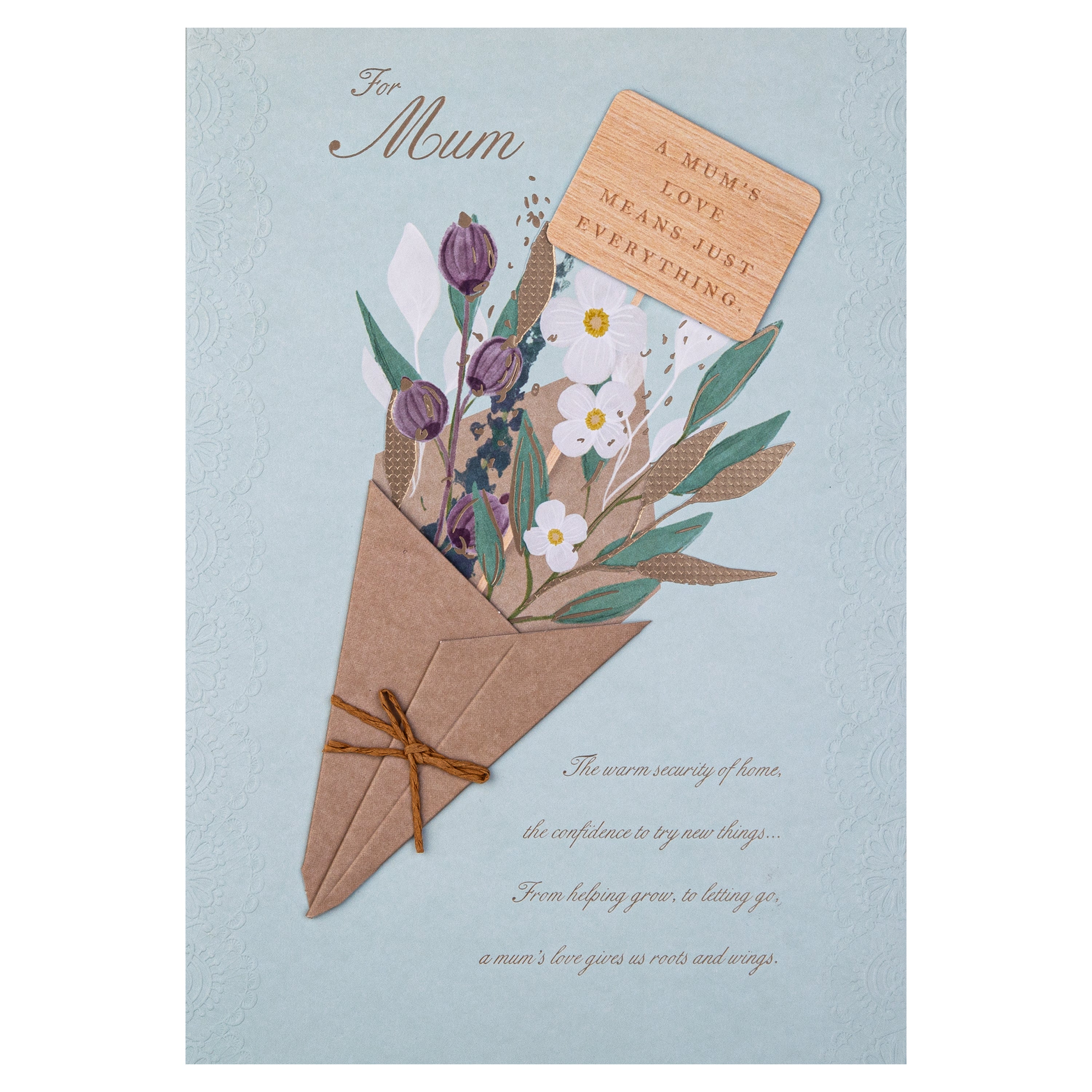 Printed on high-quality board, this card features a flower bouquet design, die-cut details, 3D attachment, metallic gold satin foil details, embossed elements, kraft paper twine bow attachment, and the message 'For Mum. The warm security of home, the confidence to try new things... From helping grow, to letting go, a mum's love gives us roots and wings. A mum's love means just everything' on the front. This card comes complete with a co-ordinating Hallmark branded, brown kraft envelope.