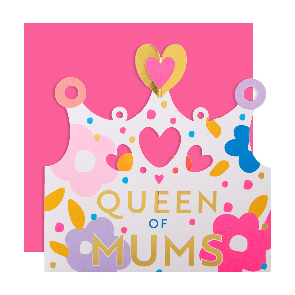 Printed on high-quality board, this card folds into a wearable crown for the Queen of Mums, a die cut design, metallic gold foil details, and comes complete with a co-ordinating Hallmark branded, pink envelope.