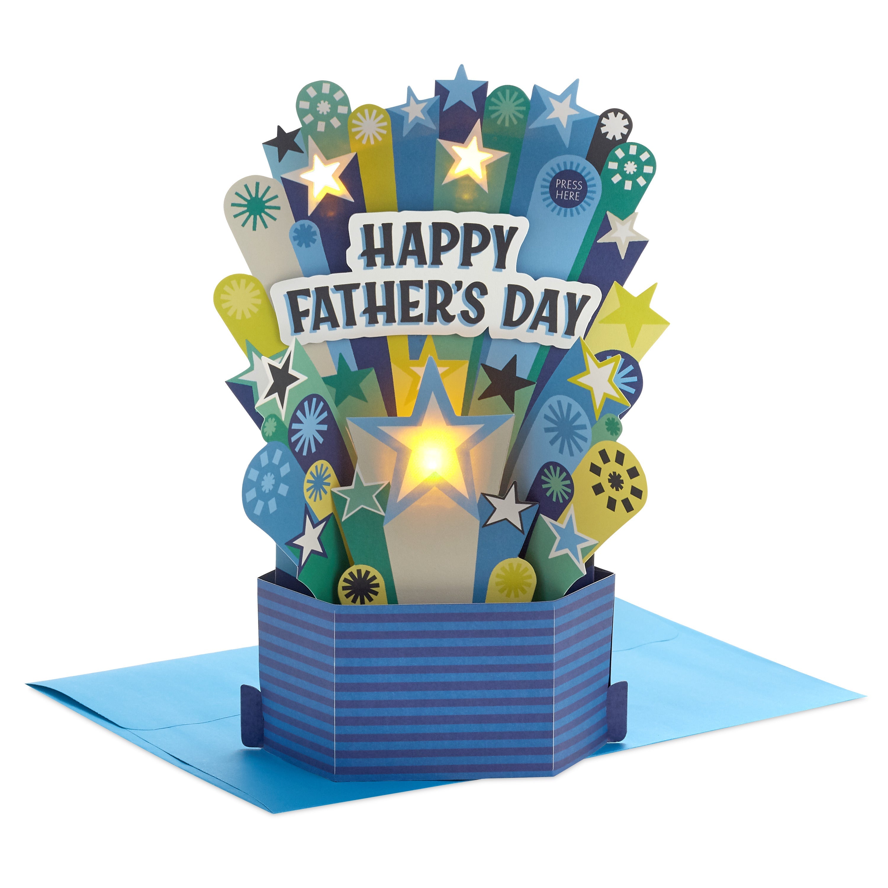 Printed on high quality board, this Father's day card pops up into a 3D diorama of a Father's Day banner. This card features light up and musical features when the button is pressed with blue, green and yellow stars, the message 'Happy Father's Day' on the front and comes complete with a Hallmark branded, blue envelope. Pull down on sides of the pop-up card and push up base to pop it open and lock into place for display—no assembly required.