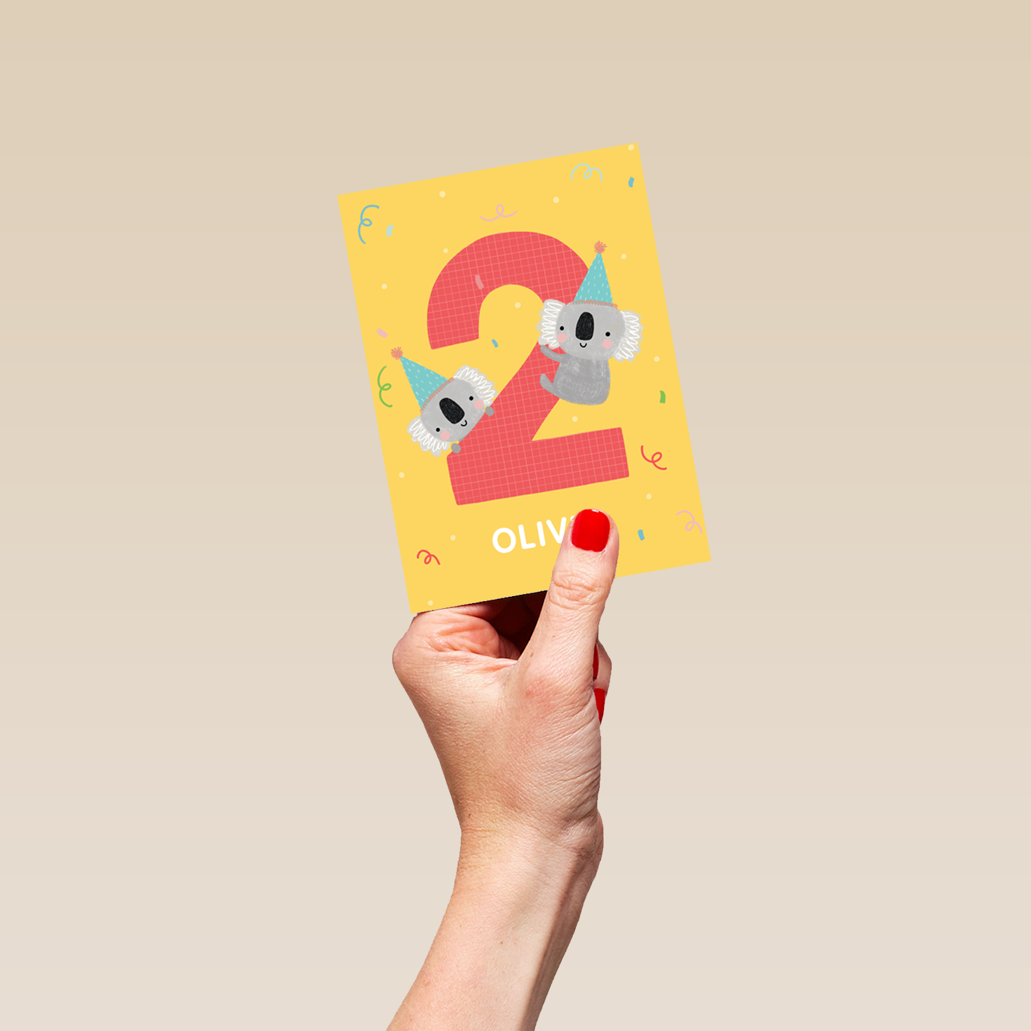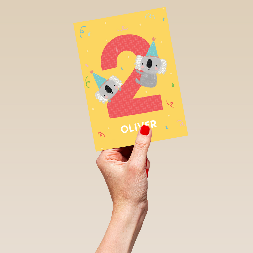 Printed on premium-quality board, this card features a red number two on a yellow background, with confetti falling and koala bears wearing party hats, space to personalise a name, and comes complete with a co-ordinating white envelope.