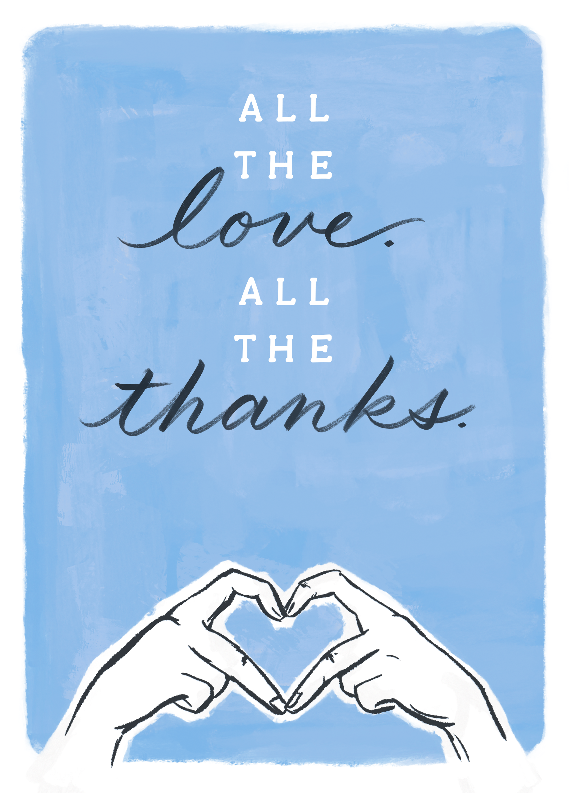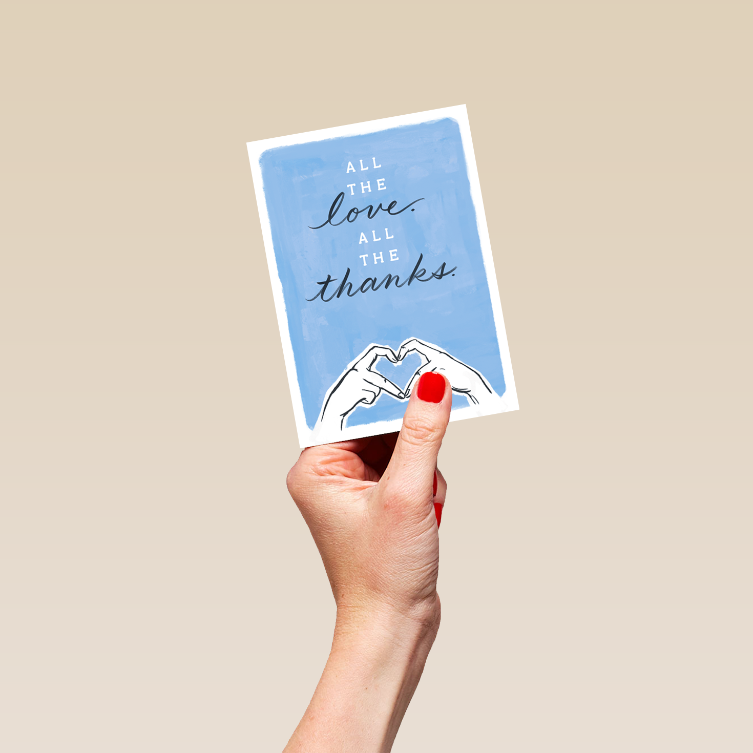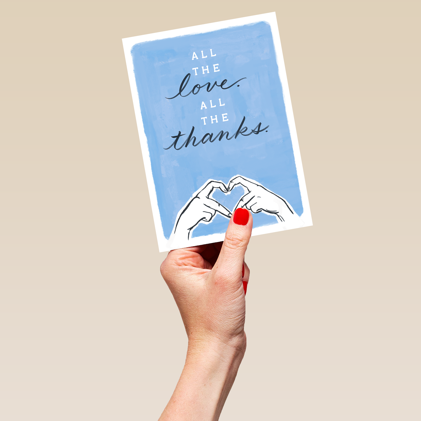 Printed on premium-quality board, this card features an illustrated pair of hands making a heart shape with the fingers is shown against a sky blue background below black and white lettering, with the message 'All the love. All the thanks.', and comes complete with a co-ordinating white envelope.