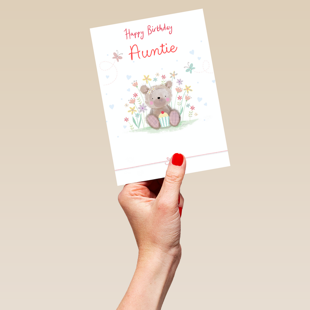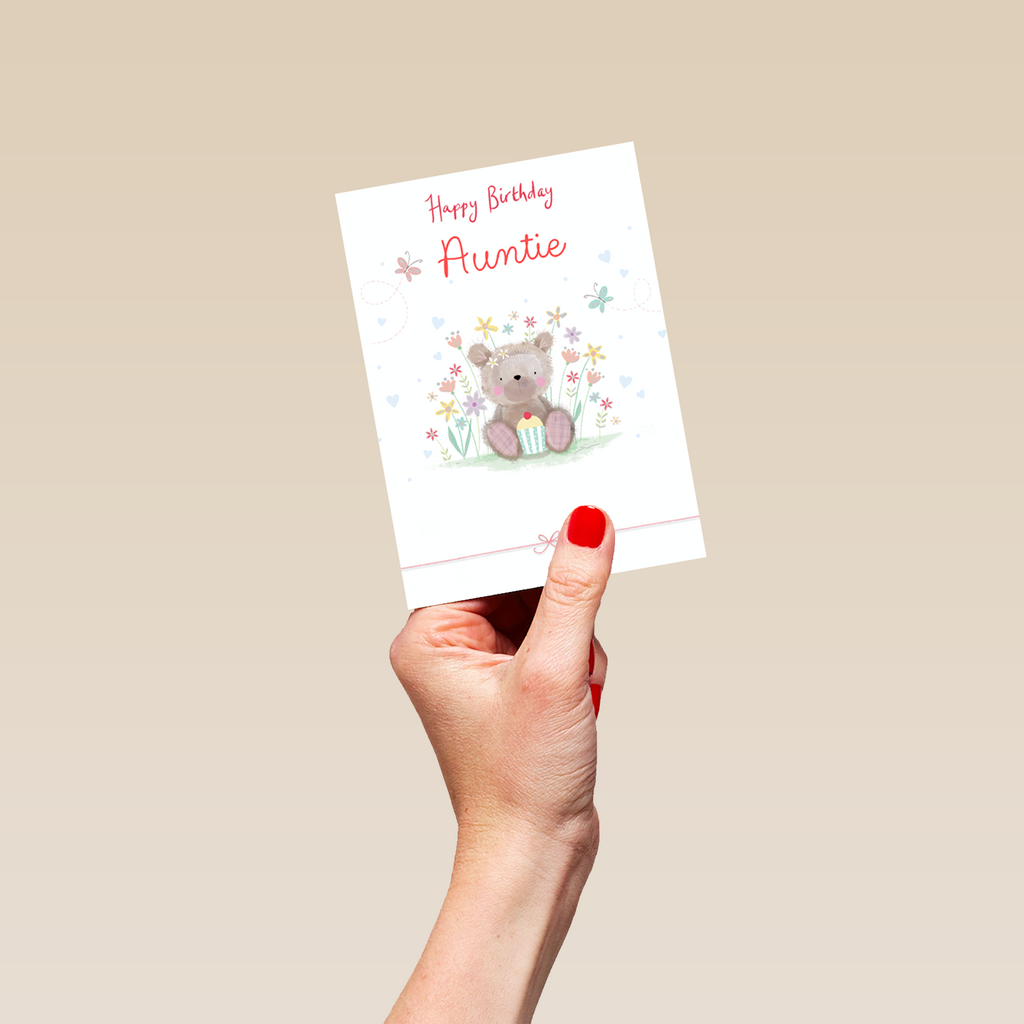 Show them you care with a personalised auntie cute teddy bear card from Hallmark. Our birthday cards are printed on premium quality, FSC®-certified card & delivered nationwide. This card is available as standard 12cm by 16.7cm and large 15.5cm by 21.6cm.