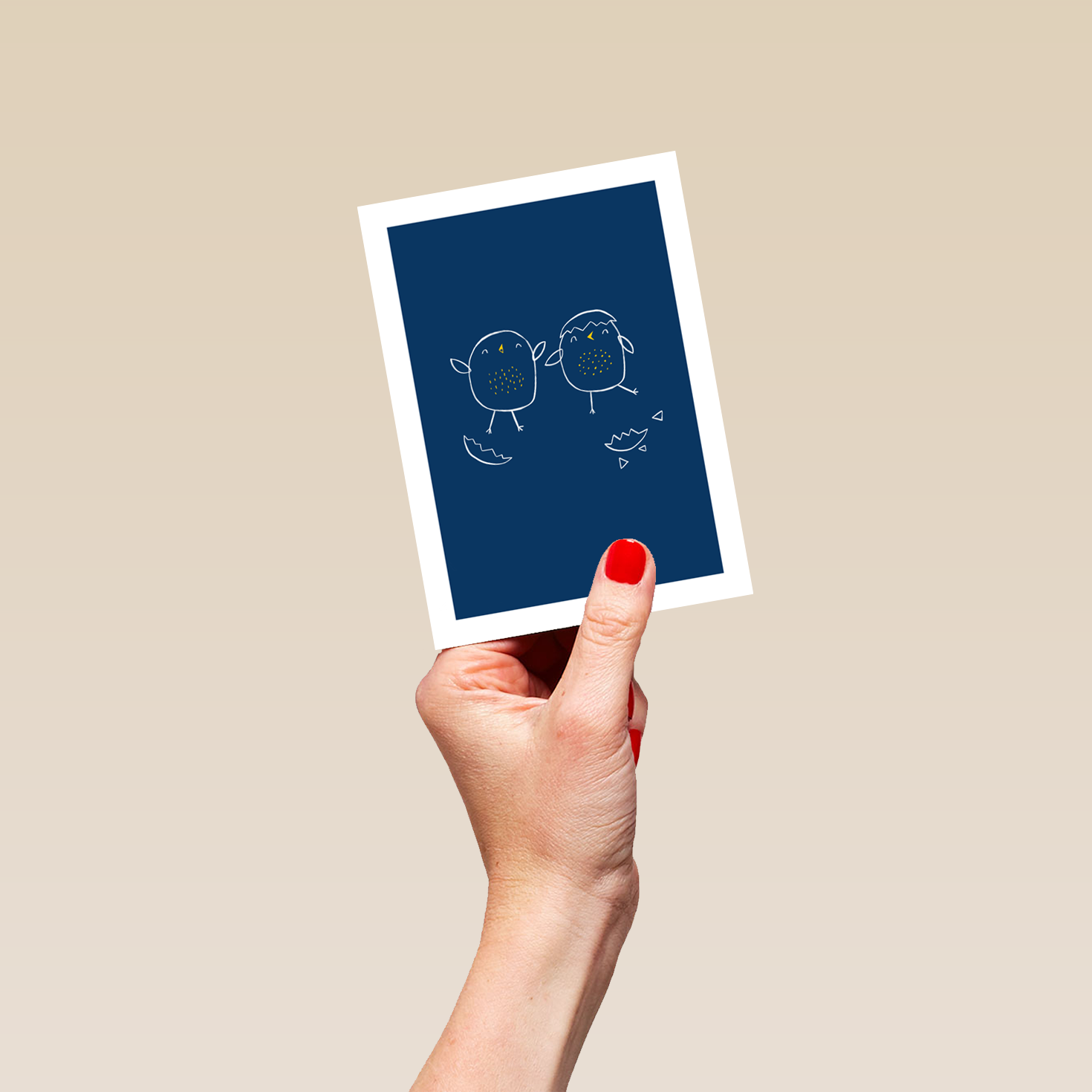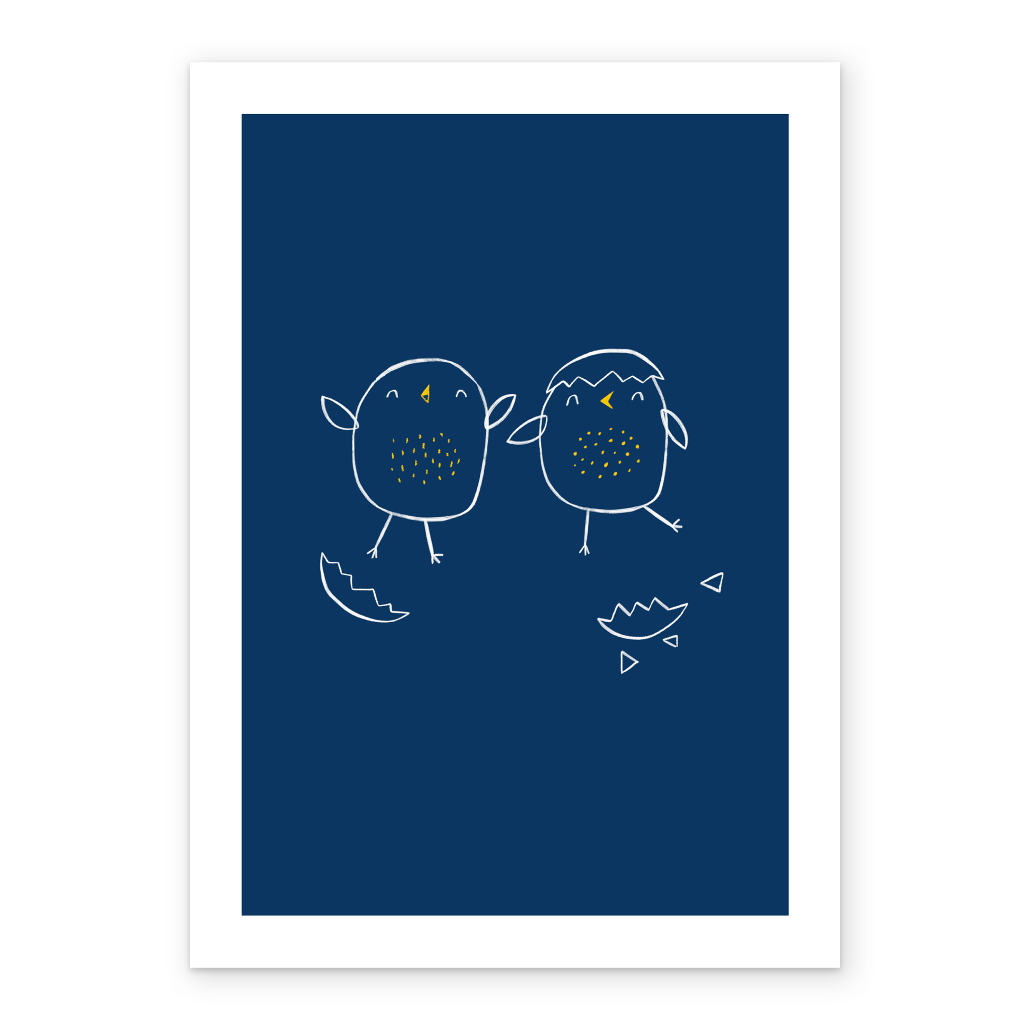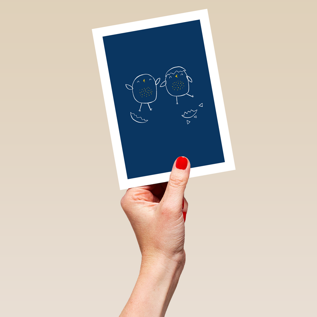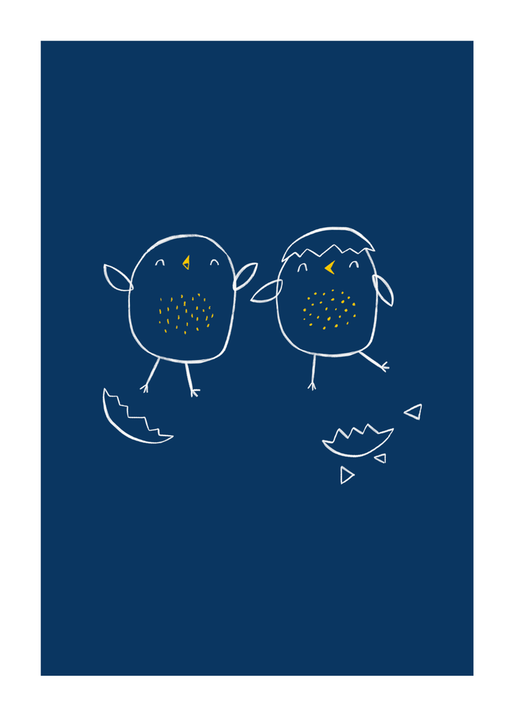 Printed on premium-quality board, this card features 2 cute illustrated newly hatched chicks, in a white-outline style on a dark blue background with a white border, and comes complete with a co-ordinating white envelope.
