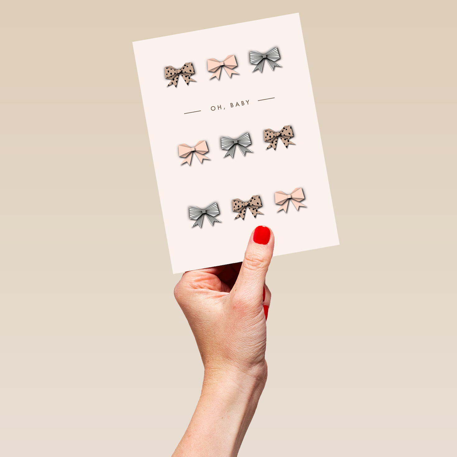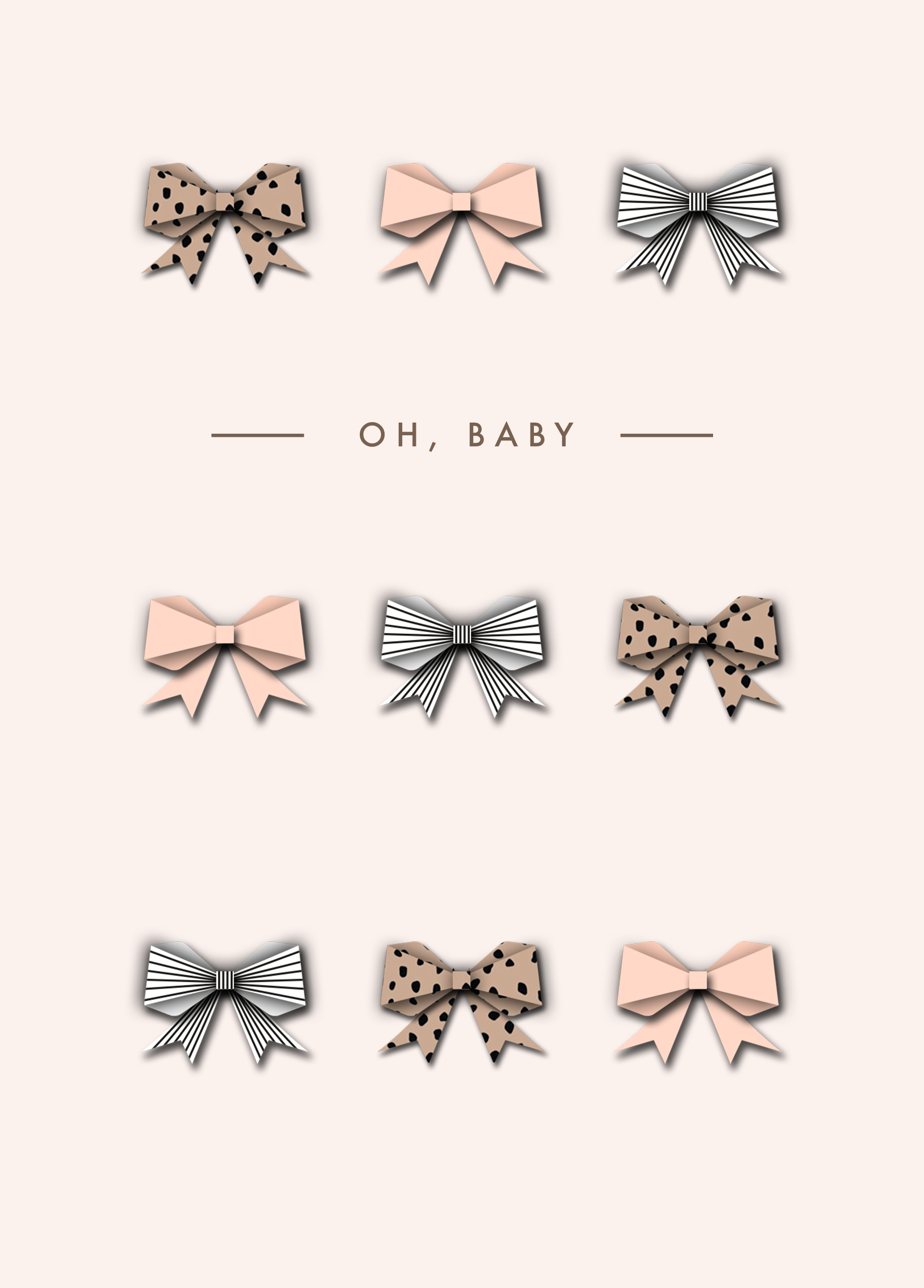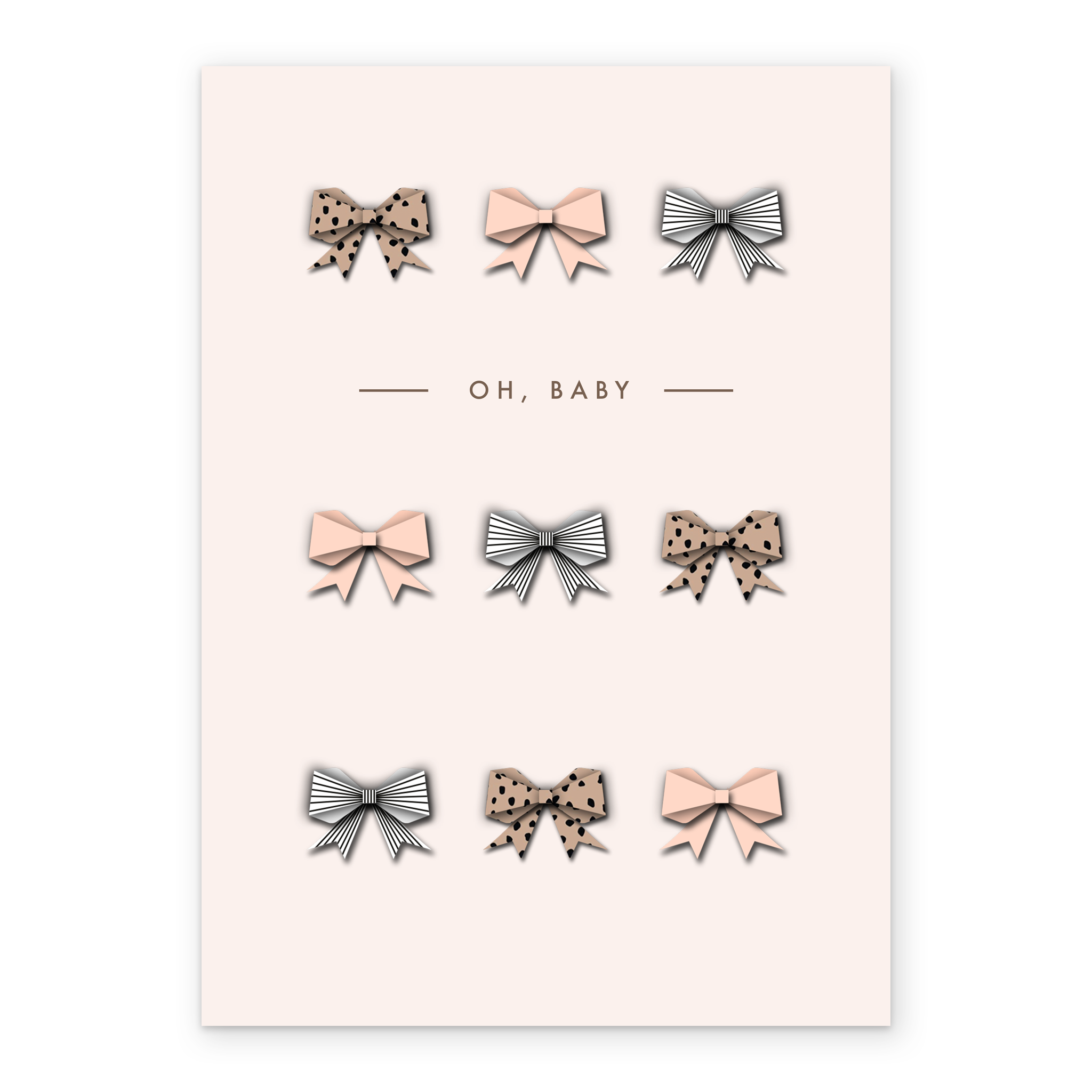 Printed on premium-quality board, this card features a repeating pattern of leopard print, pink and blue bows are shown against an off white background with simple black lettering below the first row of bows, with the message 'Oh, Baby', and comes complete with a co-ordinating white envelope.