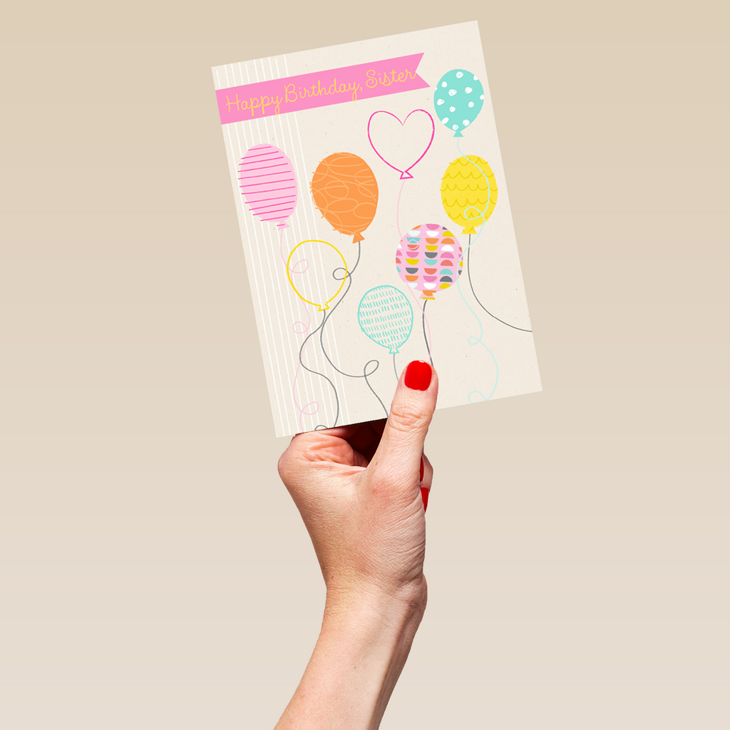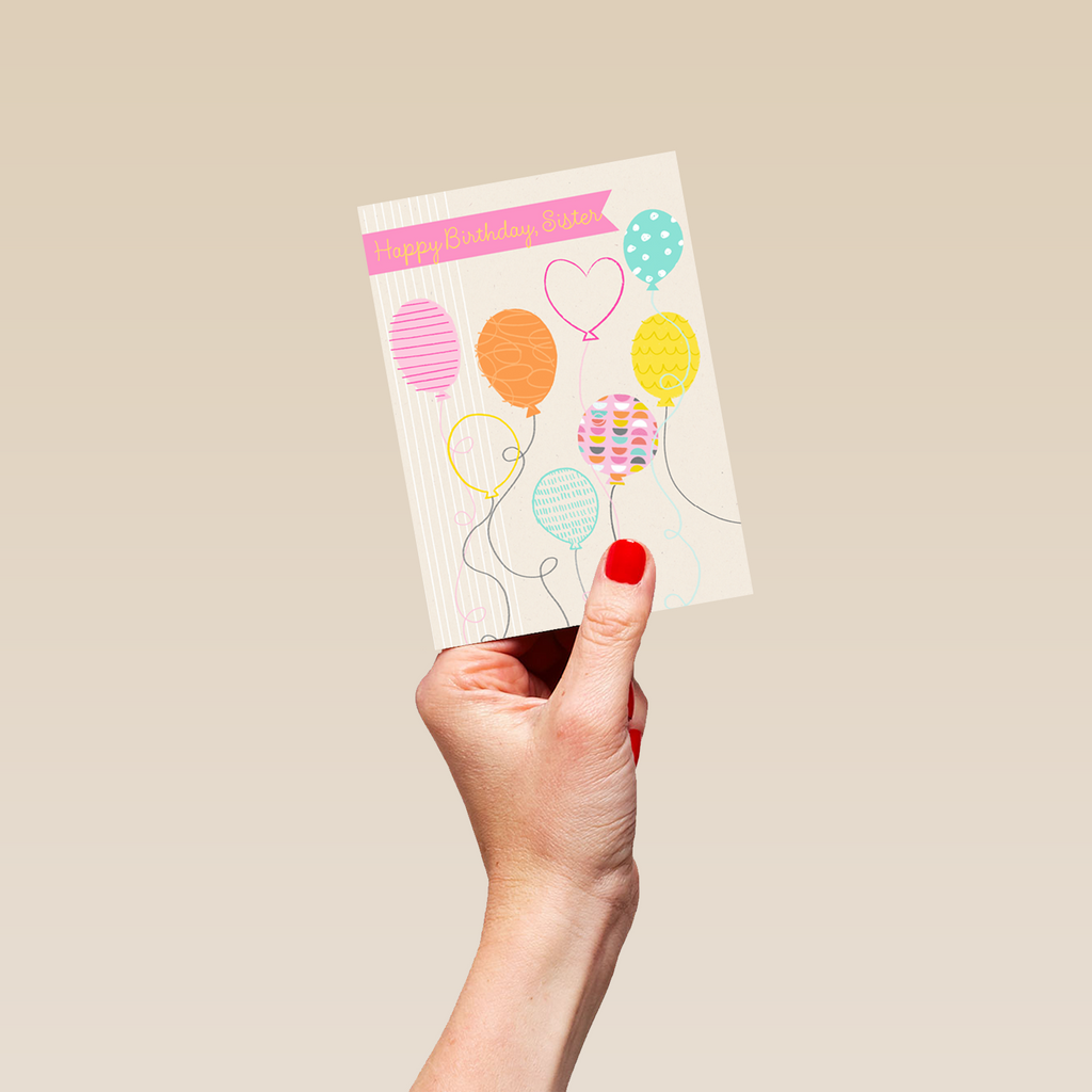 Show them you care with a personalised balloon design sister card from Hallmark. Our greetings cards are printed on premium quality, FSC®-certified card & delivered nationwide. This card is available as standard 12cm by 16.7cm and large 15.5cm by 21.6cm.