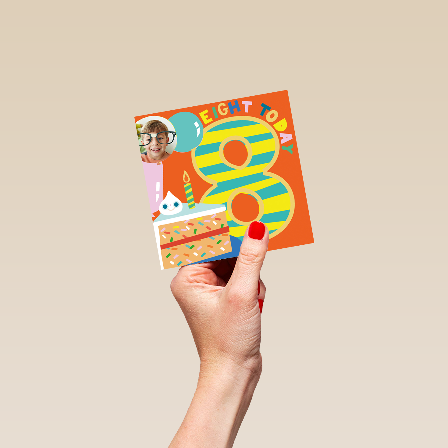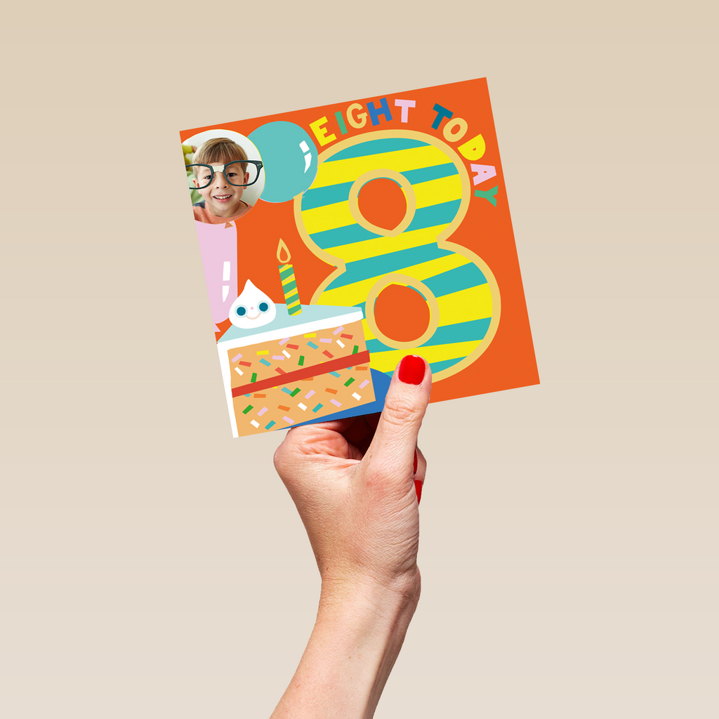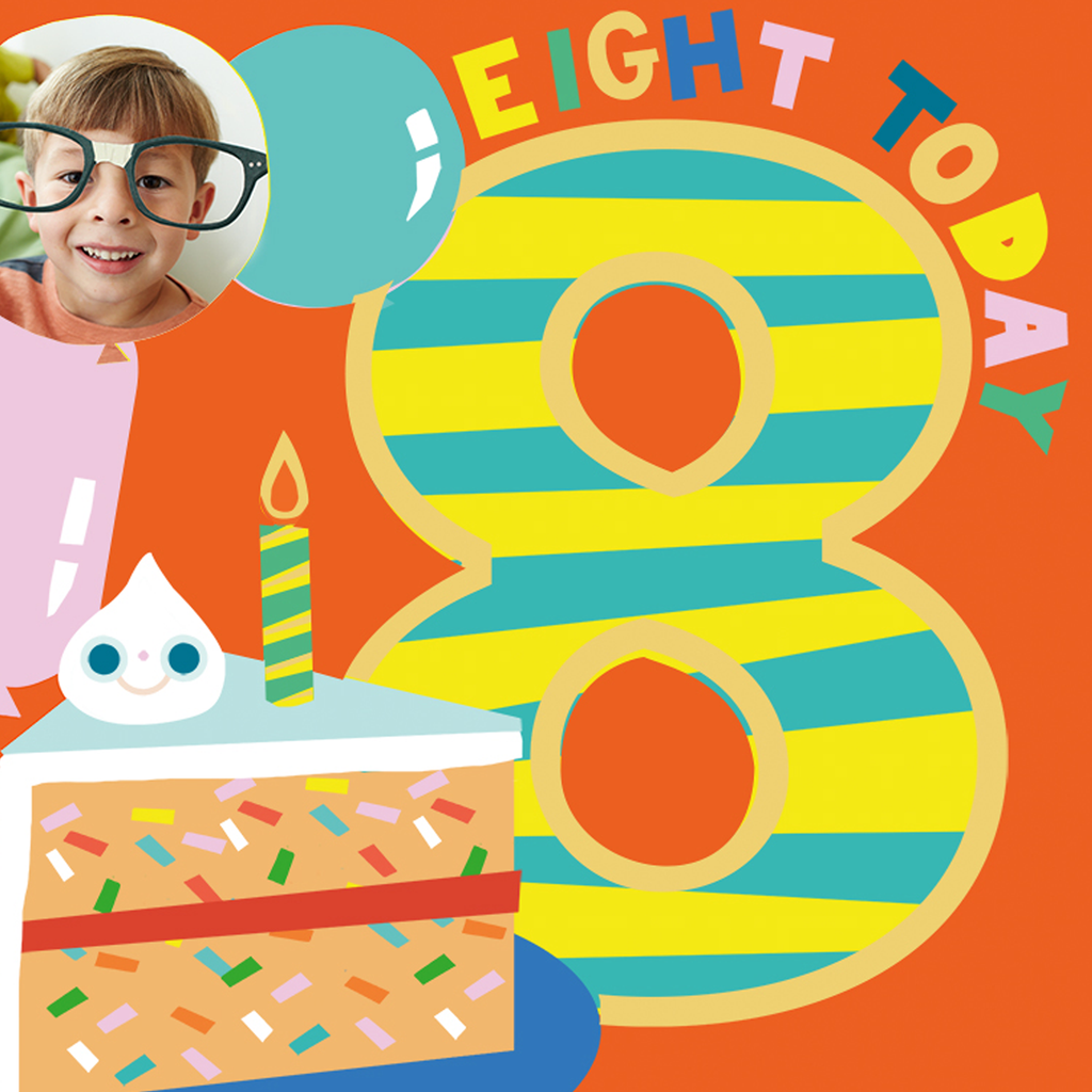 Show them you care with a personalised balloons and cake photo 8th birthday card from Hallmark. Our greetings cards are printed on premium quality, FSC®-certified card & delivered nationwide.