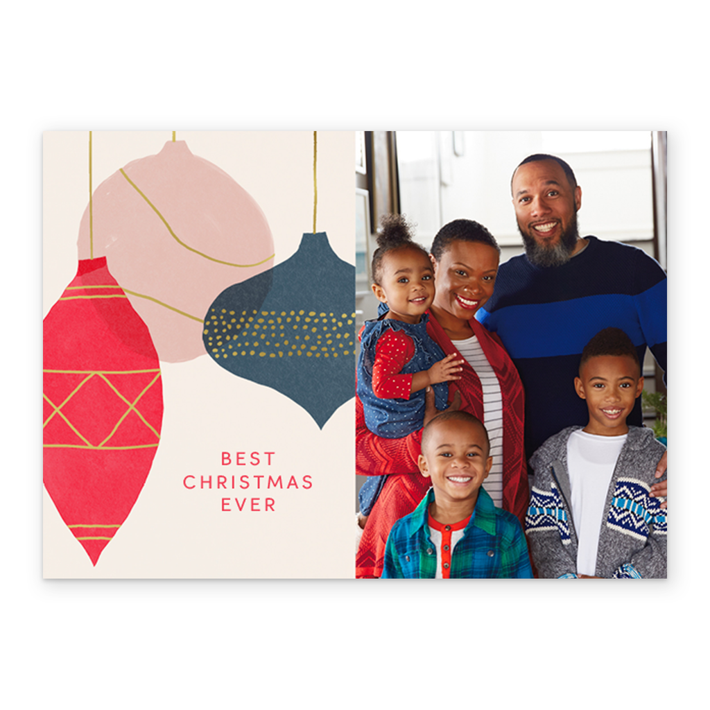 Show them you care with a personalised baubles photo Christmas card from Hallmark. Our greetings cards are printed on premium quality, FSC®-certified card & delivered nationwide. This card is available as standard 16.7cm by 12cm and large 21.6cm by 15.5cm.