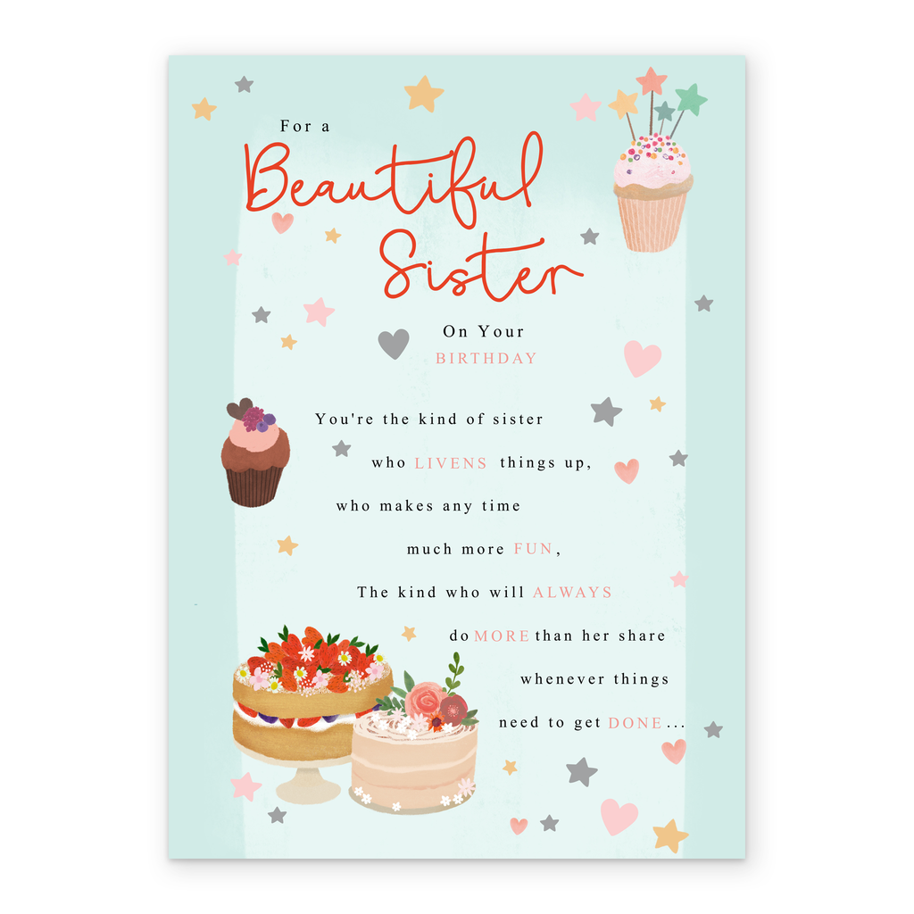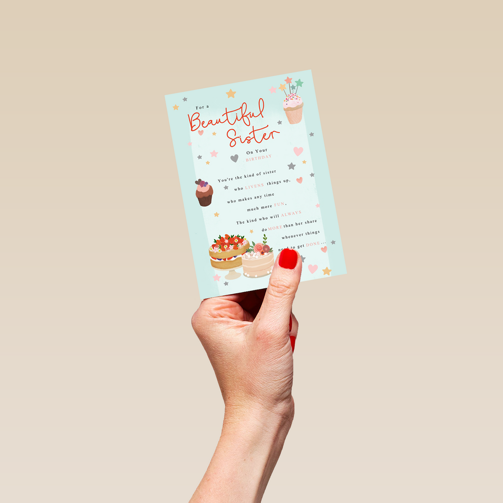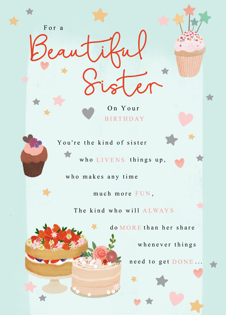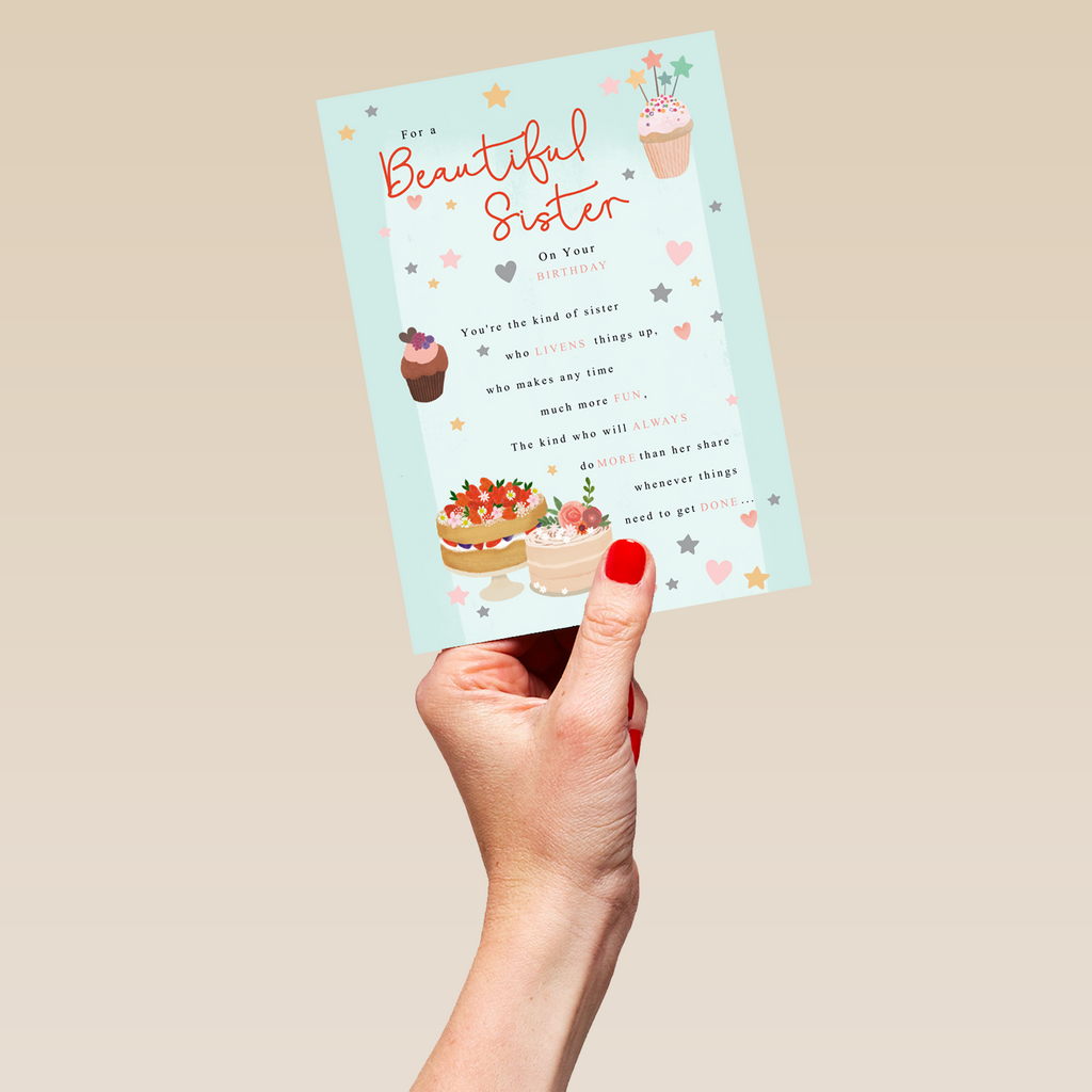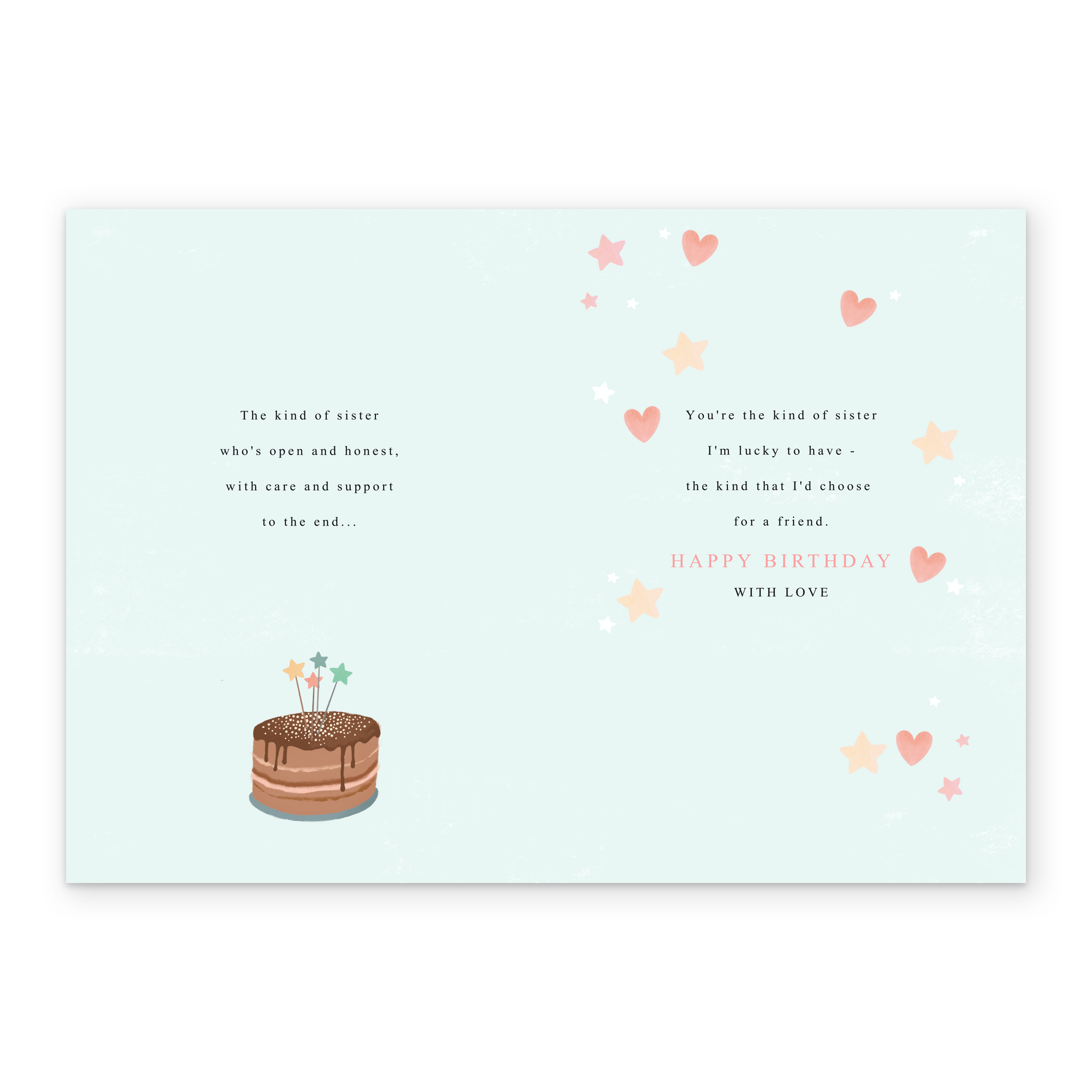 Show them you care with a personalised beautiful verse for sister card from Hallmark. Our birthday cards are printed on premium quality, FSC®-certified card & delivered nationwide. This card is available as standard 12cm by 16.7cm and large 15.5cm by 21.6cm.