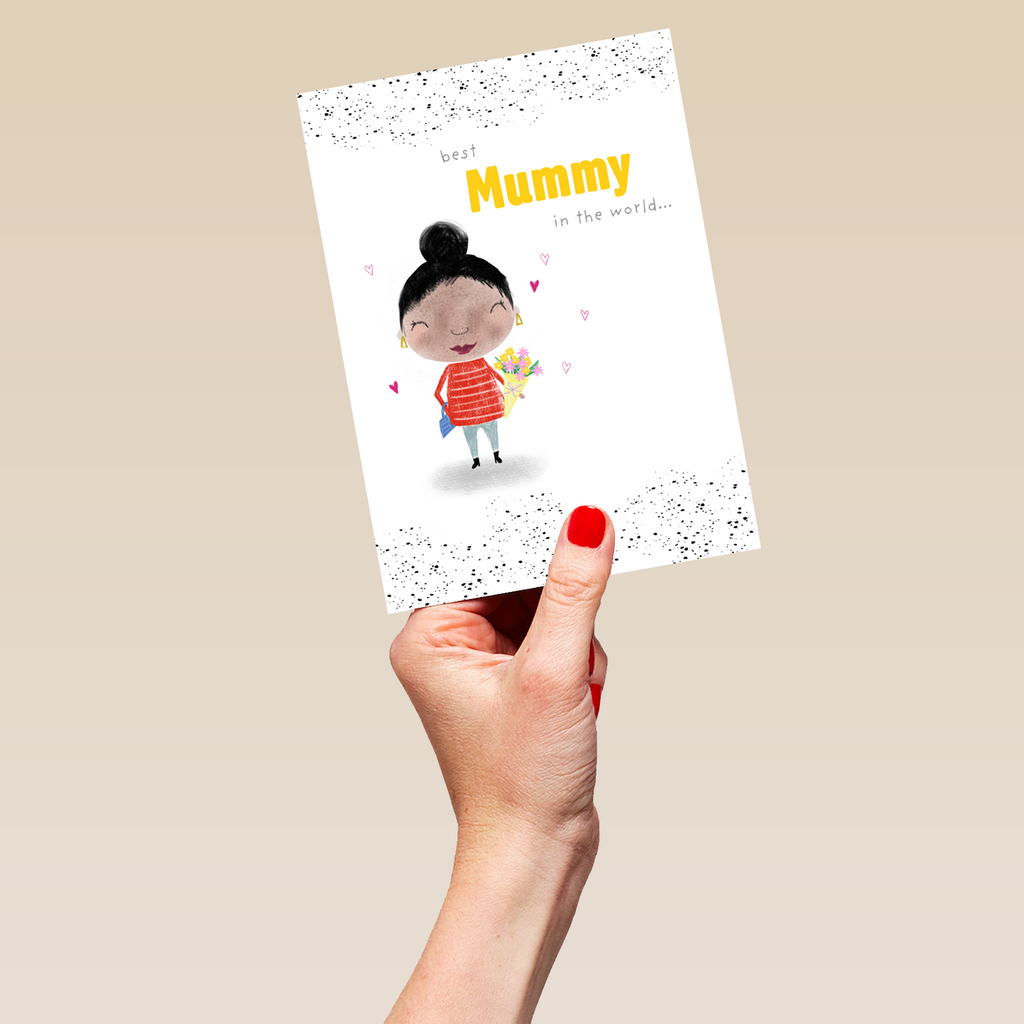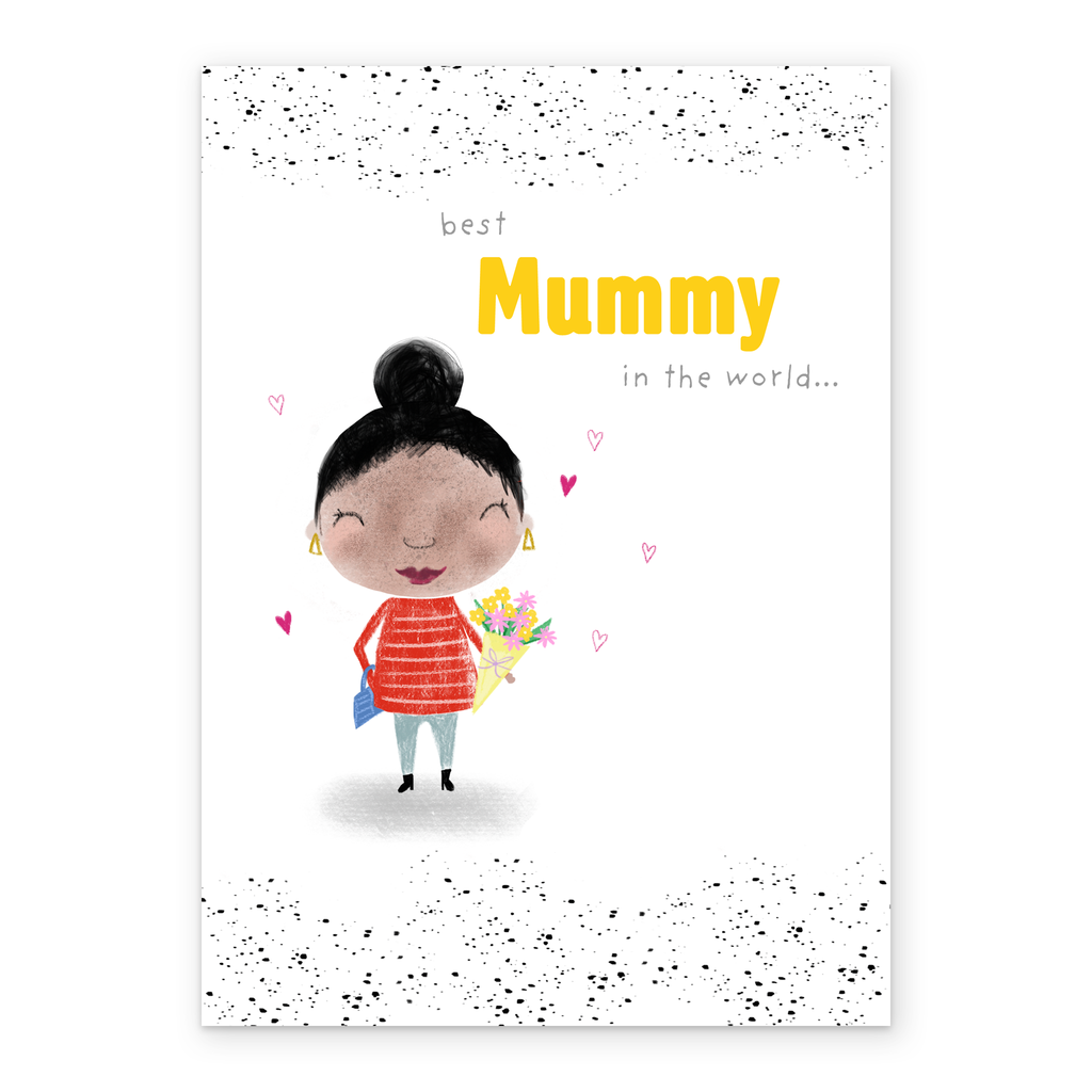 Printed on premium-quality board, this card features a happy mum after receiving her Mother's Day flowers, on a contemporary black speckled white background, with the message 'Best mummy in the world…', space to personalise a name, and comes complete with a co-ordinating white envelope.