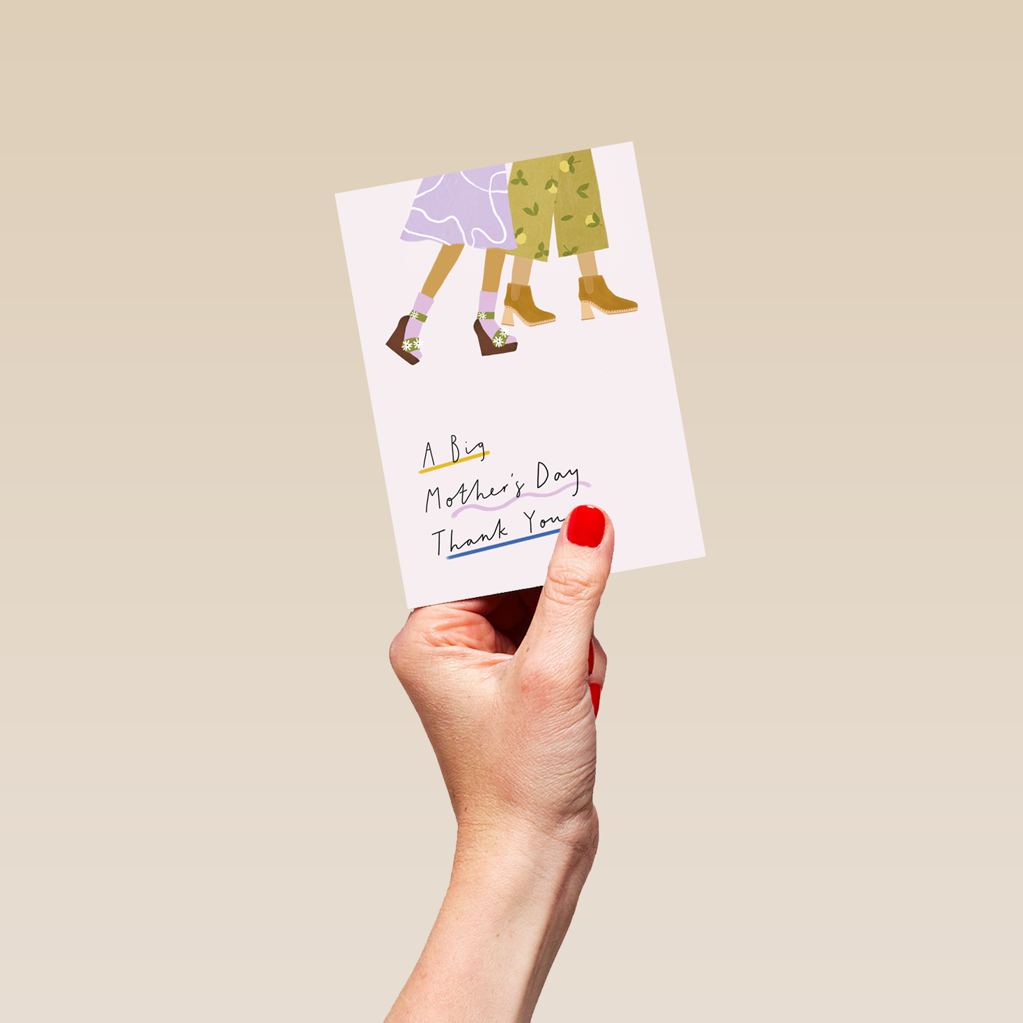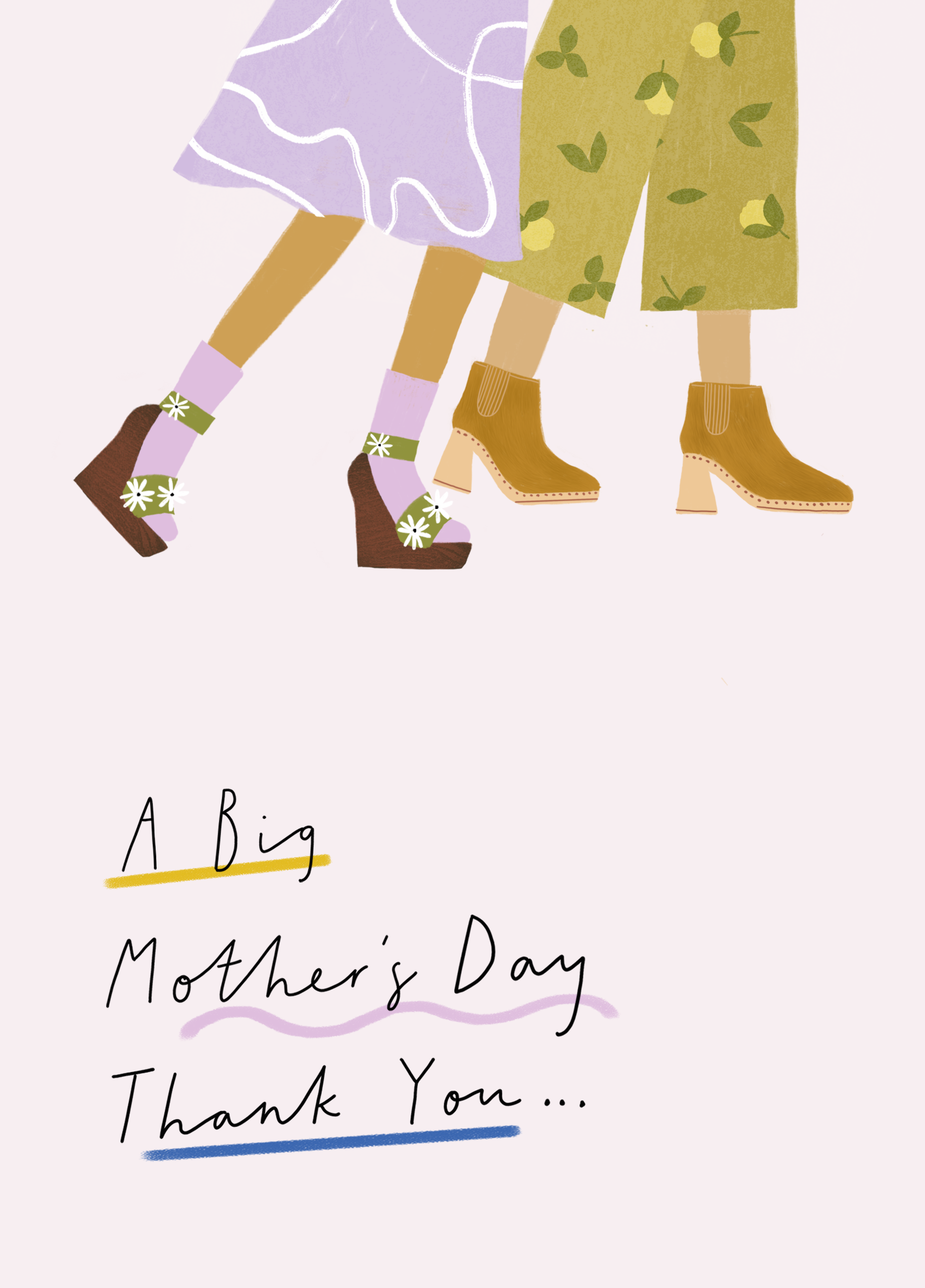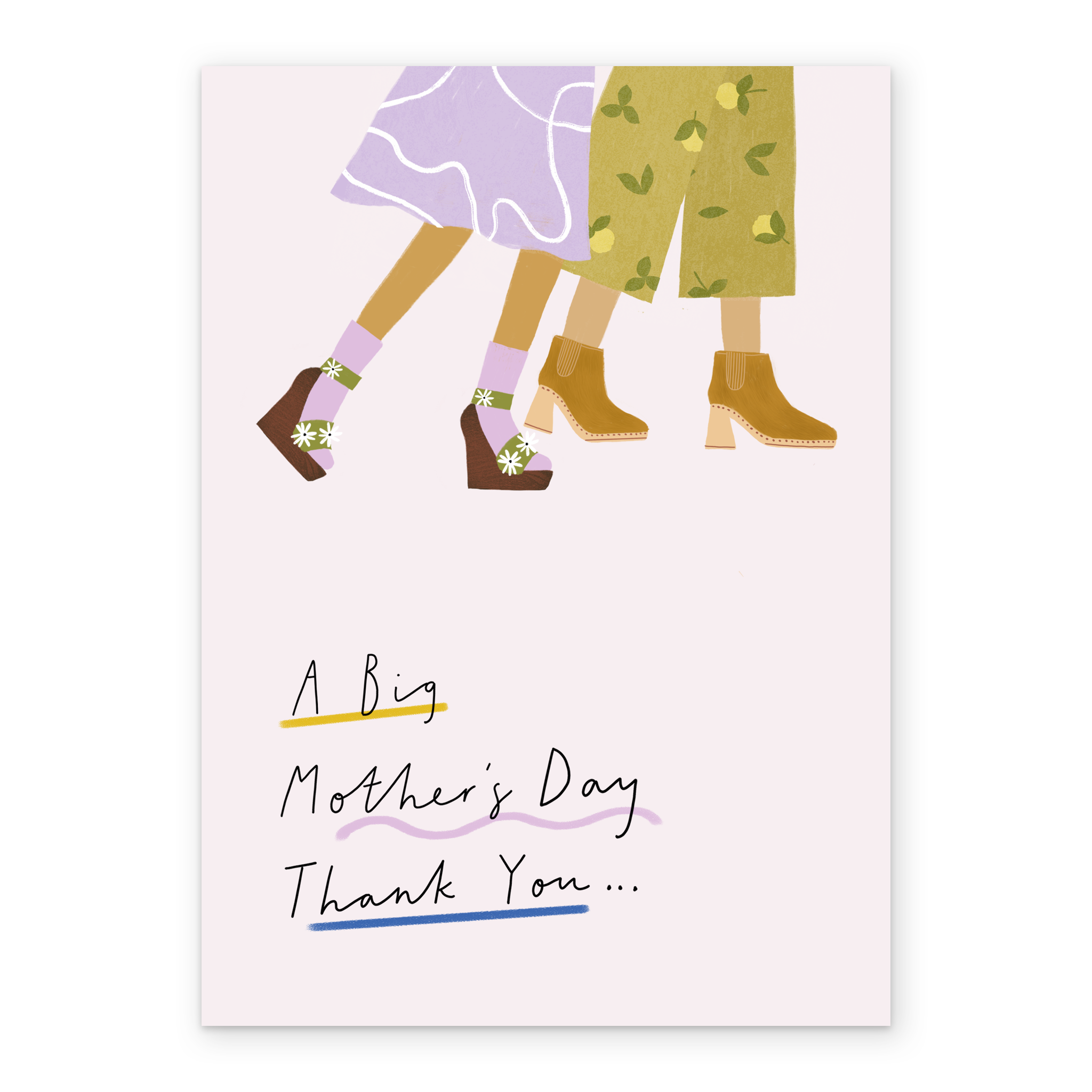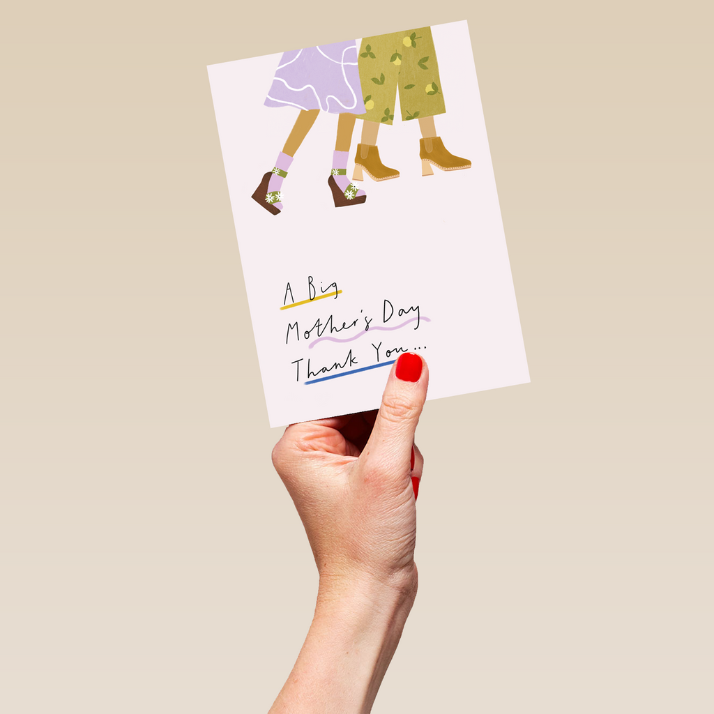 Printed on premium-quality board, this card features a contemporary illustration of a mother and daughter's legs, on a white background, with the message 'A big Mother's Day thank you…', and comes complete with a co-ordinating white envelope.
