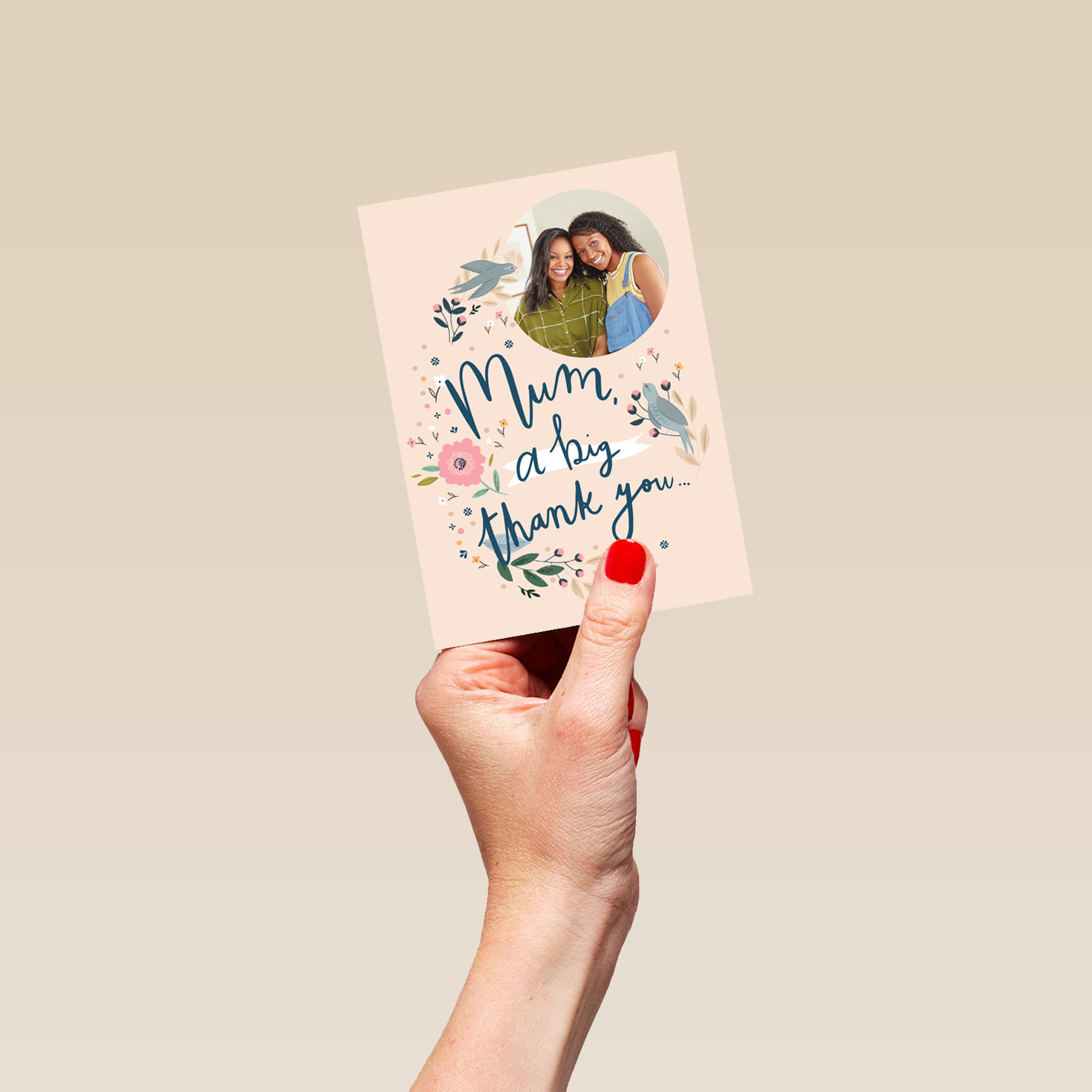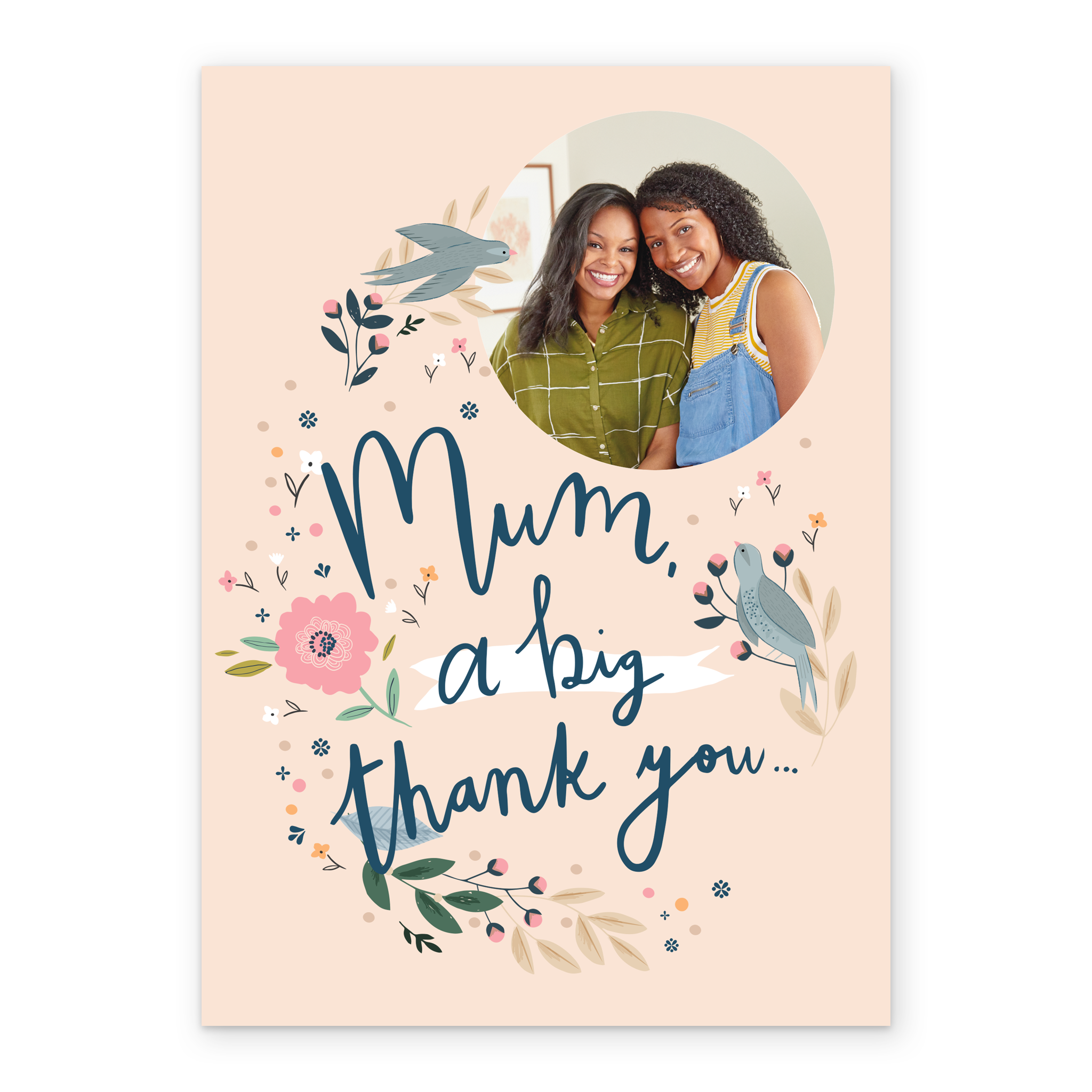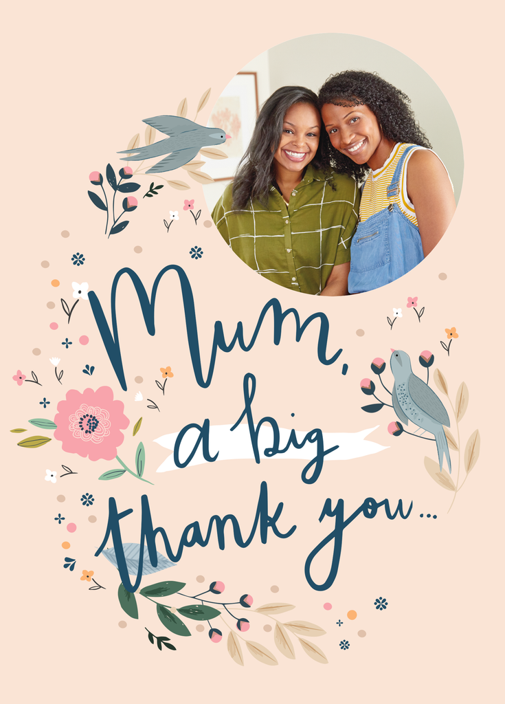Printed on premium-quality board, this card features illustrated birds and a floral pattern with pink and yellow flowers, on a light peach background, with the message 'Mum a big thank you…', space to upload a photo, and comes complete with a co-ordinating white envelope.