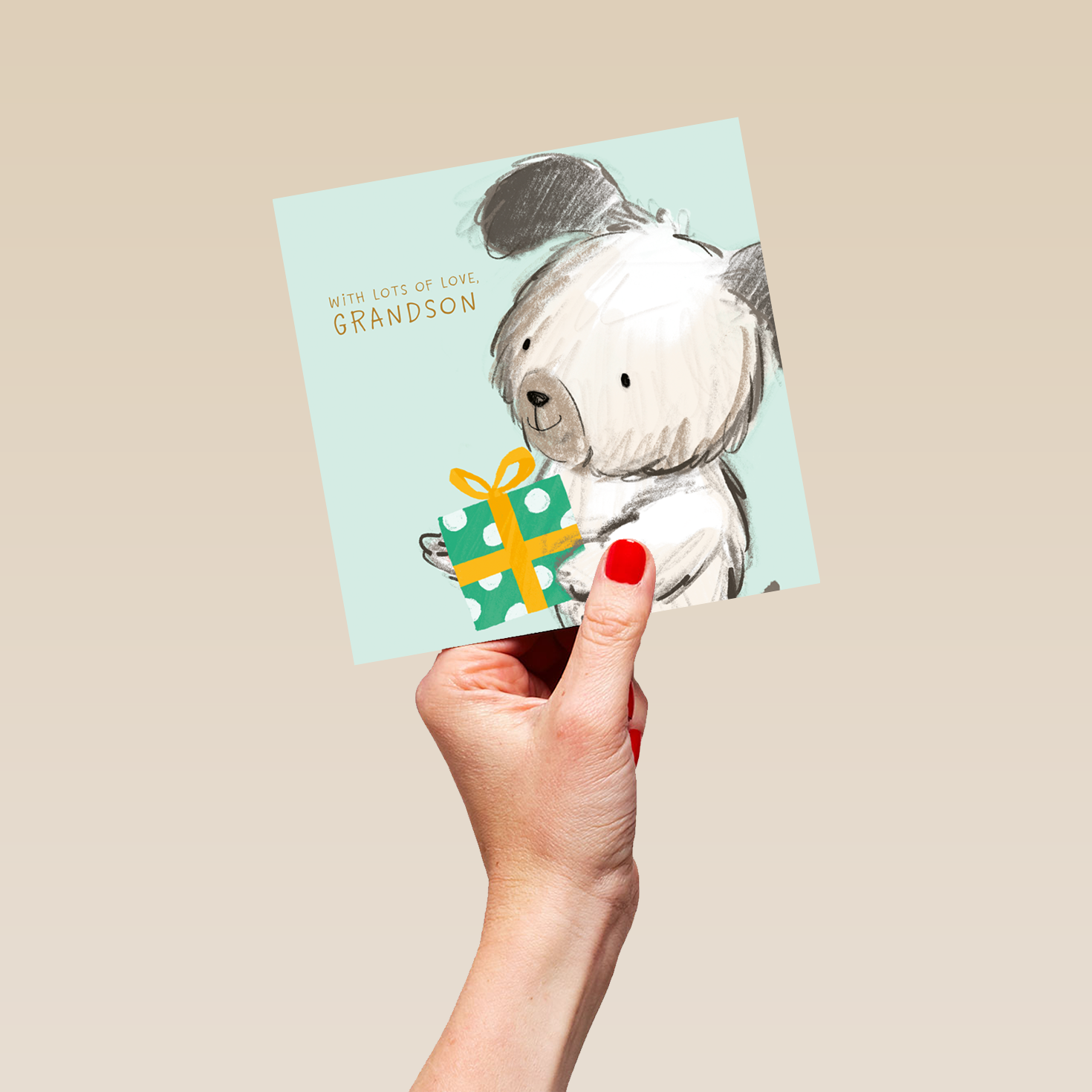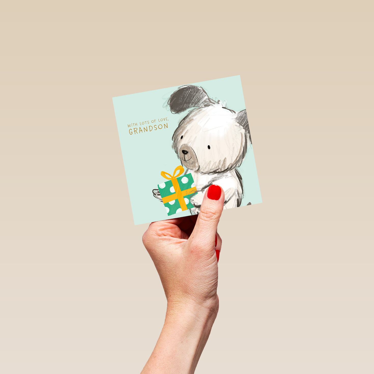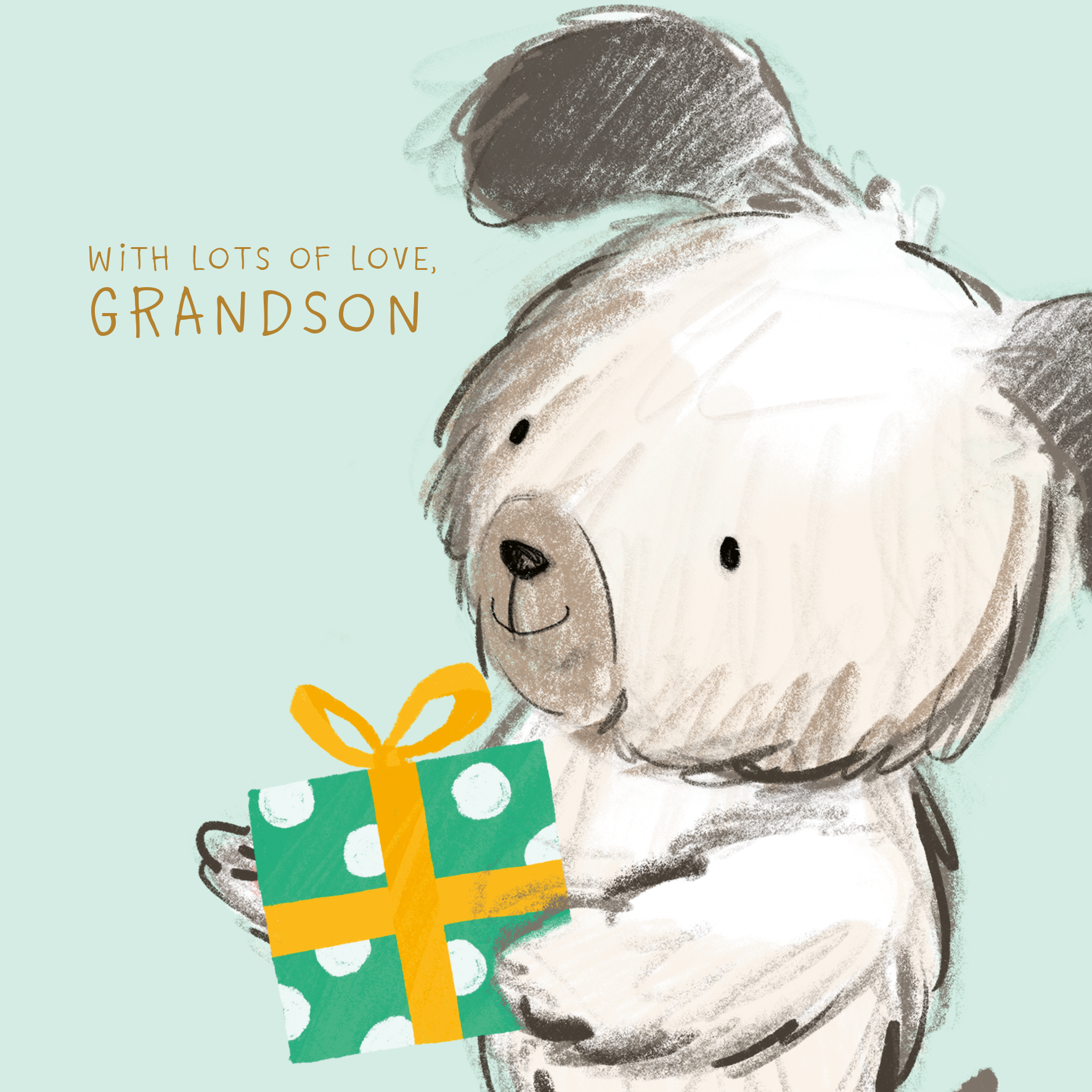 Printed on premium-quality board, this card features a cute, sketch style illustration of a sweet, black and white dog, carrying a green, white and yellow wrapped gift, set against a pale green background with gold-coloured lettering, with the message 'With lots of love [NAME]', space to personalise your message, and comes complete with a co-ordinating white envelope.