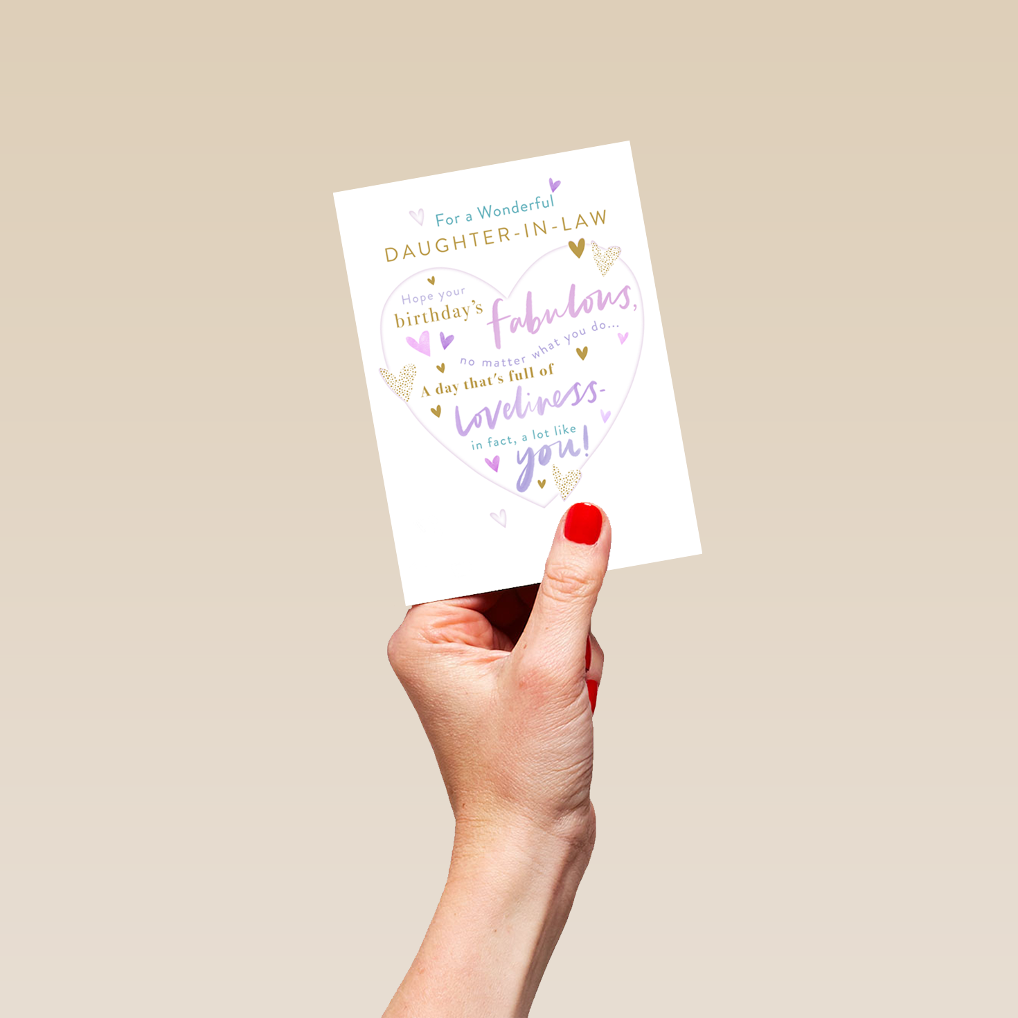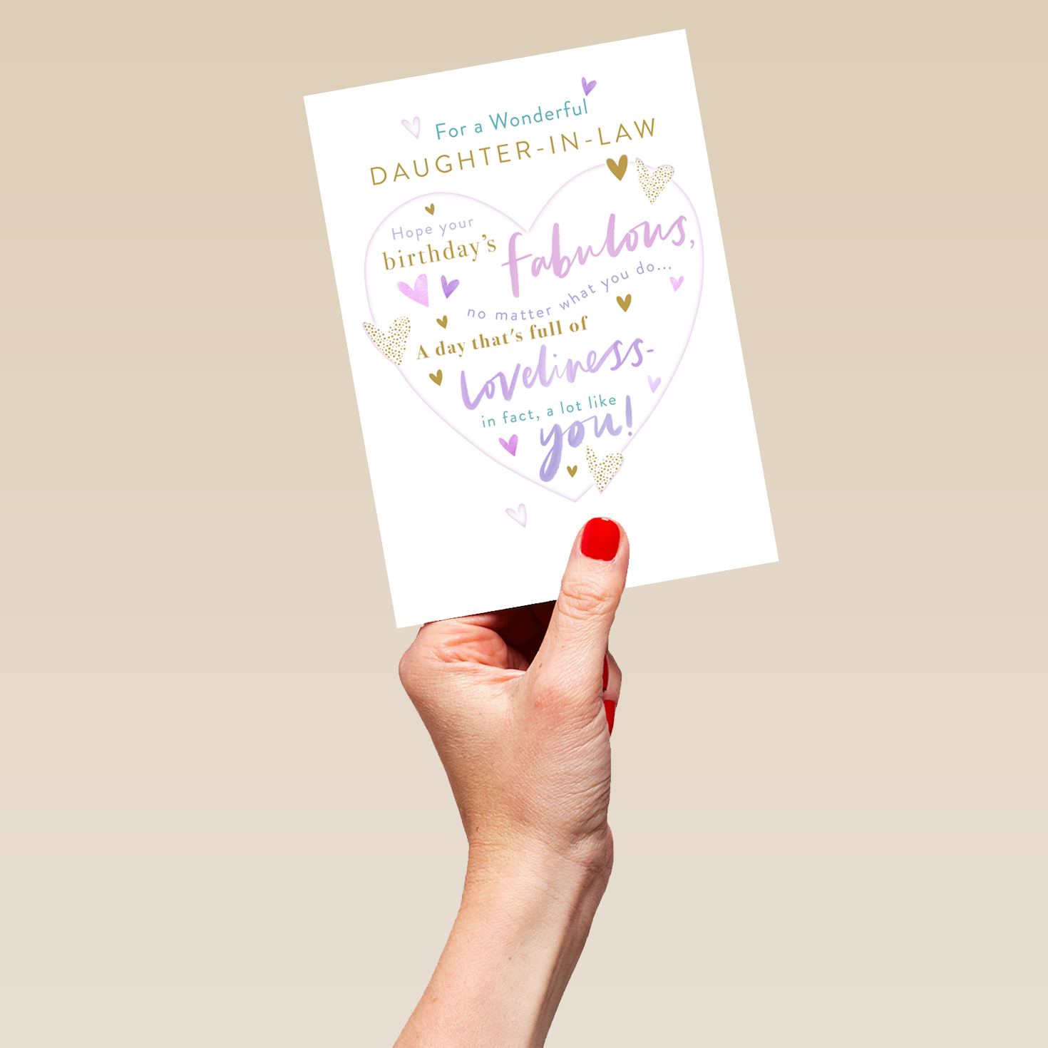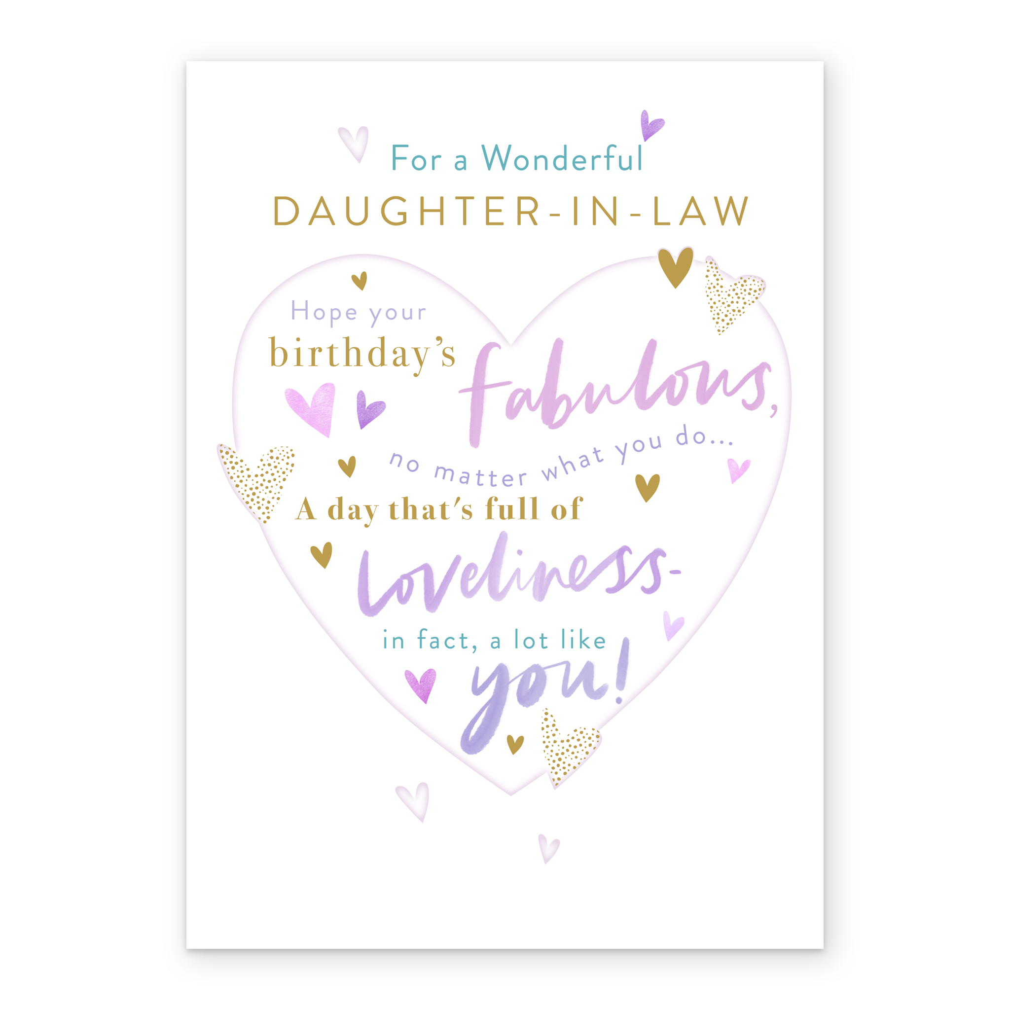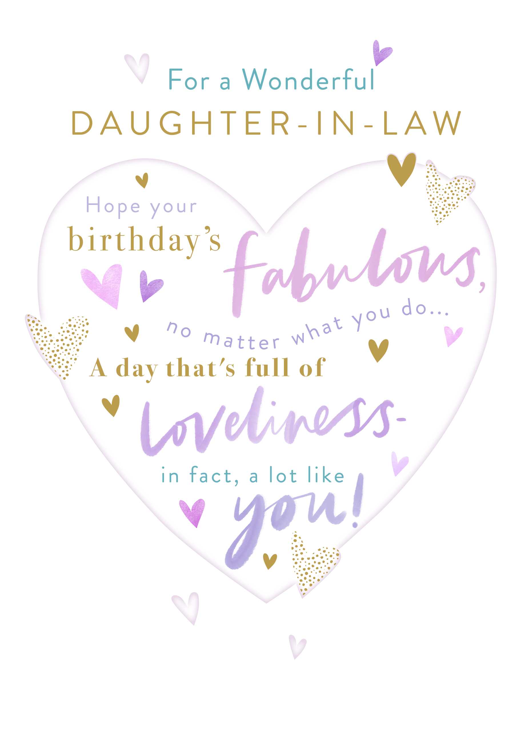 Printed on premium-quality board, this card features a white background with a large grey heart-shape, surrounded by smaller heart shapes, with blue and gold lettering above and filled with gold, purple and blue lettering, with the message 'For a Wonderful DAUGHTER-IN-LAW. Hope your birthday's FABULOUS, no matter what you do... A day that's full of LOVELINESS - in fact, a lot like you!', and comes complete with a co-ordinating white envelope.