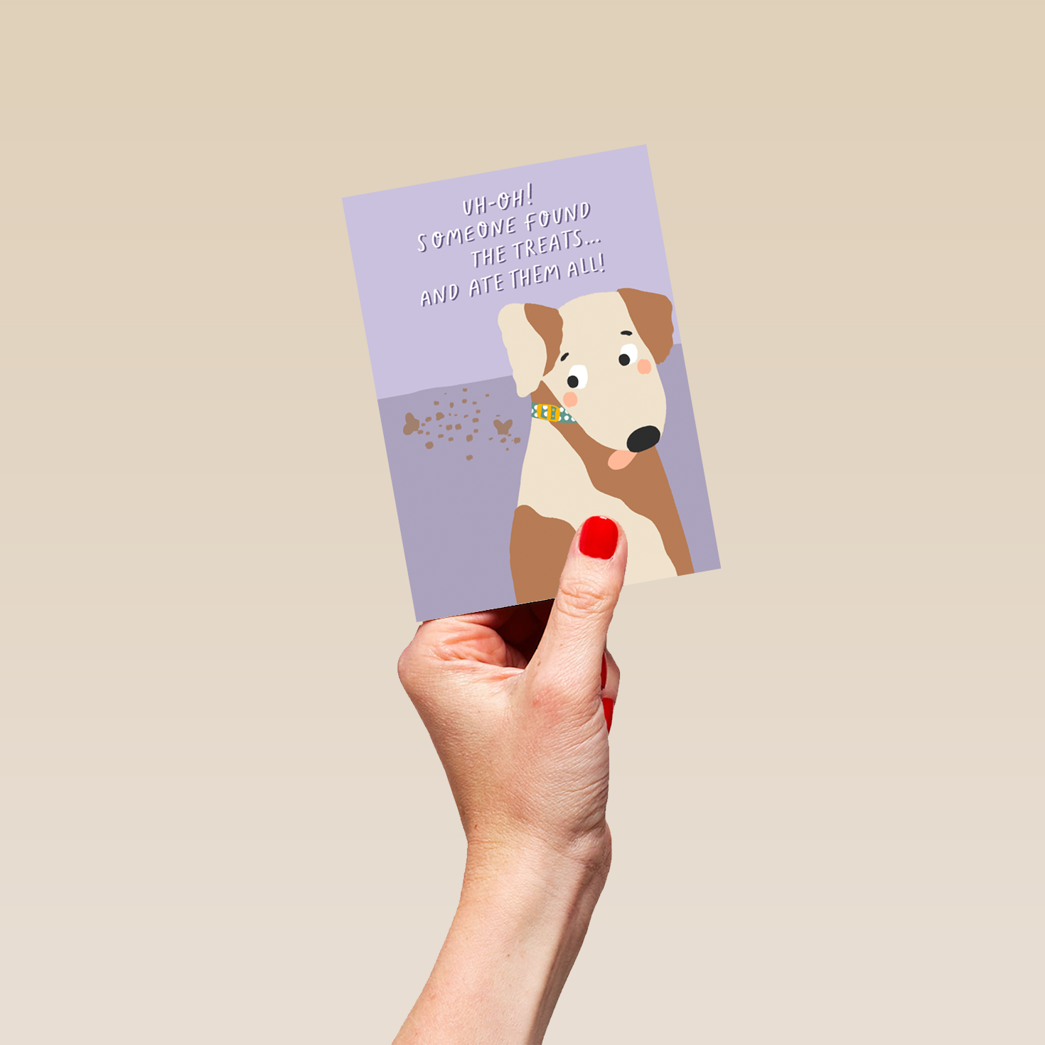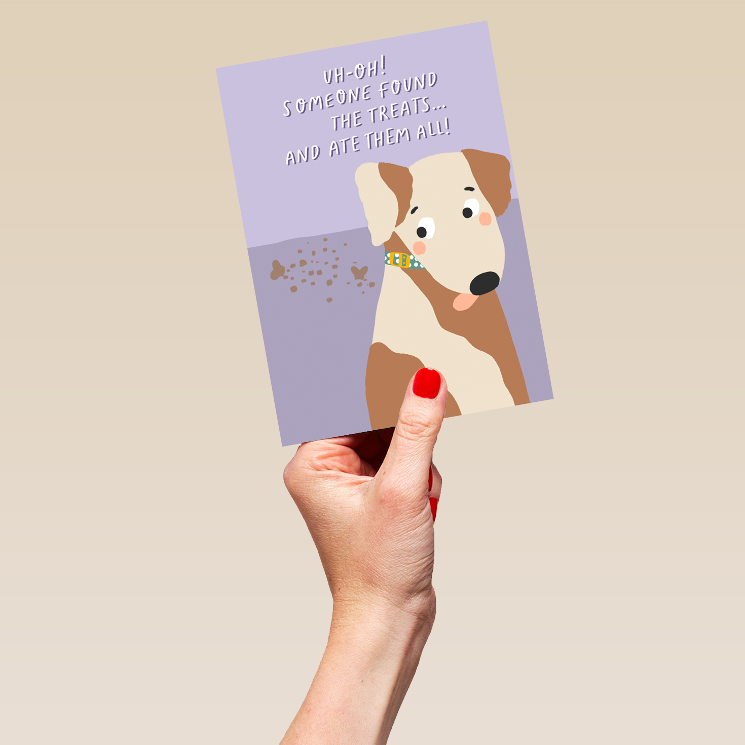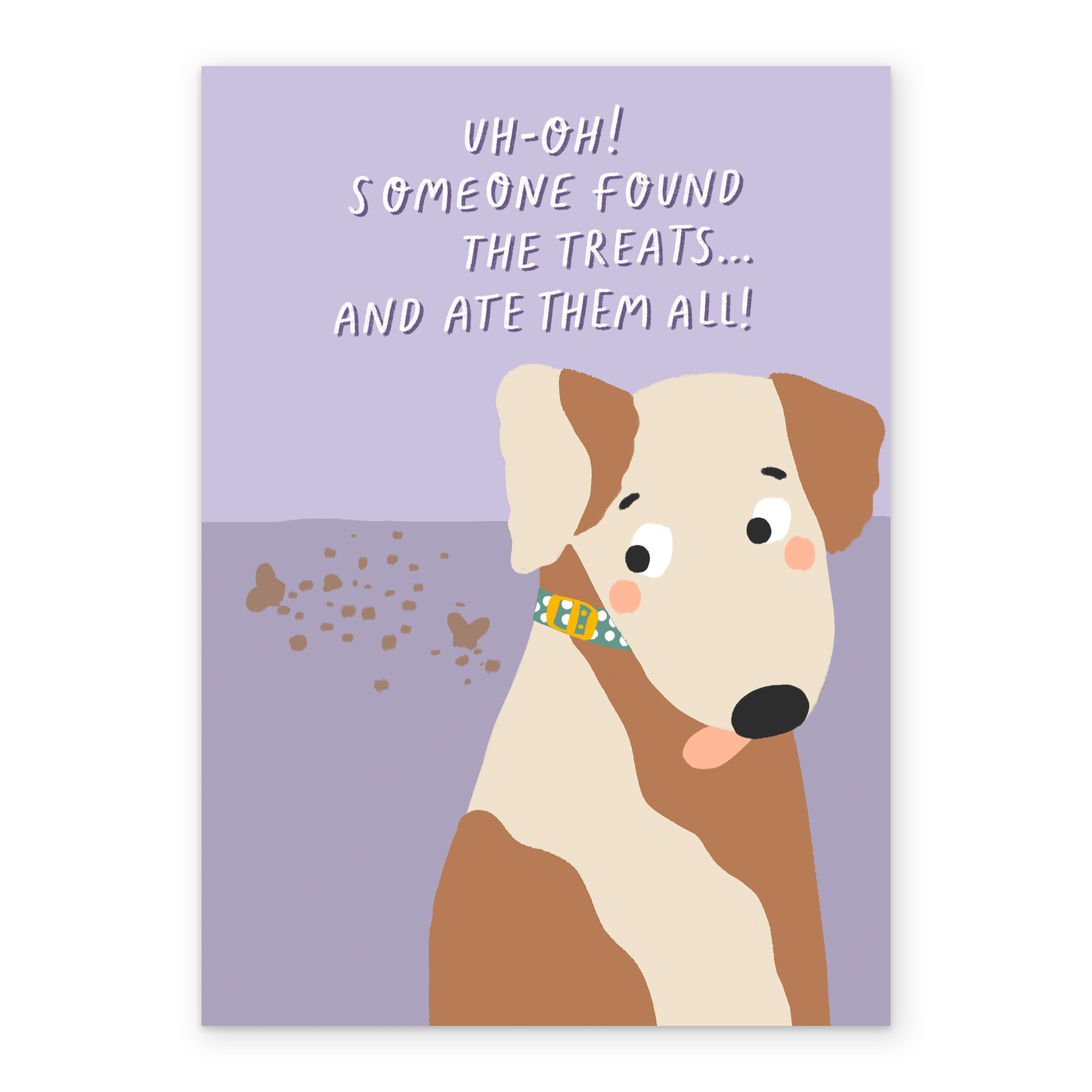Printed on premium-quality board, this card features an adorable illustration of a dog who's eaten all of their treats, with the message 'Uh-oh! Someone found the treats… and ate them all!', and comes complete with a co-ordinating white envelope.
