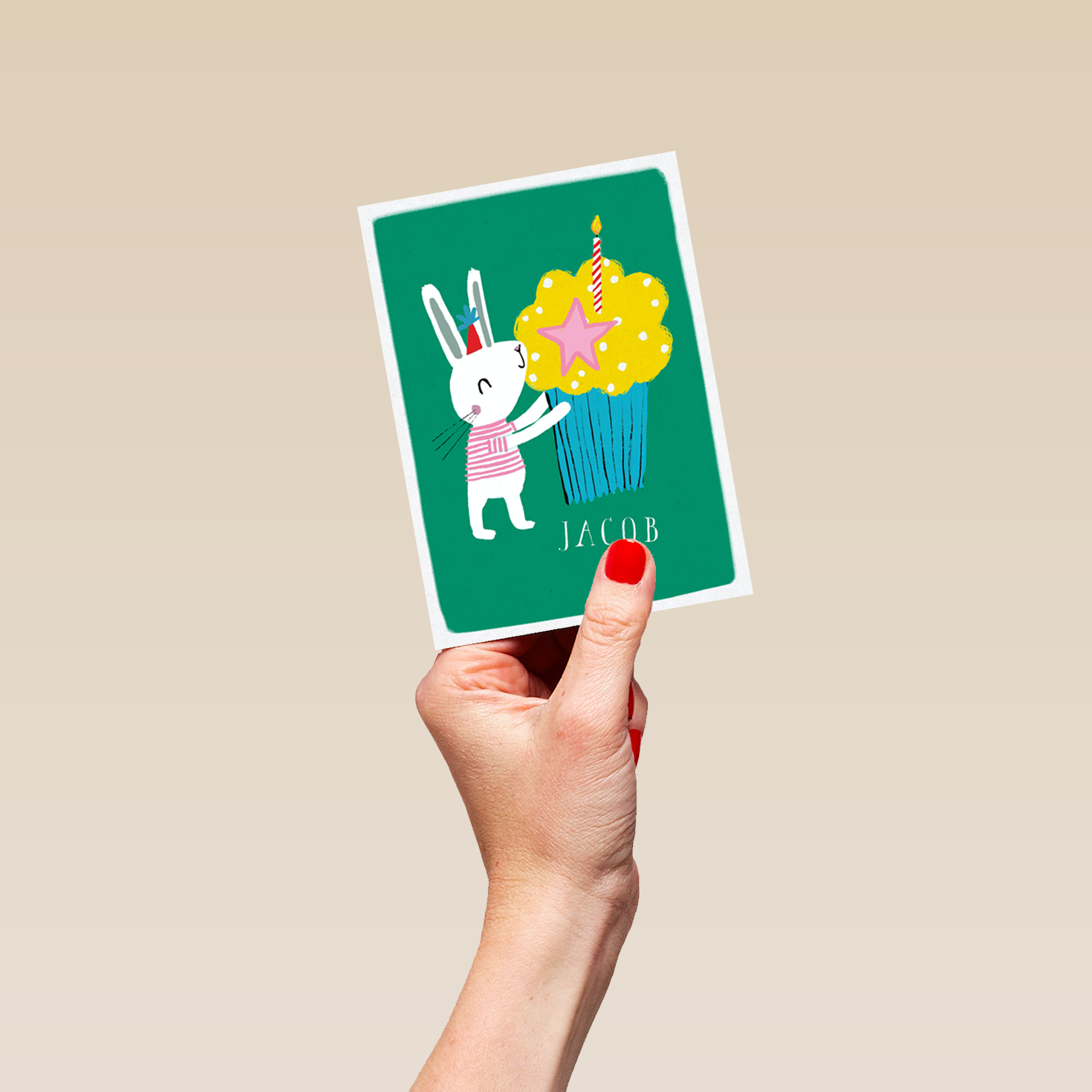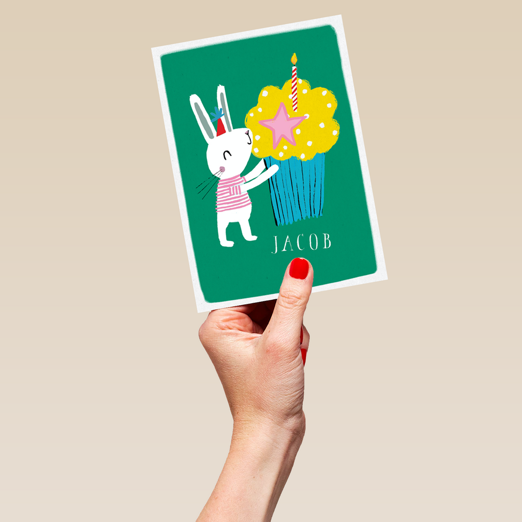 Show them you care with a personalised birthday fun bunny rabbit cupcake card from Hallmark. Our greetings cards are printed on premium quality, FSC®-certified card & delivered nationwide.
