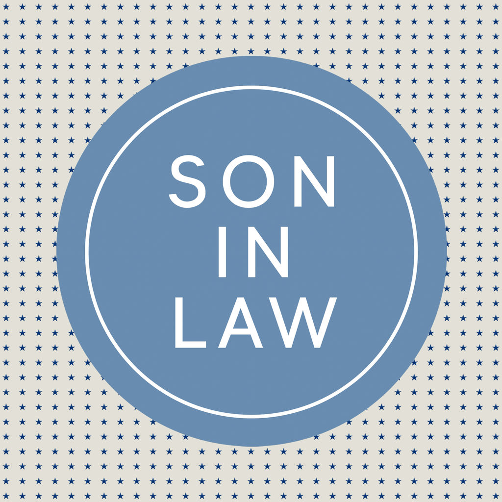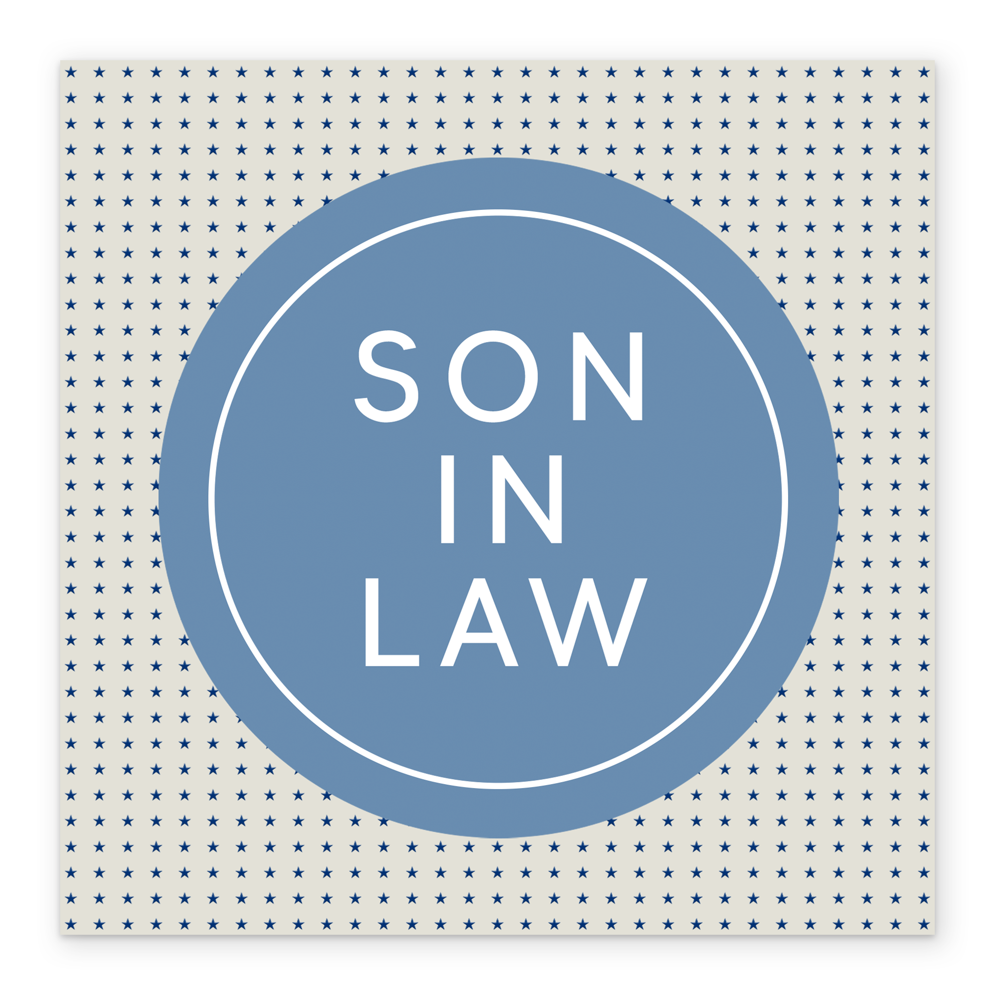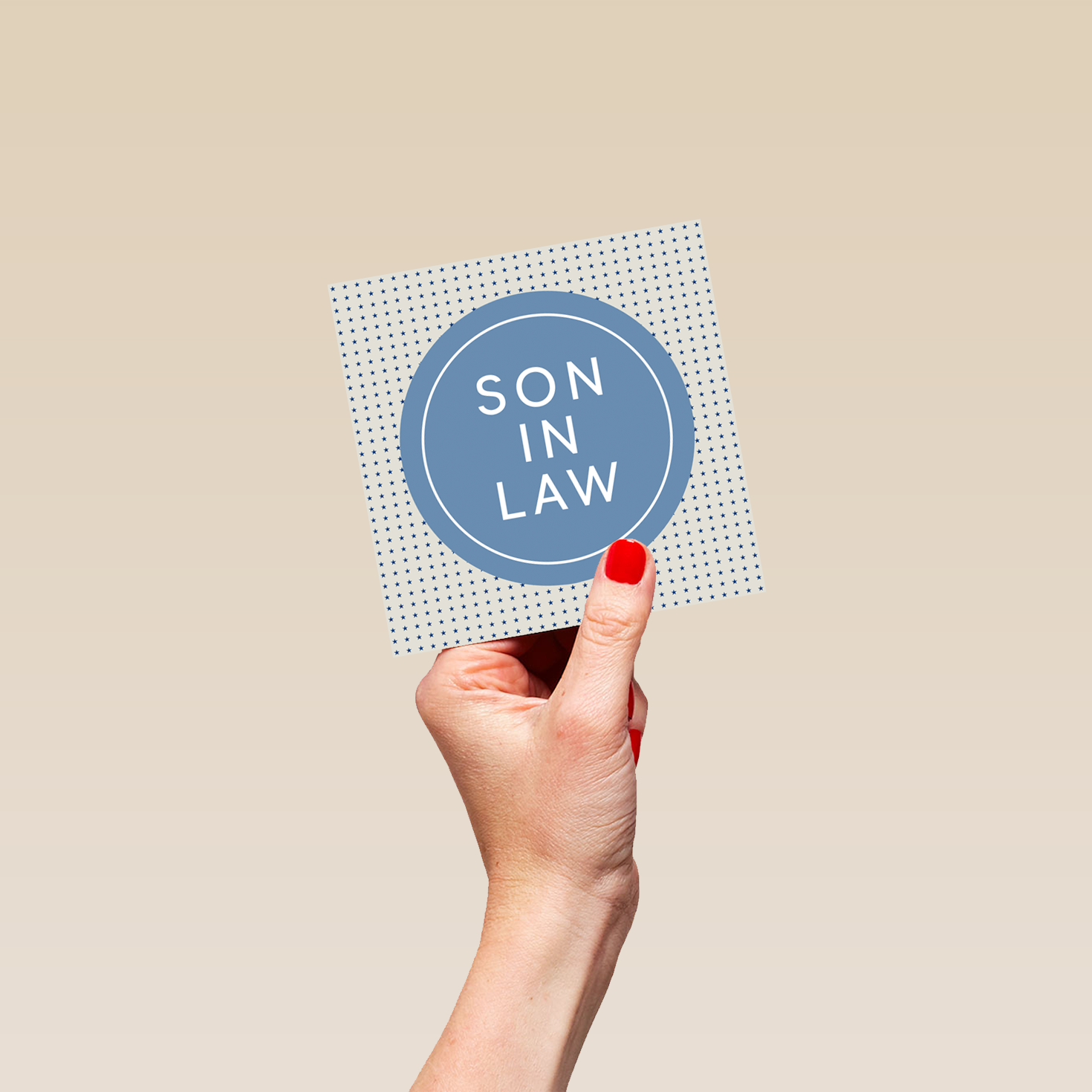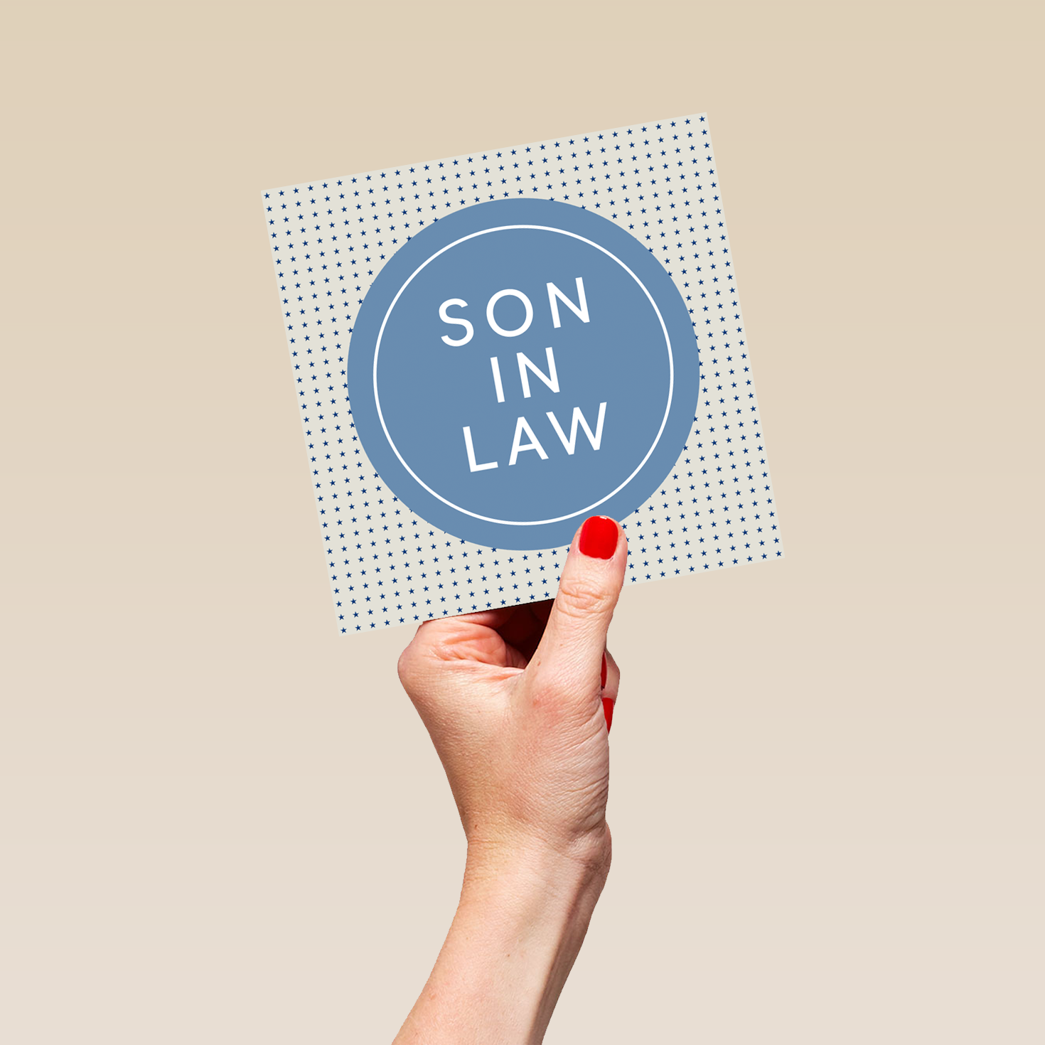 Printed on premium-quality board, this card features a simple blue circle framing words, with the message 'Son In Law', and comes complete with a co-ordinating white envelope.