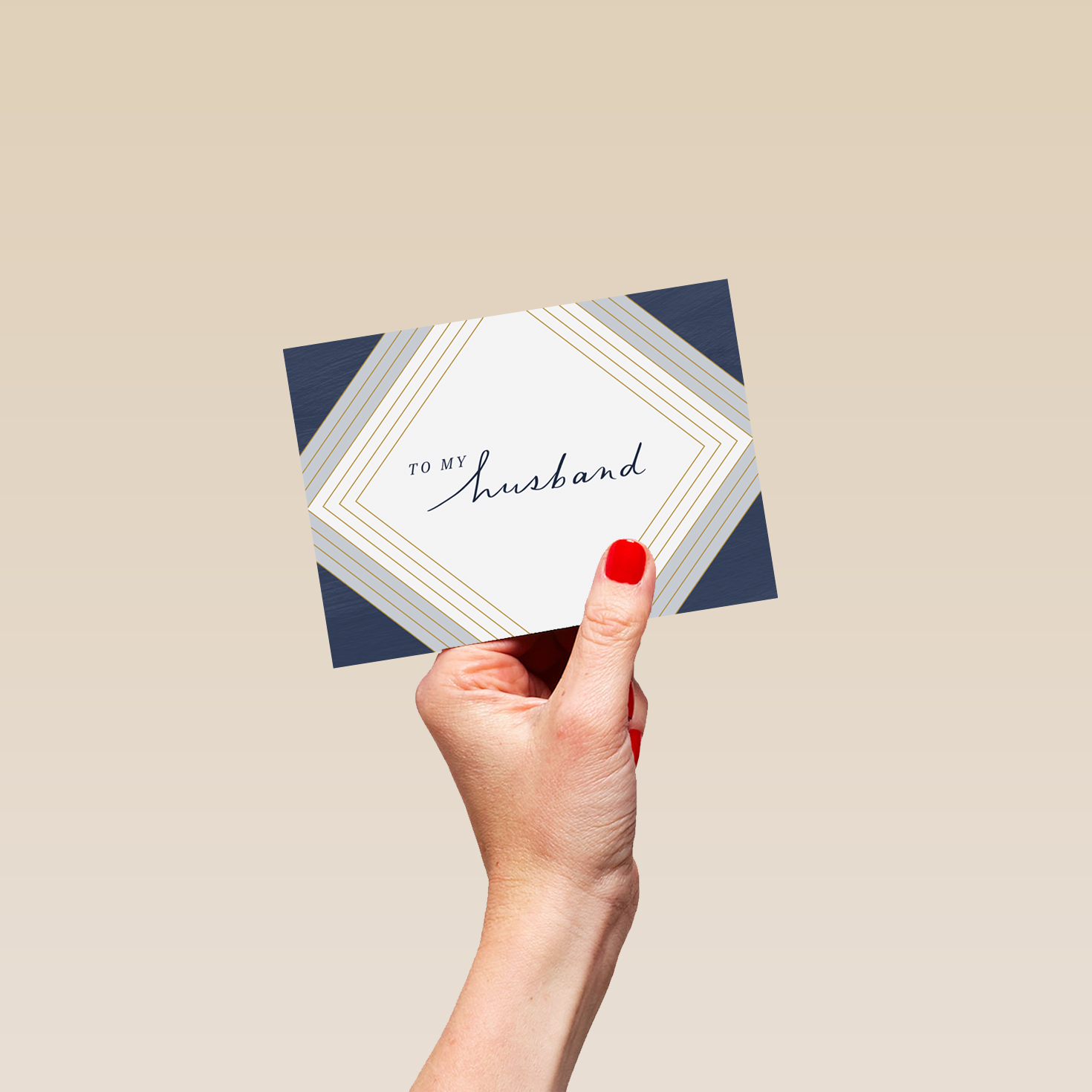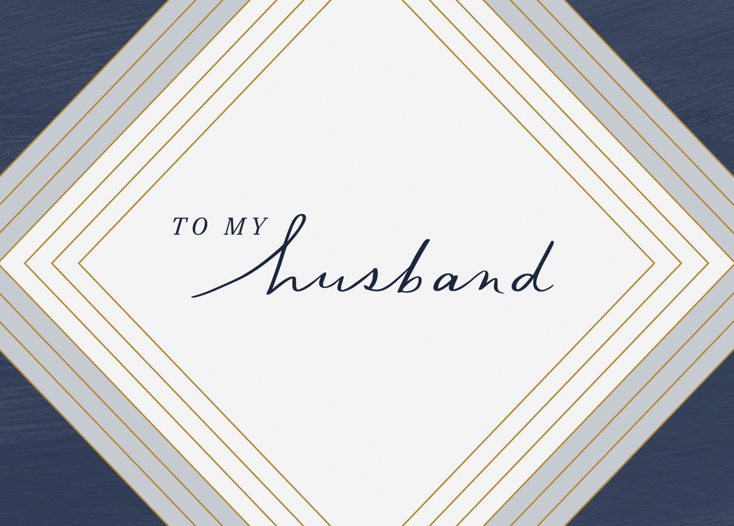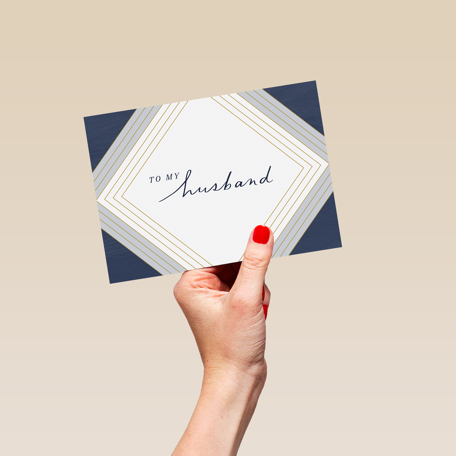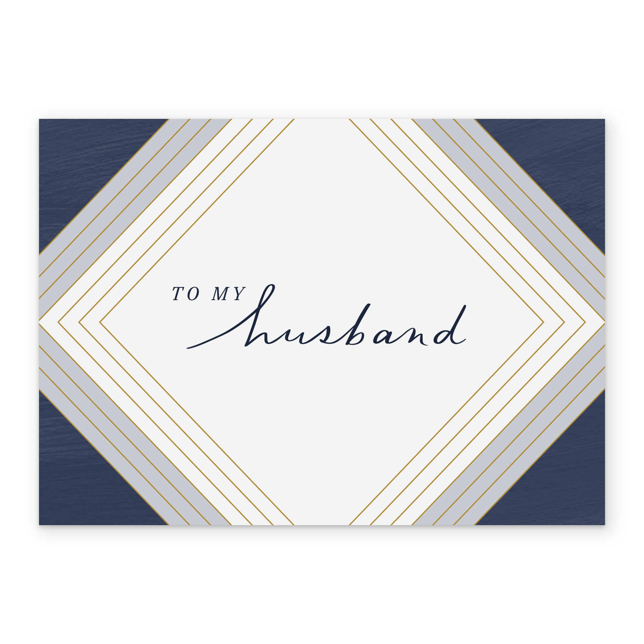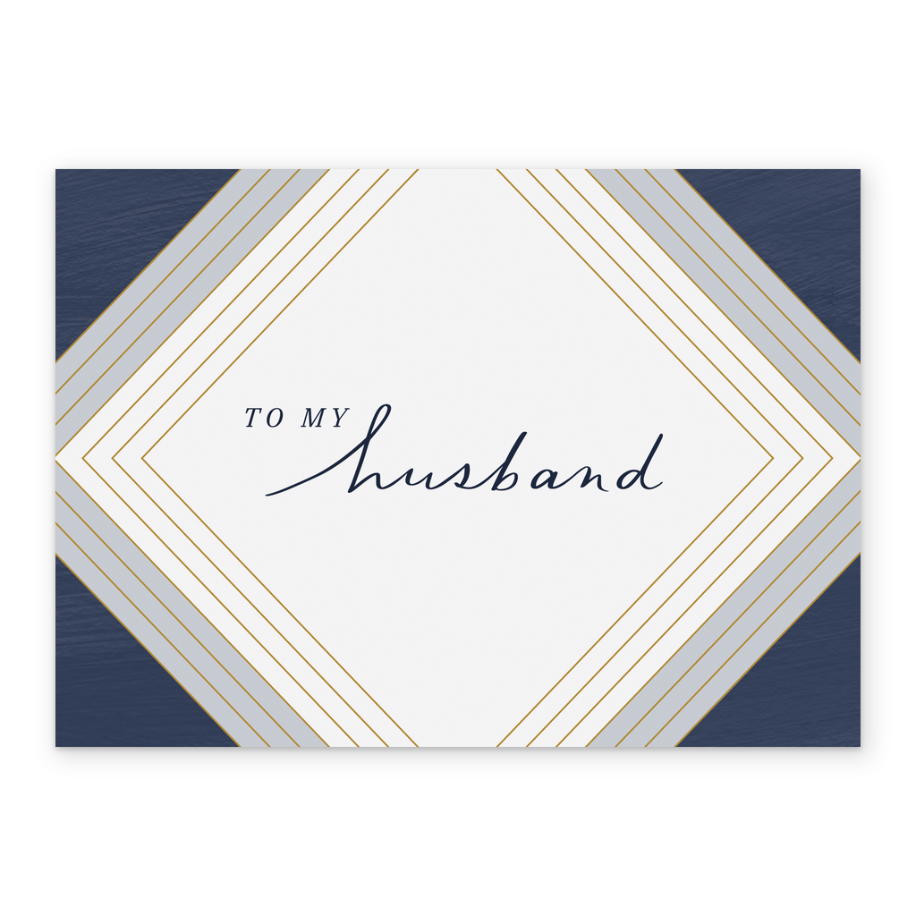 Printed on premium-quality board, this card features a diamond design with a dark blue background and gold coloured lines, with the message 'To My Husband', and comes complete with a co-ordinating white envelope.