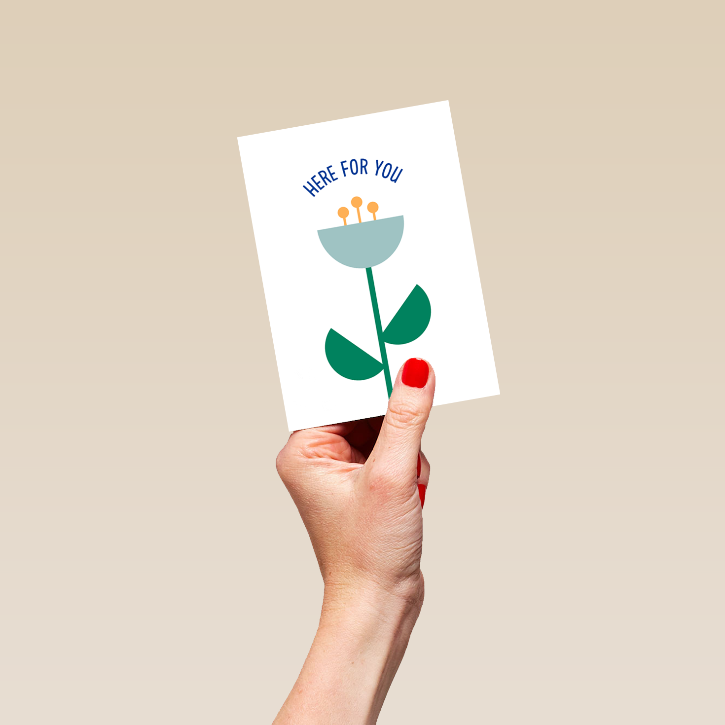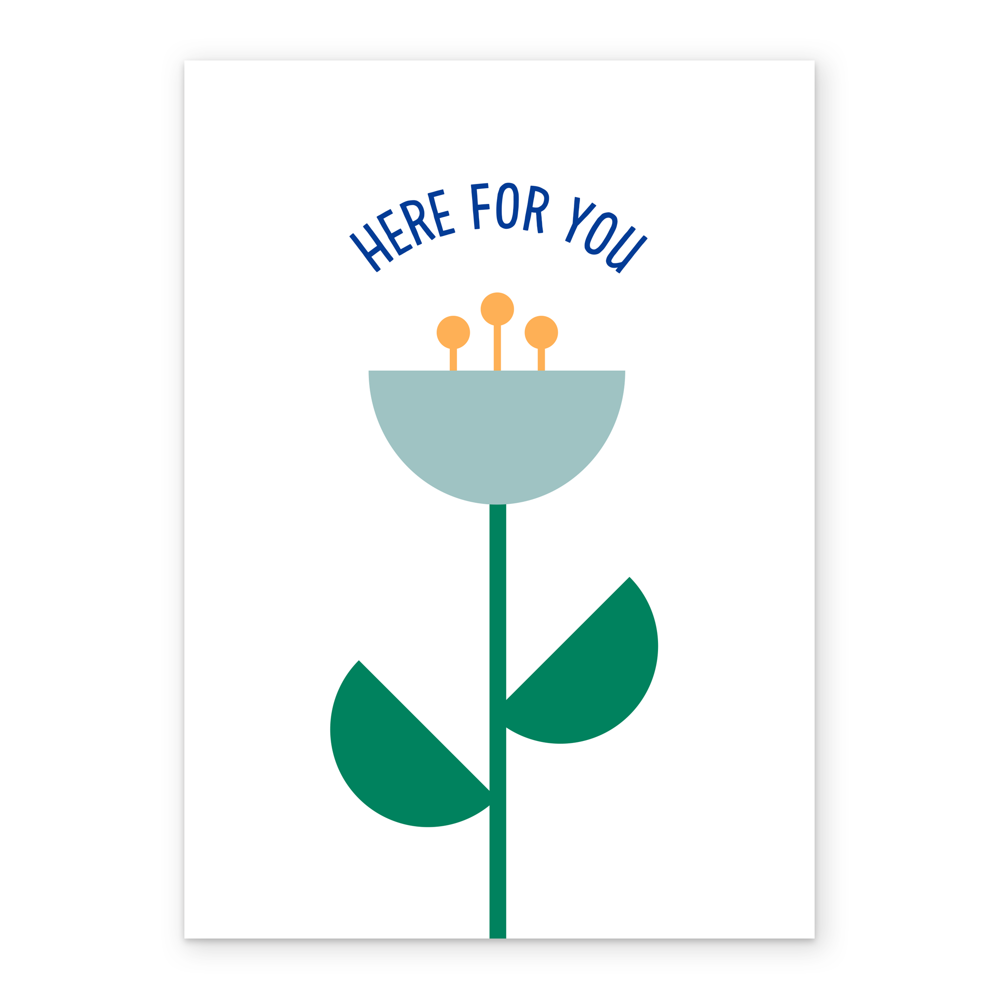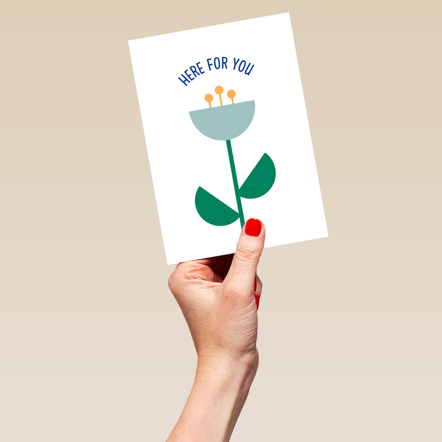 Printed on premium-quality board, this card features a contemporary styled flower, with the message 'Here For You', and comes complete with a co-ordinating white envelope.