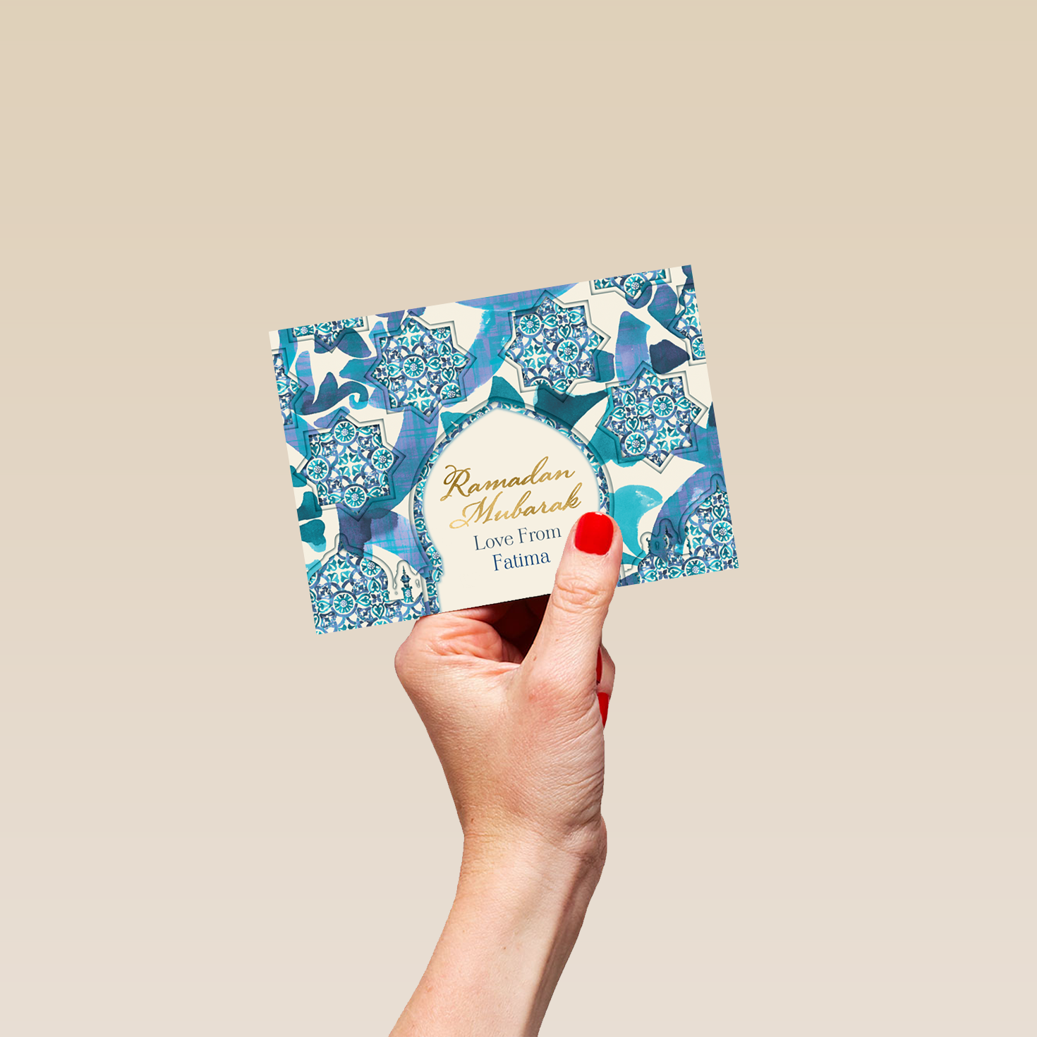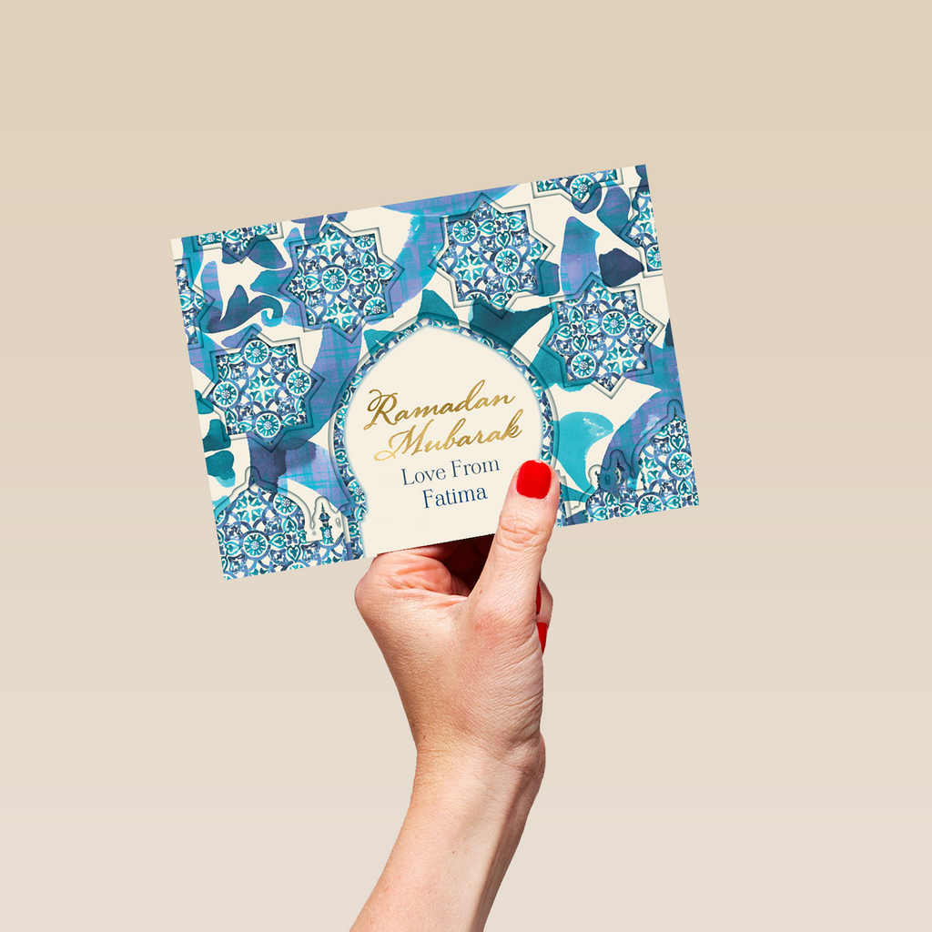 Printed on premium-quality board, this card features a blue, geometric design, with the message 'Ramadan Mubarak', space to personalise a name, and comes complete with a co-ordinating white envelope.