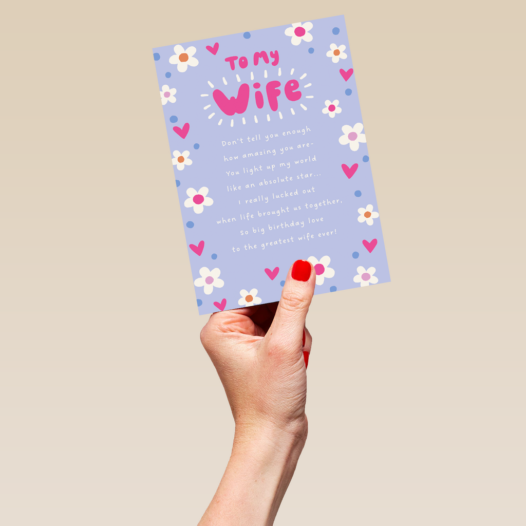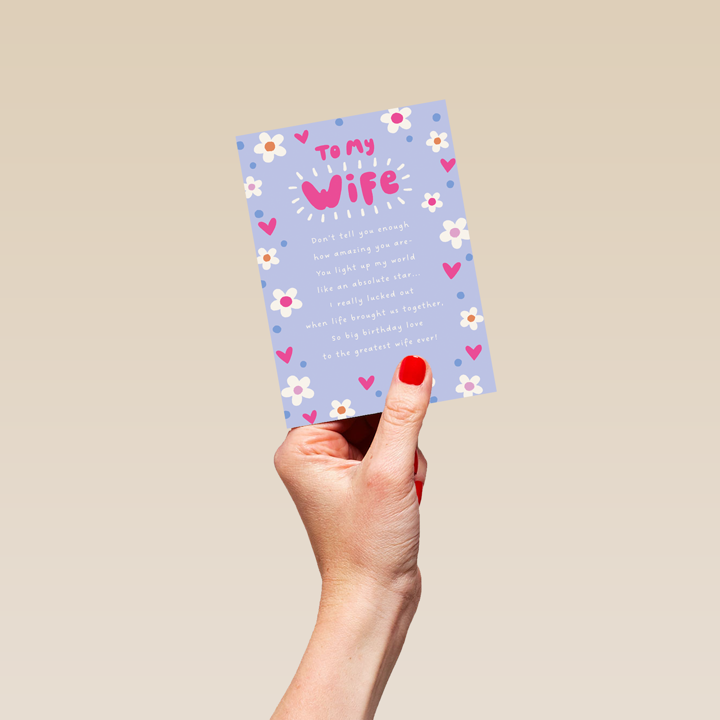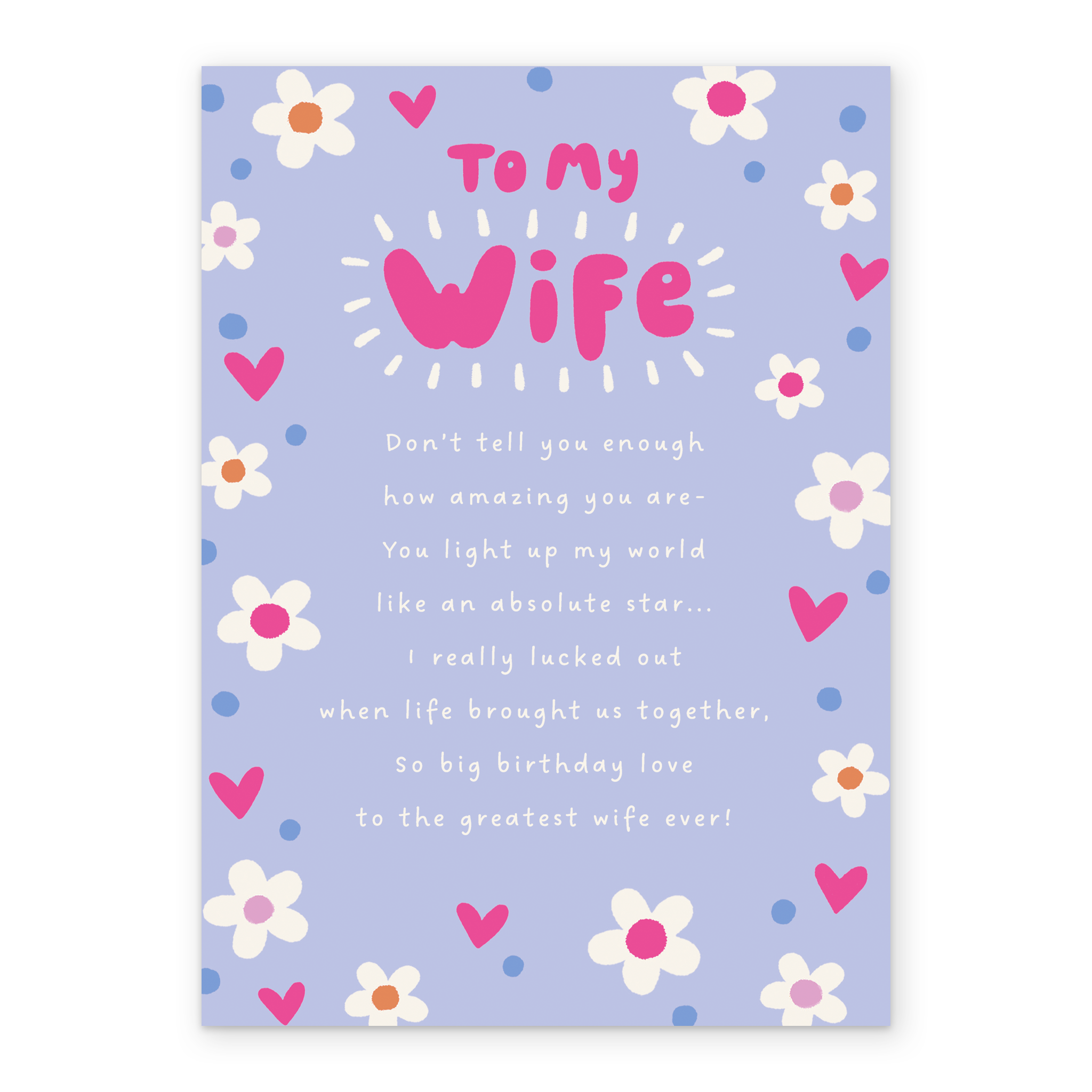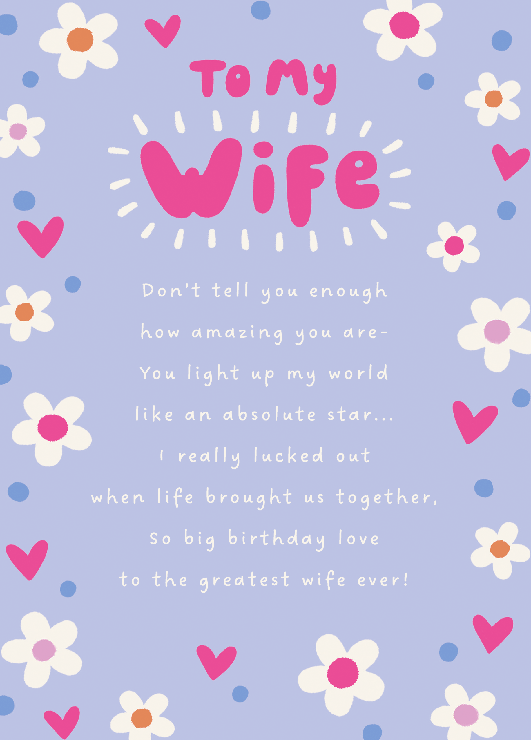 Printed on premium-quality board, this card features a blue background with white florals, hearts and a heartfelt verse, with the message 'To My Wife. Don't tell you enough how amazing you are - You light up my world like an absolute star… I really lucked out when life brought us together, So big birthday love to the greatest wife ever!', and comes complete with a co-ordinating white envelope.