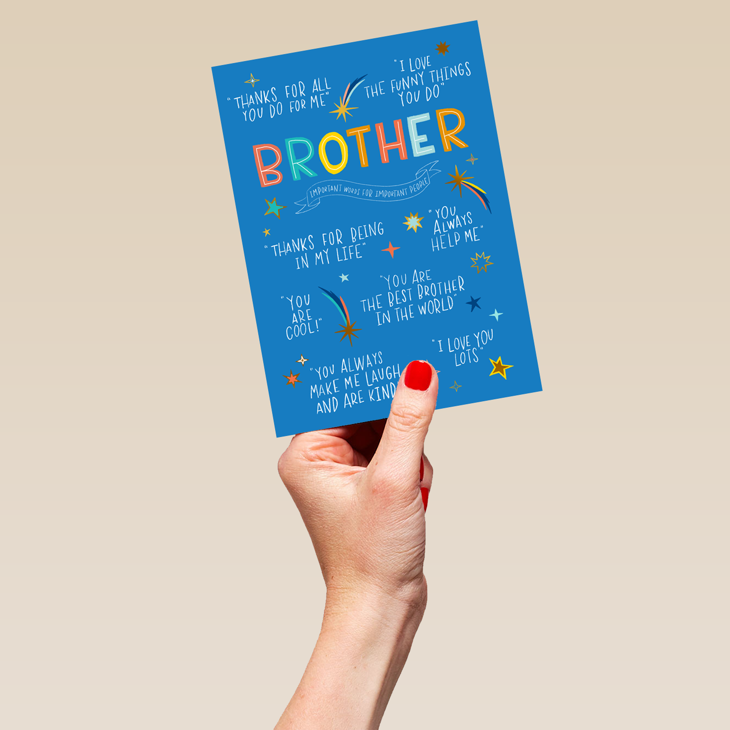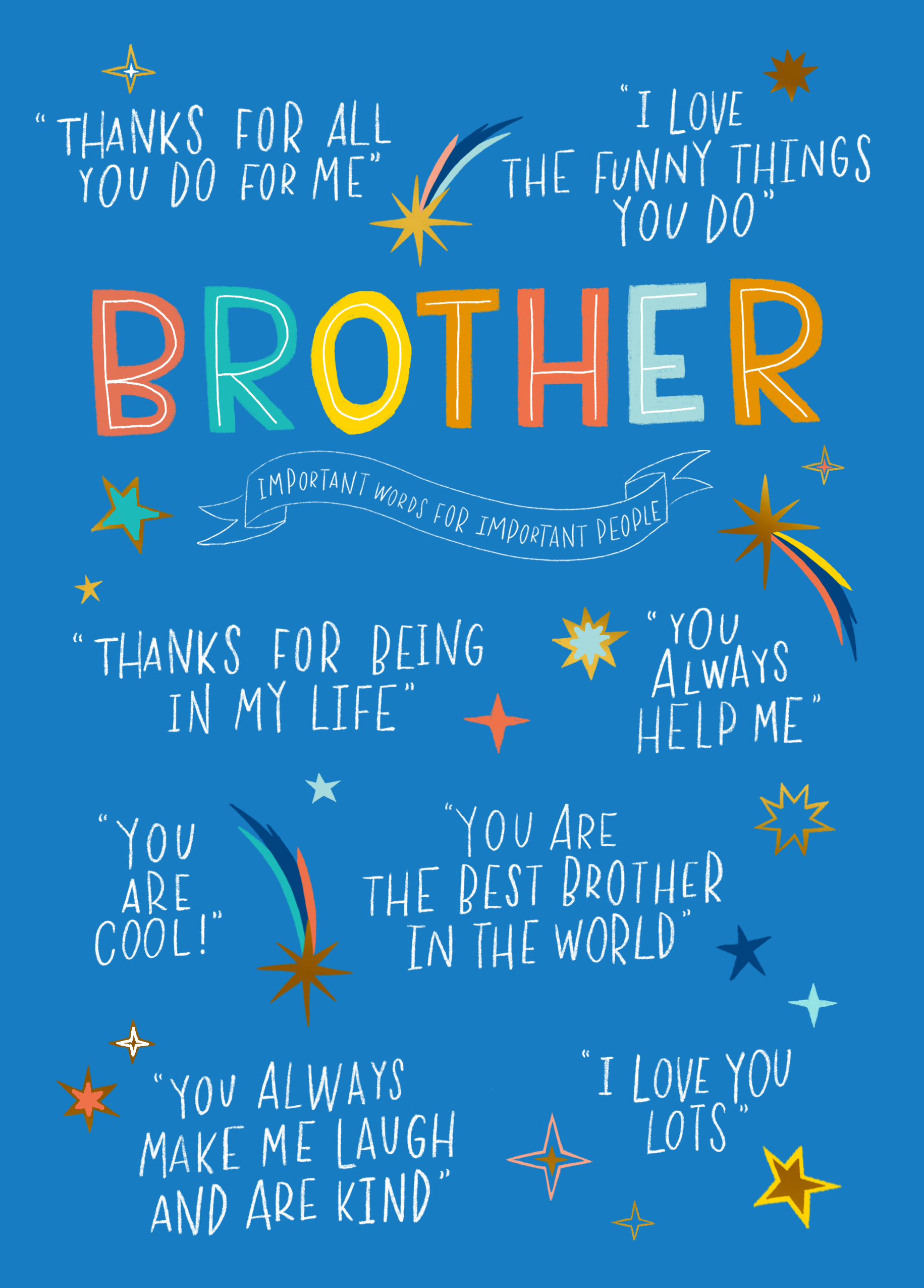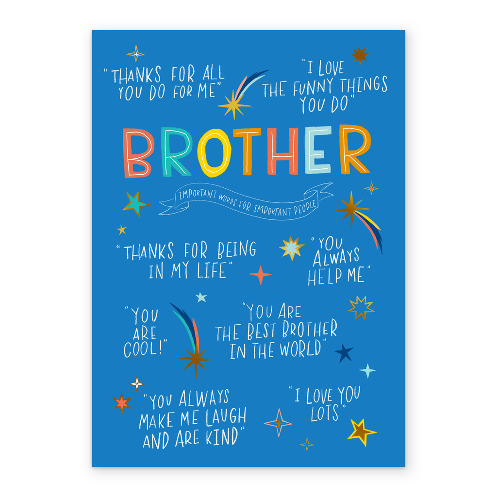 Printed on premium-quality board, this card features a blue background with stars, with the message 'Brother Important words for important people. 'Thanks for all you do for me' 'I love the funny things you do' 'Thanks for being in m life' 'You always help me' 'You are cool' 'You are the best brother in the world' 'You always make me laugh and are kind' 'I love you lots', and comes complete with a co-ordinating white envelope.