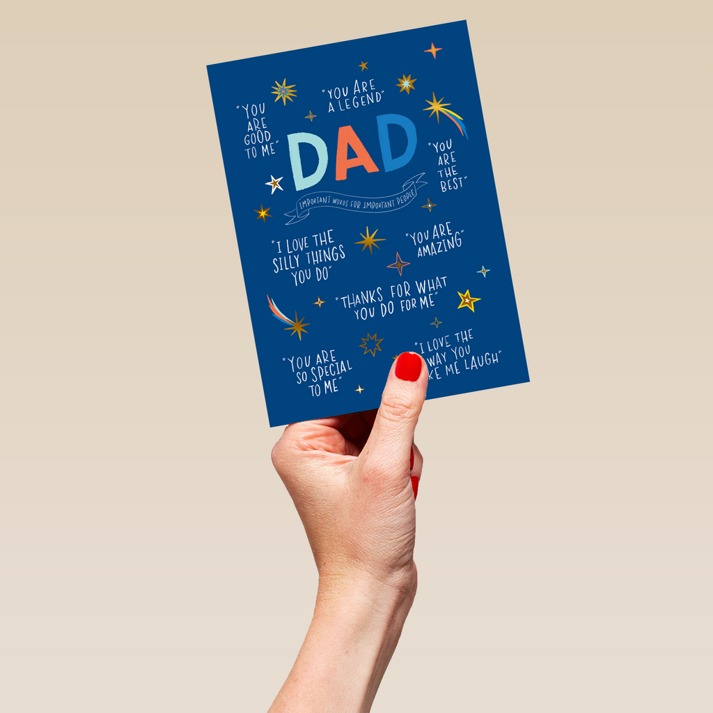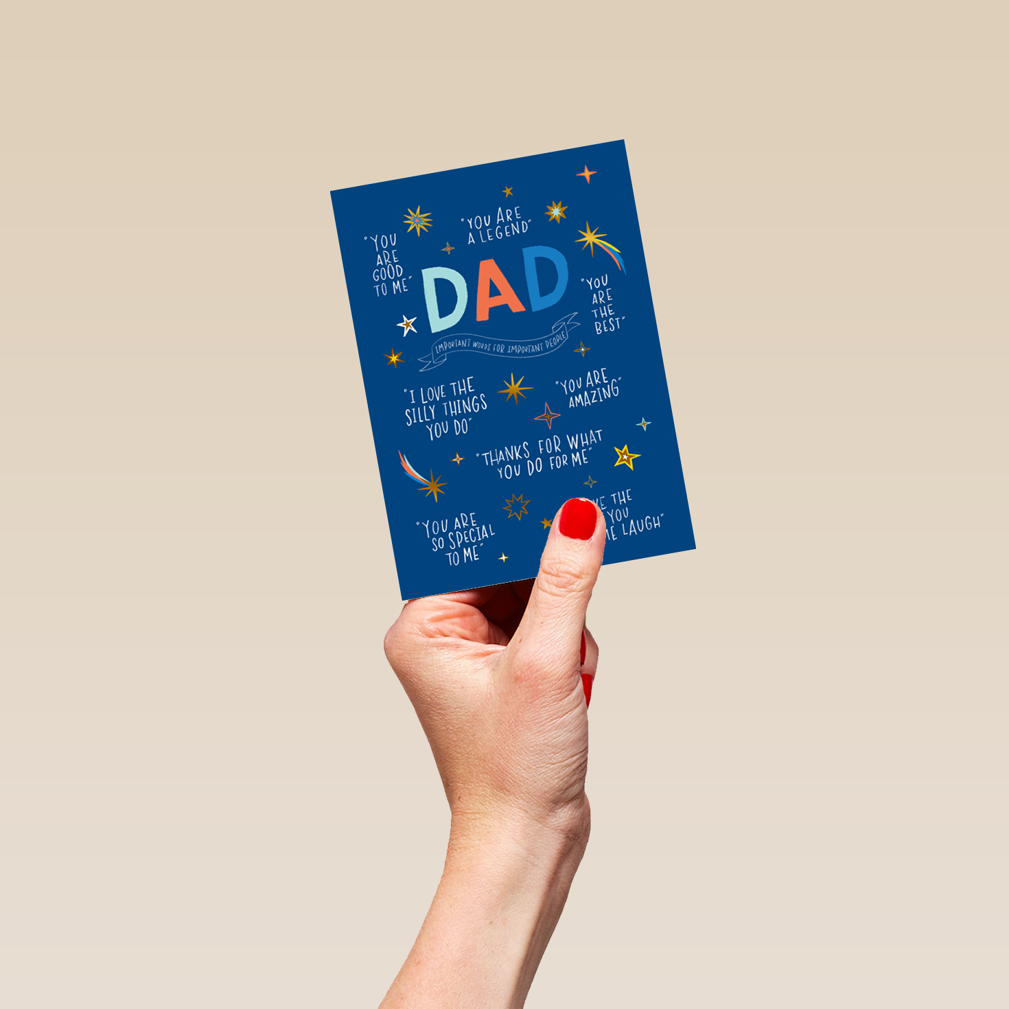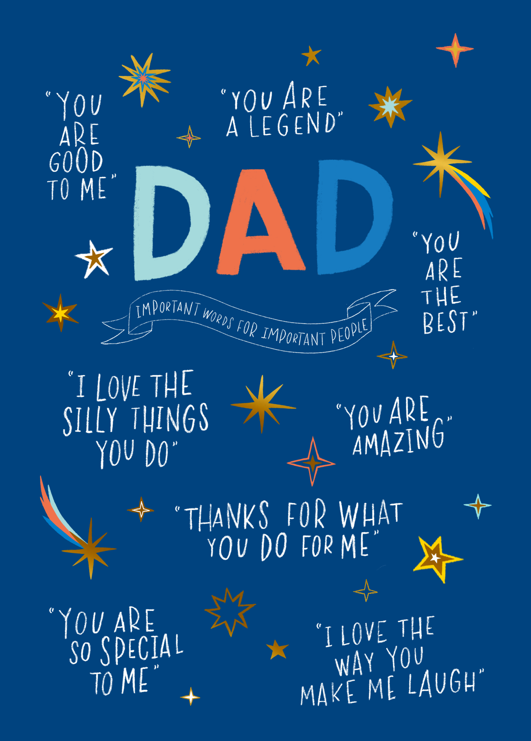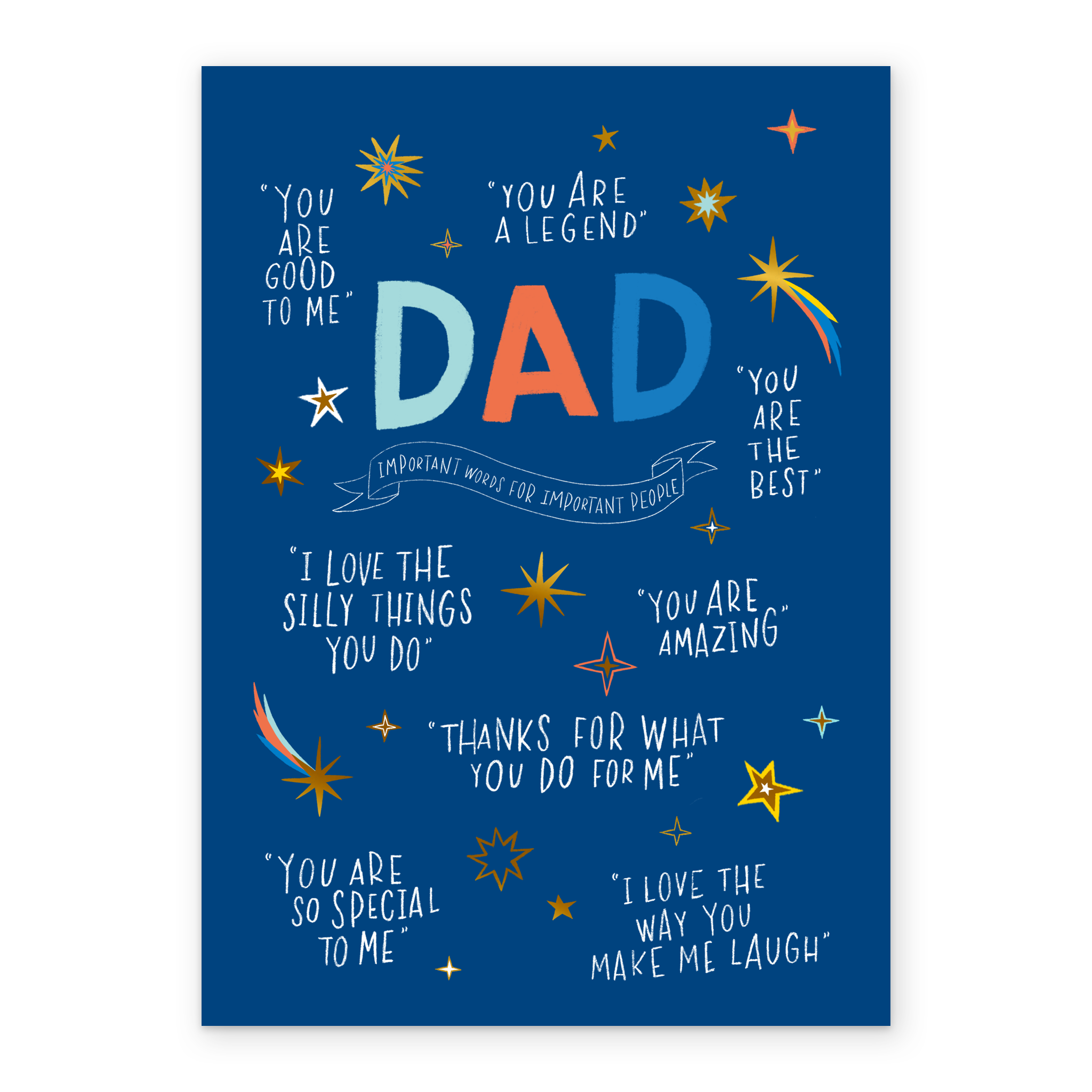 Printed on premium-quality board, this card features a blue background with stars, with the message 'Dad Important words for important people. 'You are good to me' 'You are a legend' 'I love the silly things you do' 'You are amazing' 'Thanks for what you do for me' 'You are special to me' 'I love the way you make me laugh', and comes complete with a co-ordinating white envelope.