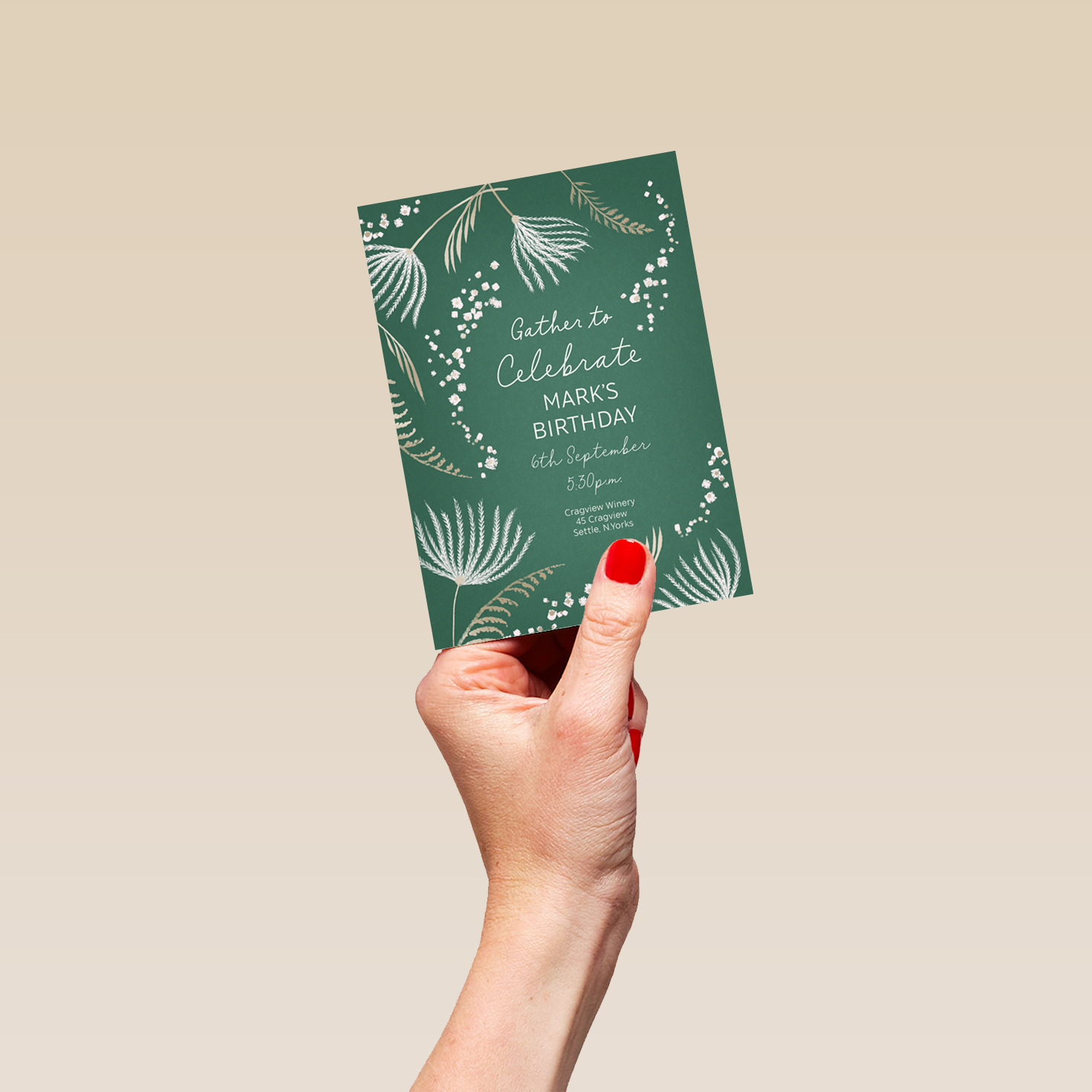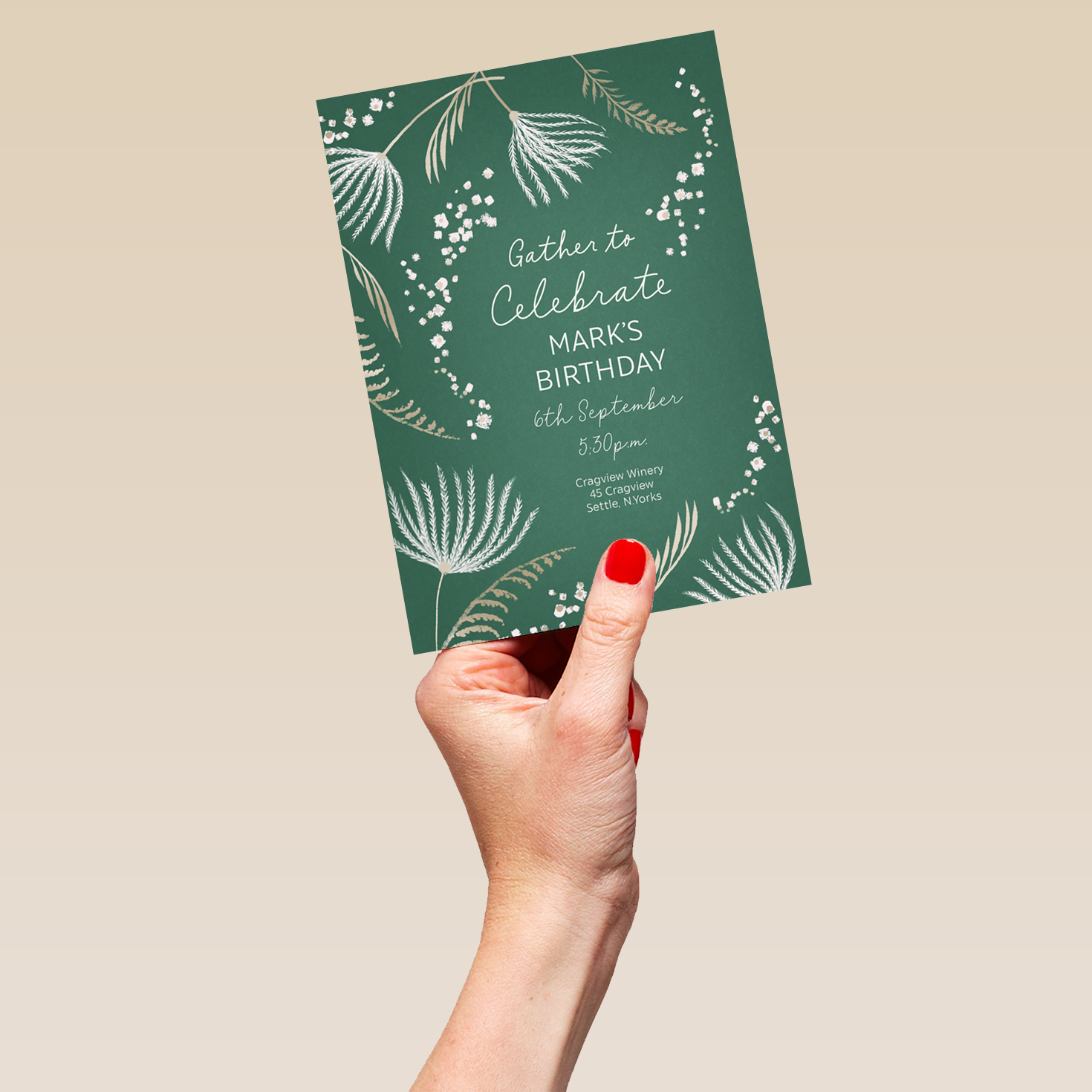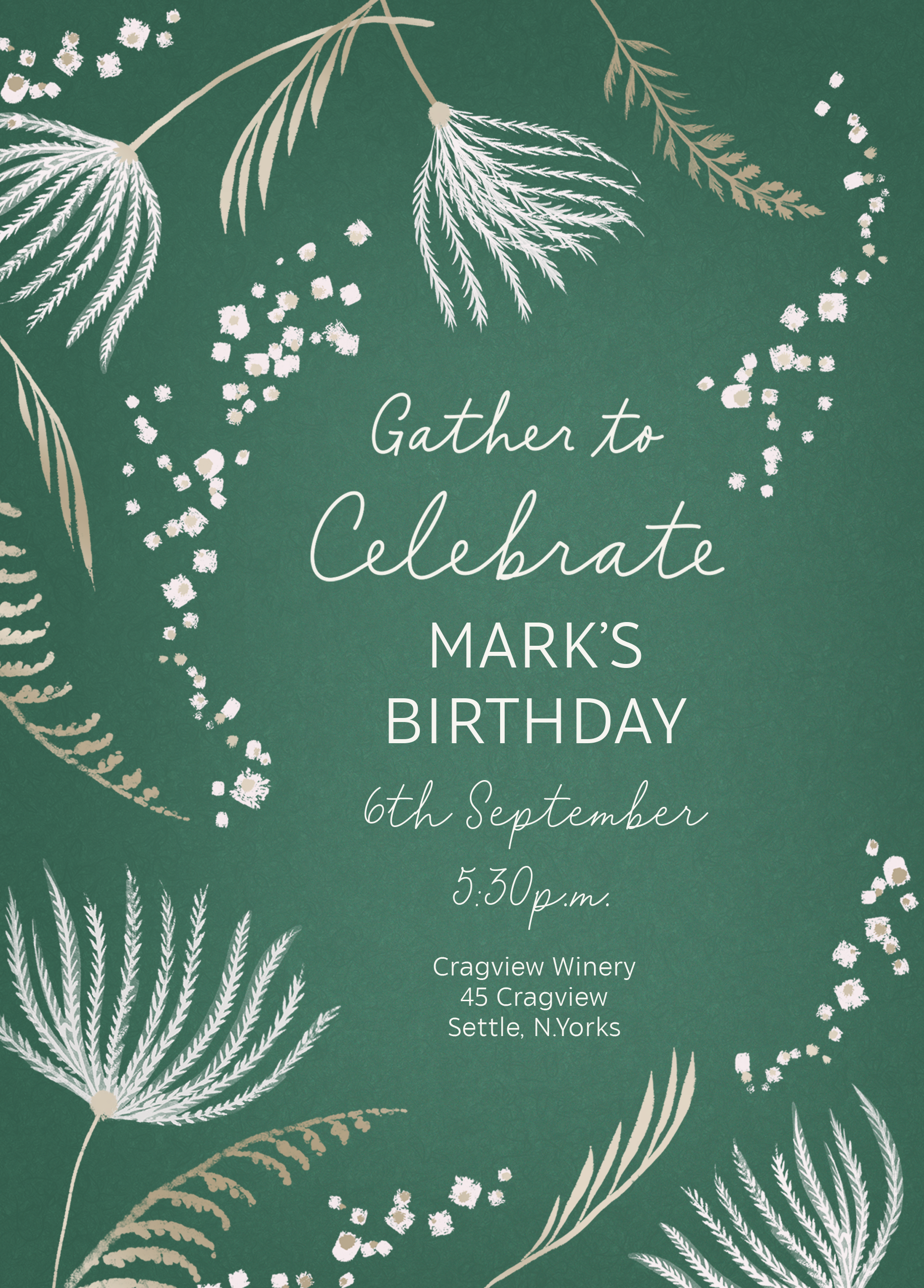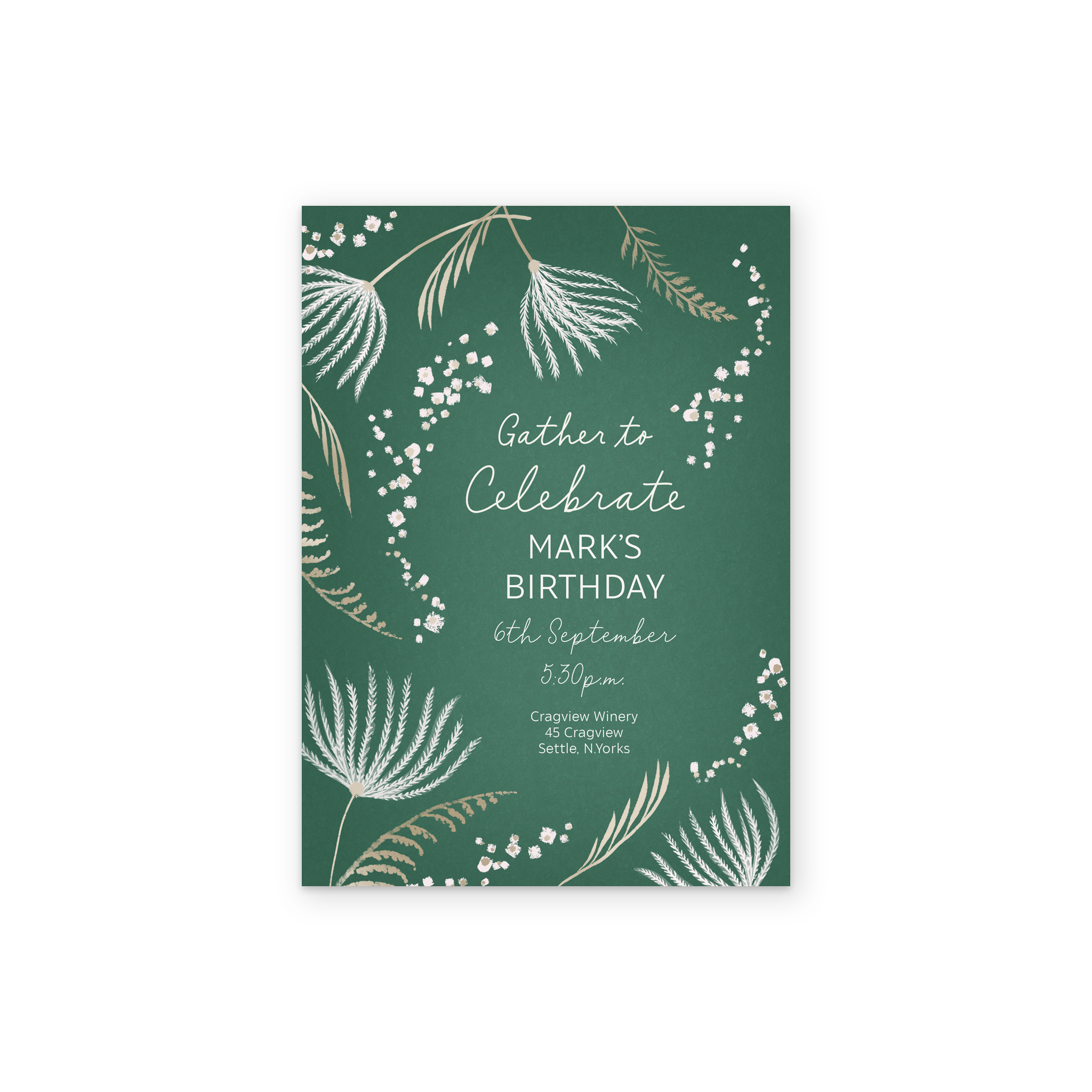 Printed on premium-quality board, this card features a deep green background overlaid with white and cream seed and grass silhouettes and white lettering, with the message 'Gather to celebrate [NAME]'s Birthday [DATE] [ADDRESS]', space to personalise your message, and comes complete with a co-ordinating white envelope.