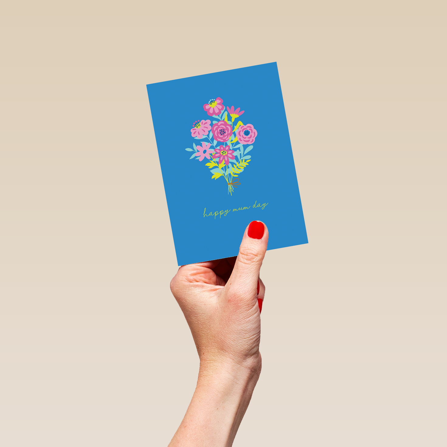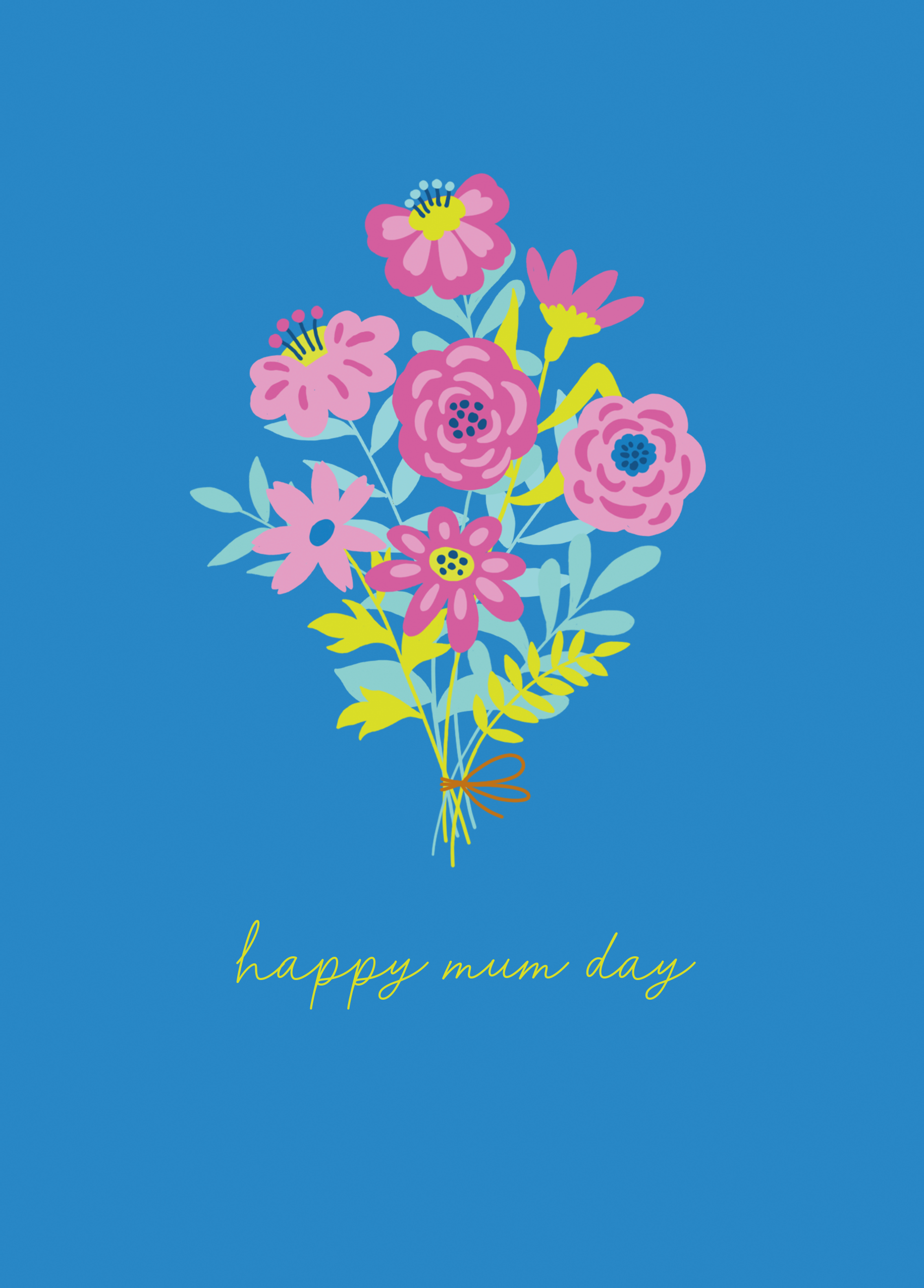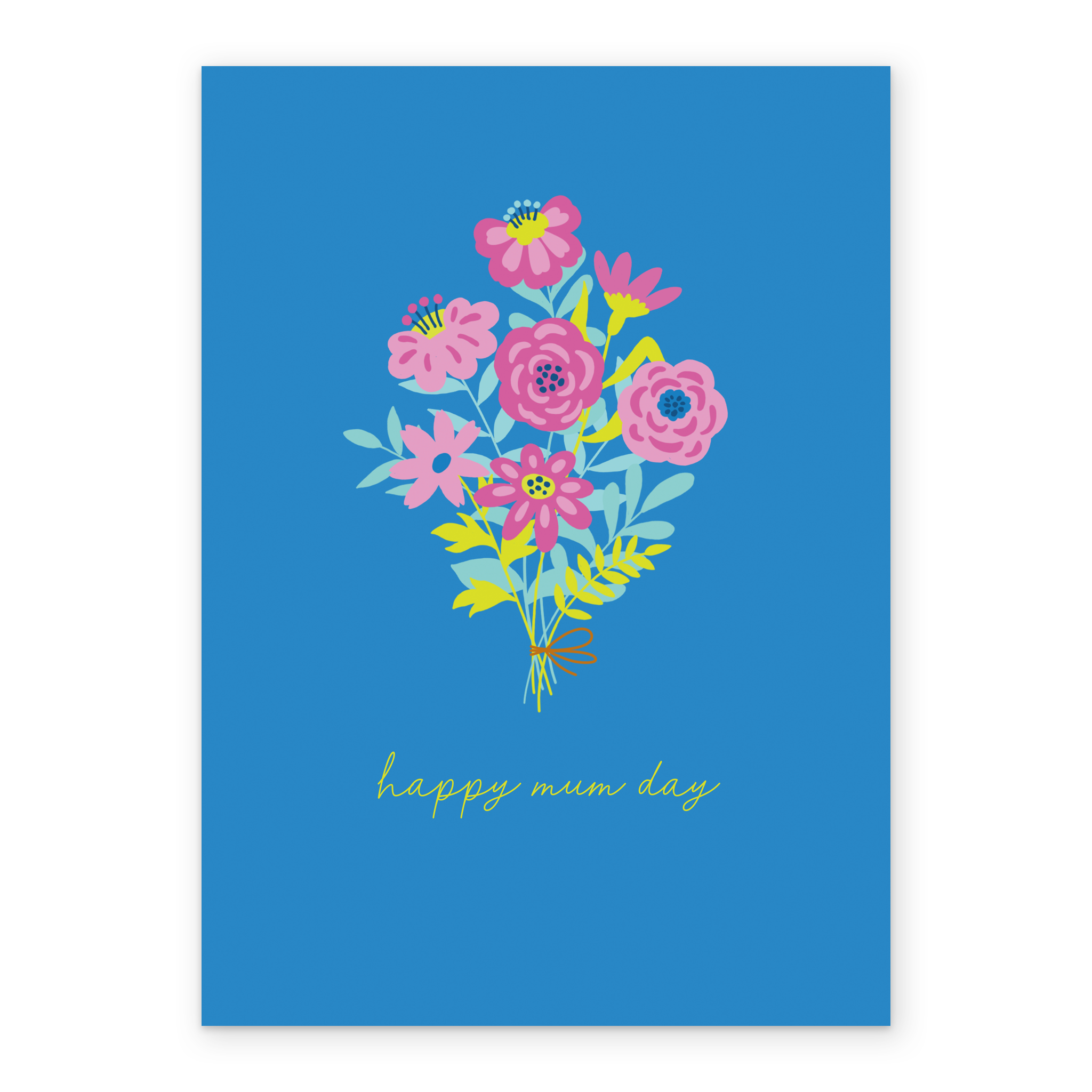 Printed on premium-quality board, this card features a bright blue background with a vibrant illustrated flower bouquet in pinks and blues in the centre above bright yellow, handwritten style lettering, with the message 'Happy Mum Day', space to personalise your message, and comes complete with a co-ordinating white envelope.