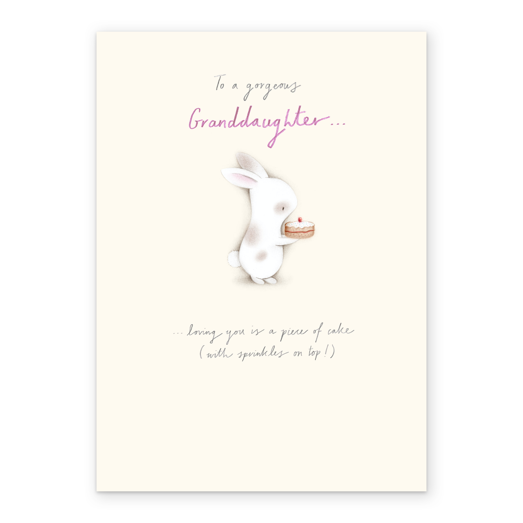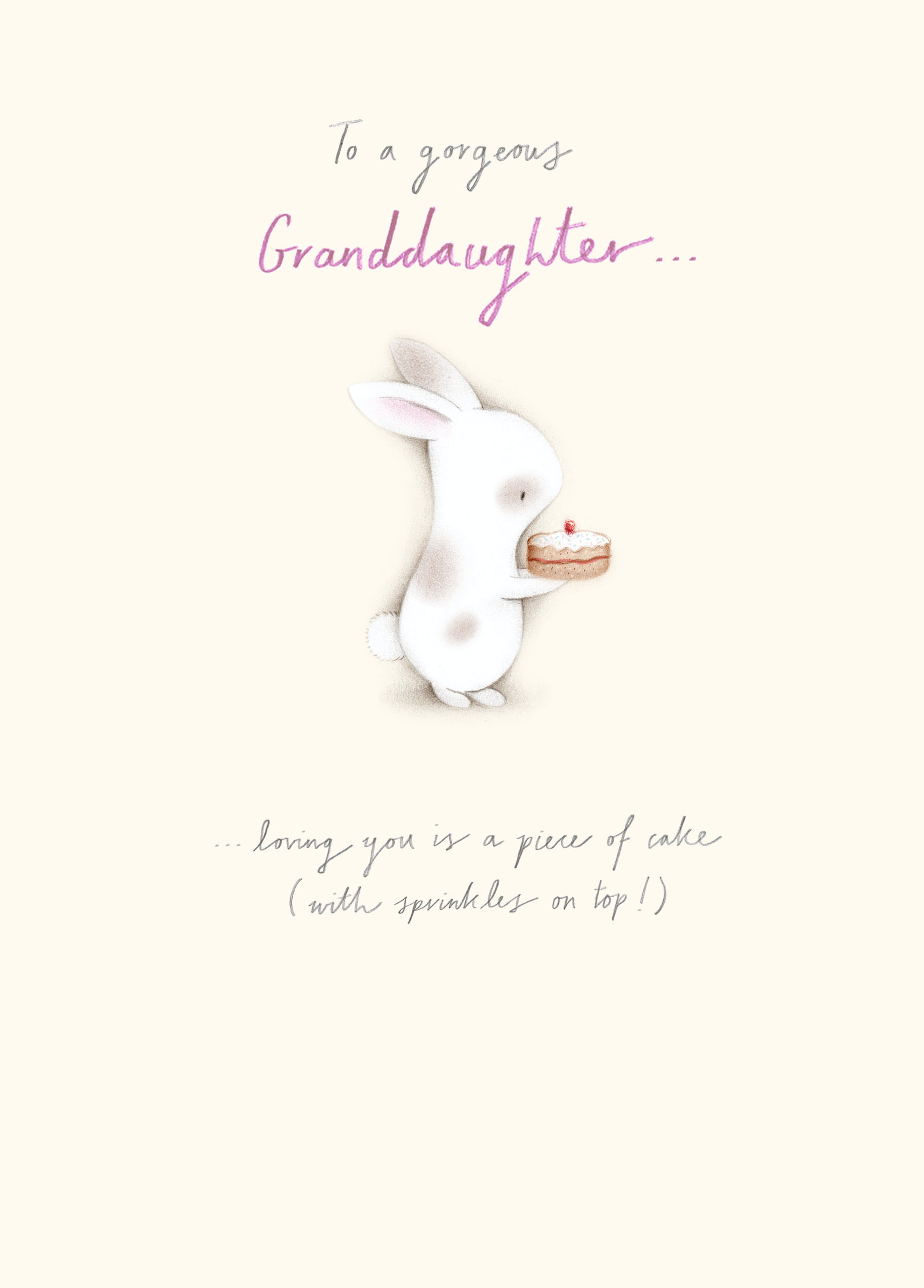 Show them you care with a personalised bunny rabbit cake birthday card for granddaughter from Hallmark. Our birthday cards are printed on premium quality, FSC®-certified card & delivered nationwide. This card is available as standard 12cm by 16.7cm and large 15.5cm by 21.6cm.