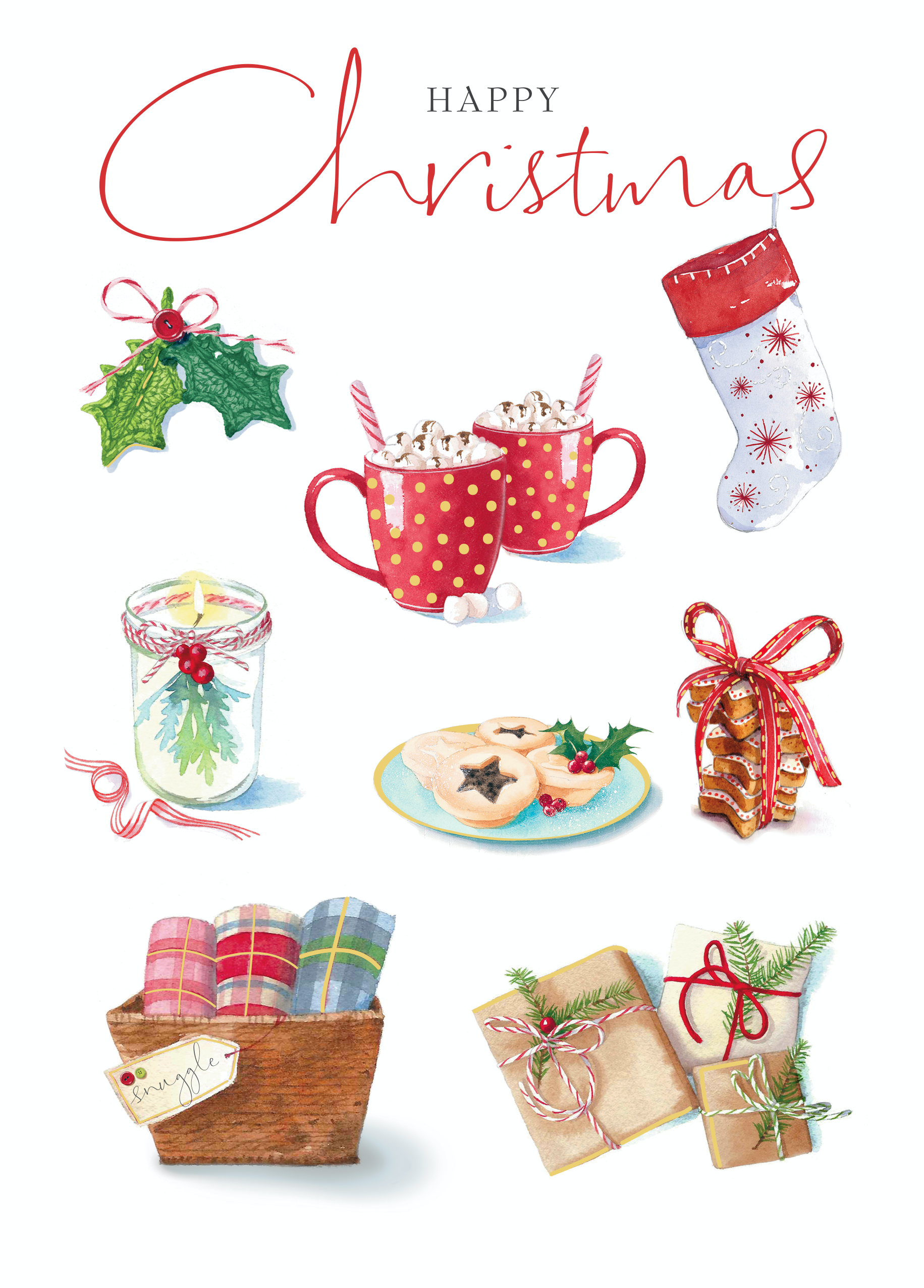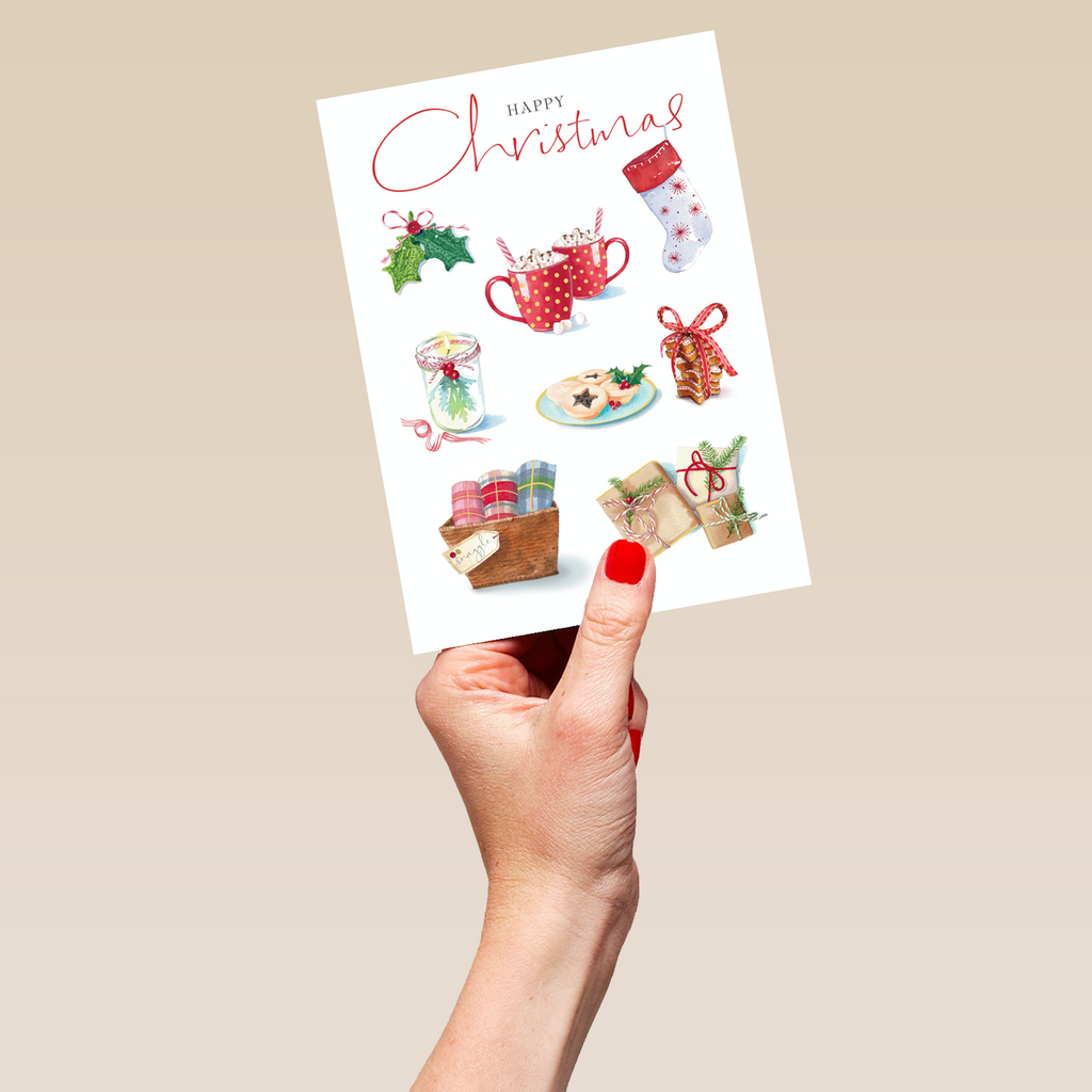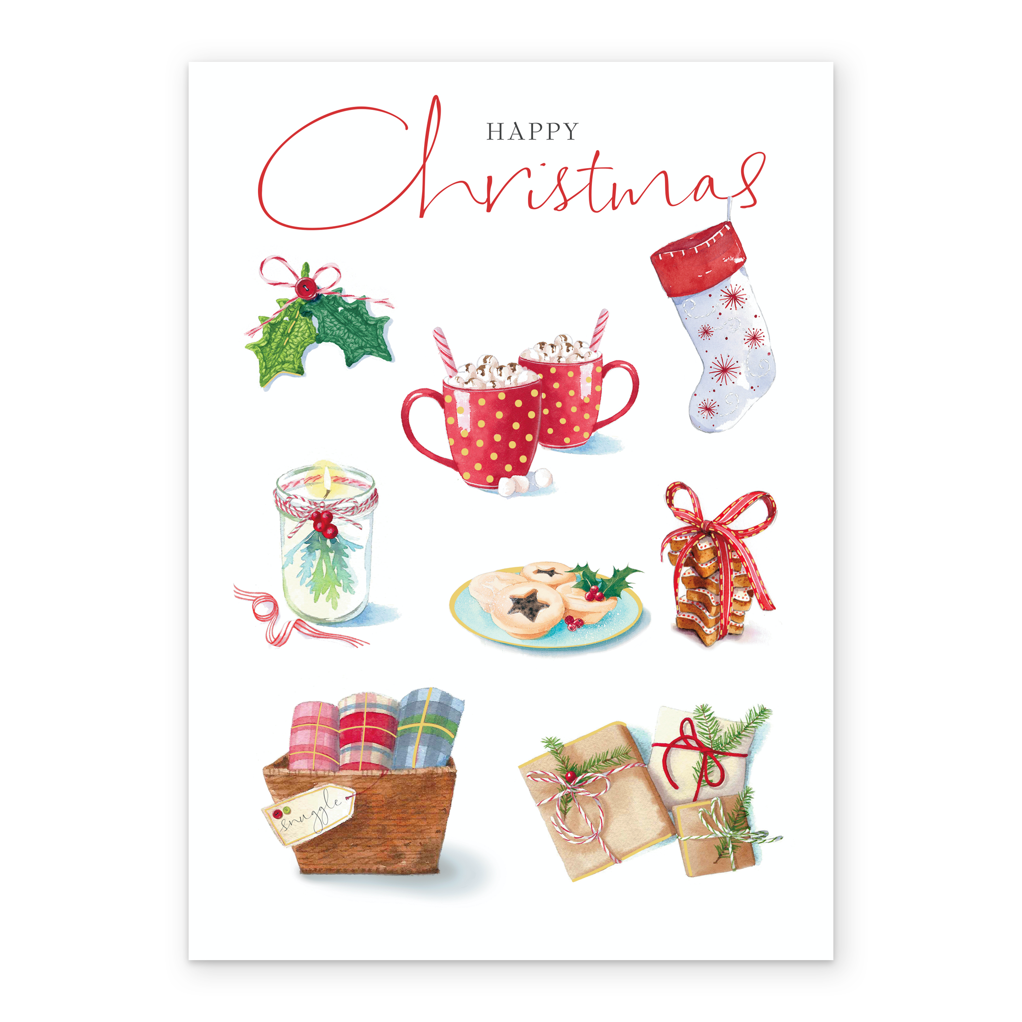 Printed on premium-quality board, this card features illustrations of classic Christmas traditions, and the message 'Happy Christmas'.