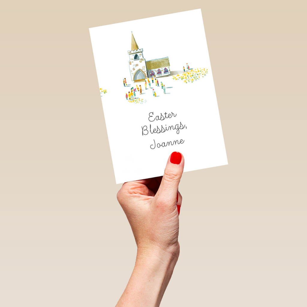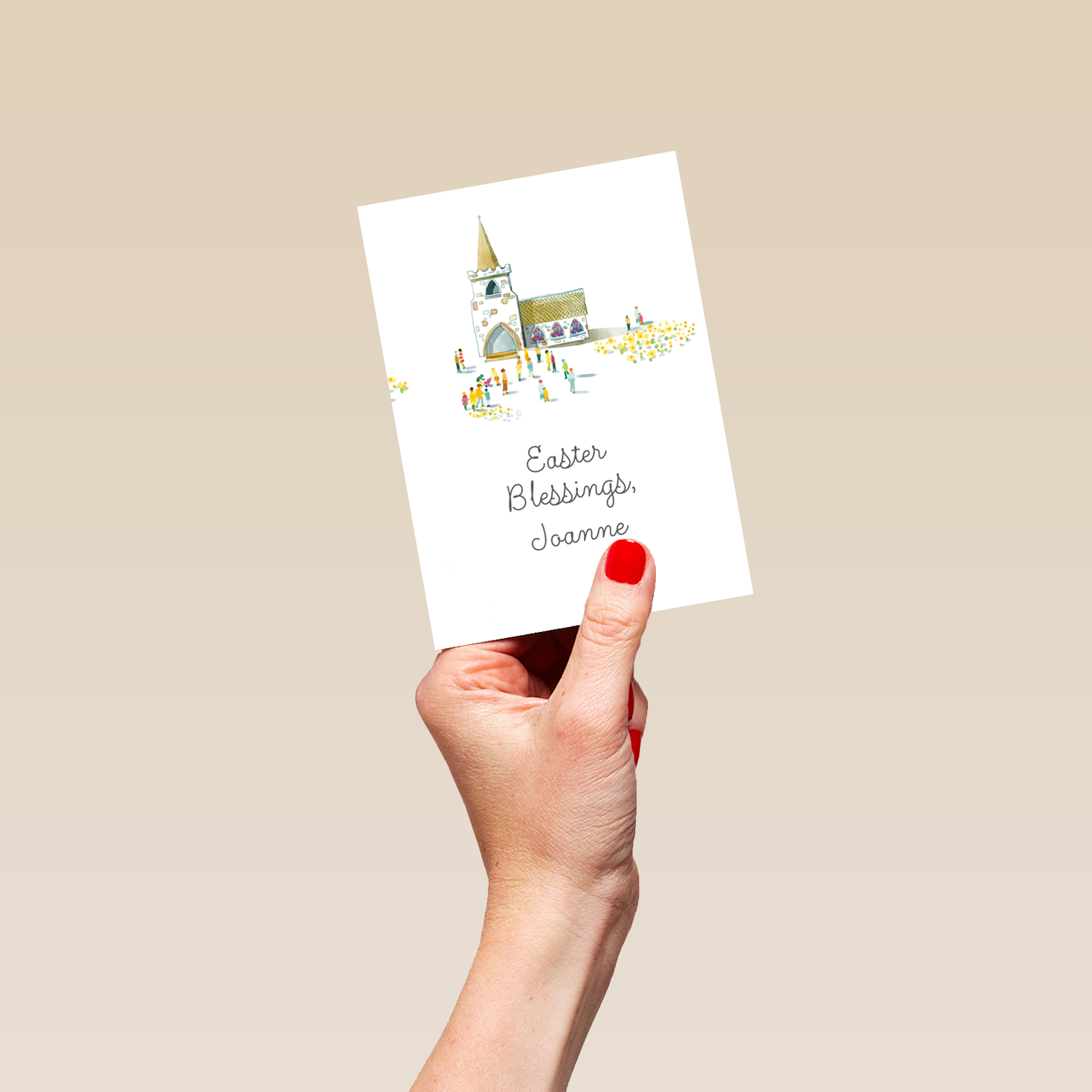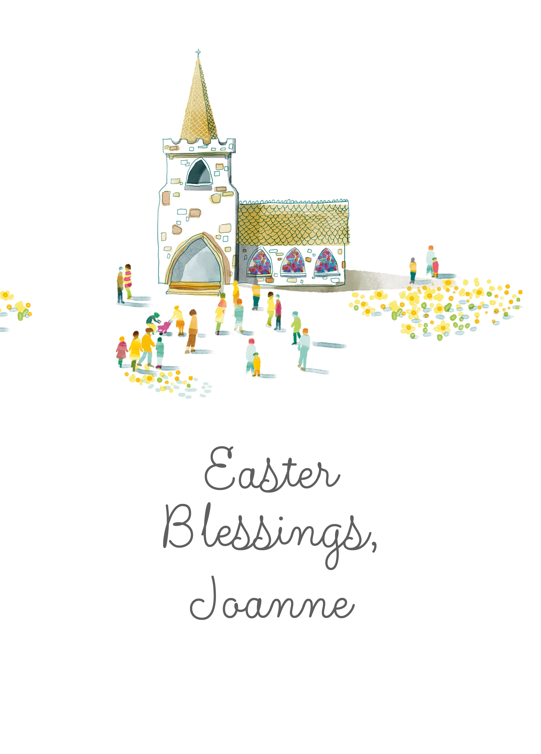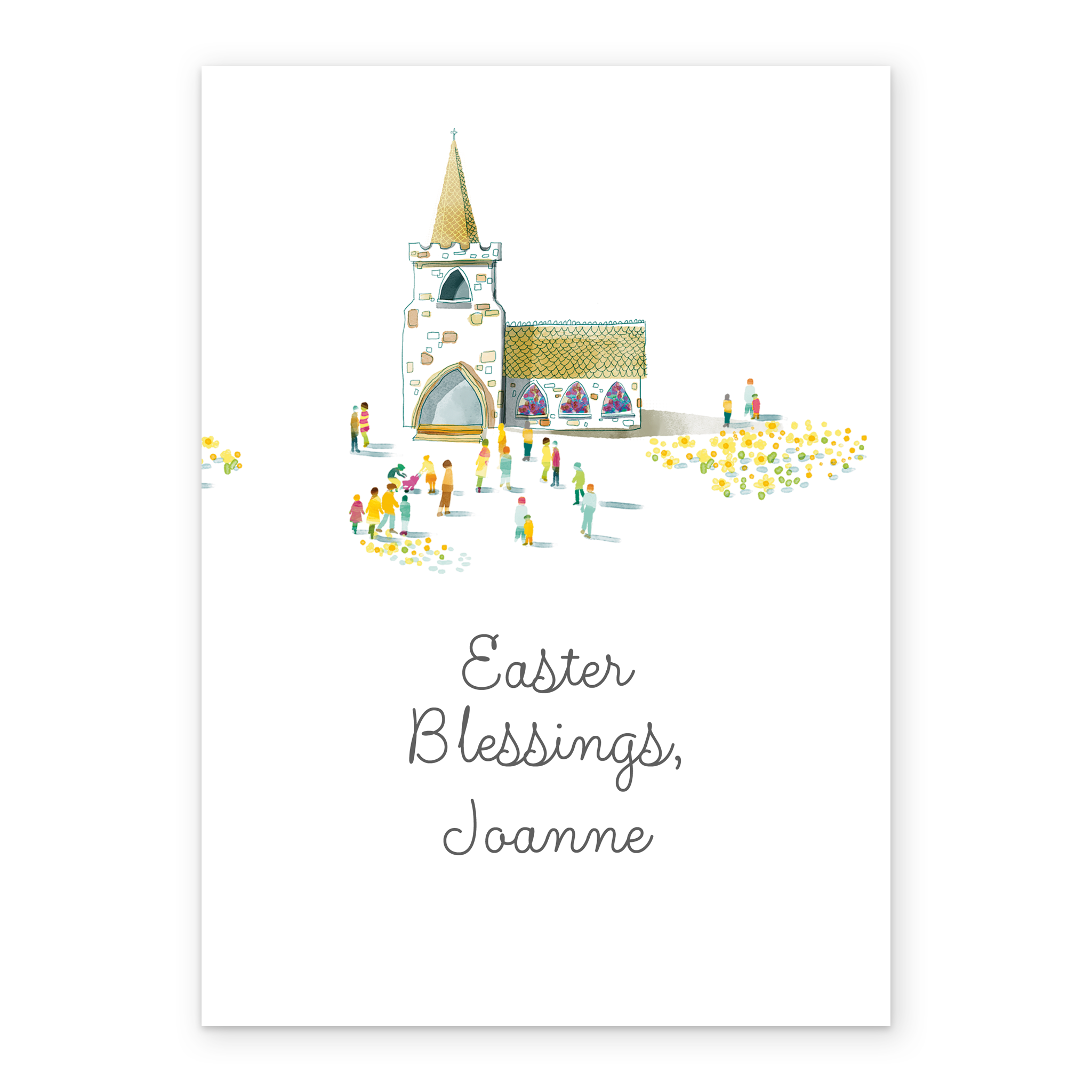 Printed on premium-quality board, this card features an illustrated church on Easter Morning, surrounded by beautiful yellow spring flowers and the congregation as they arrive for mass, with the message 'Easter blessings,', space to personalise a name, and comes complete with a co-ordinating white envelope.