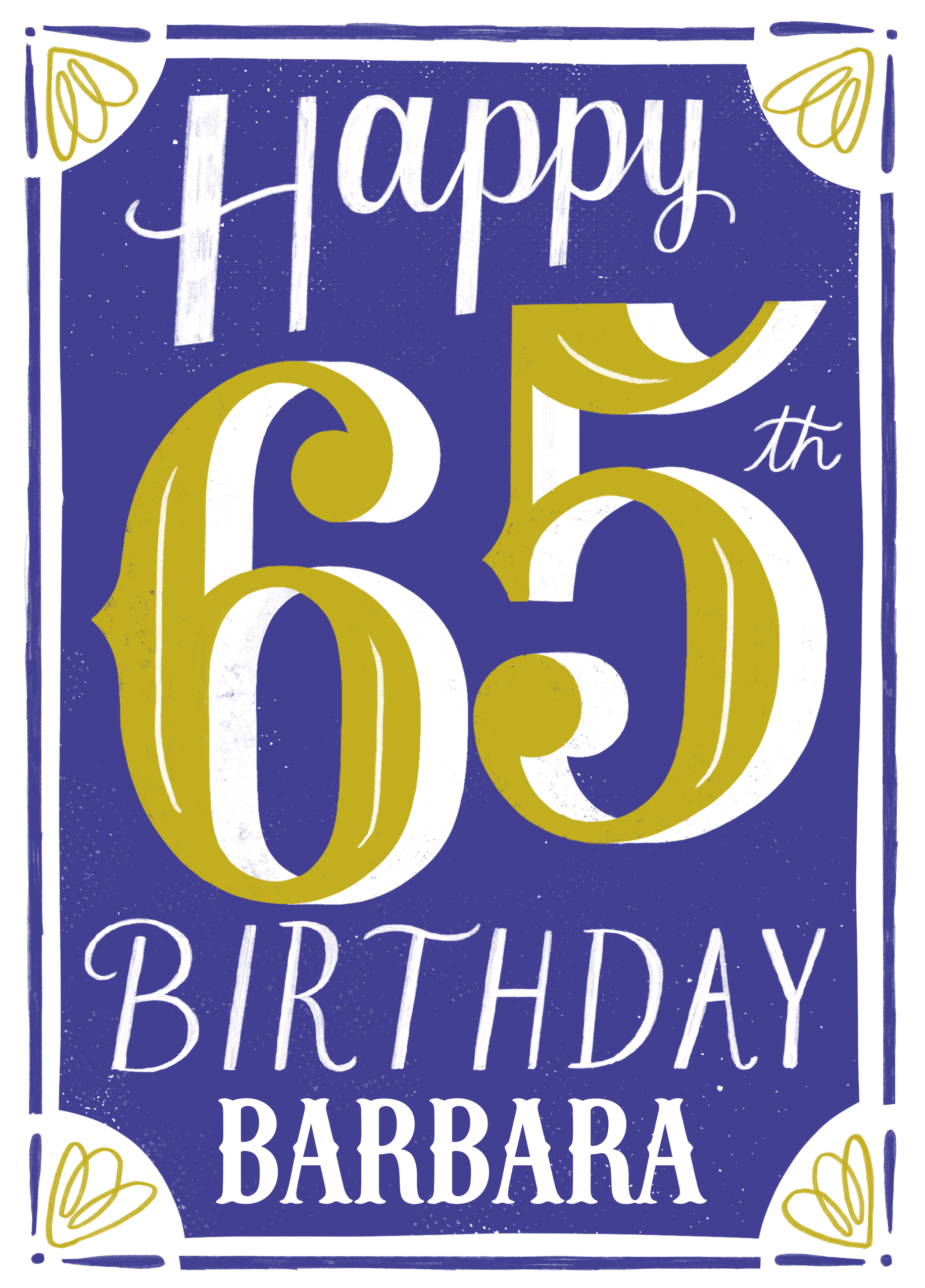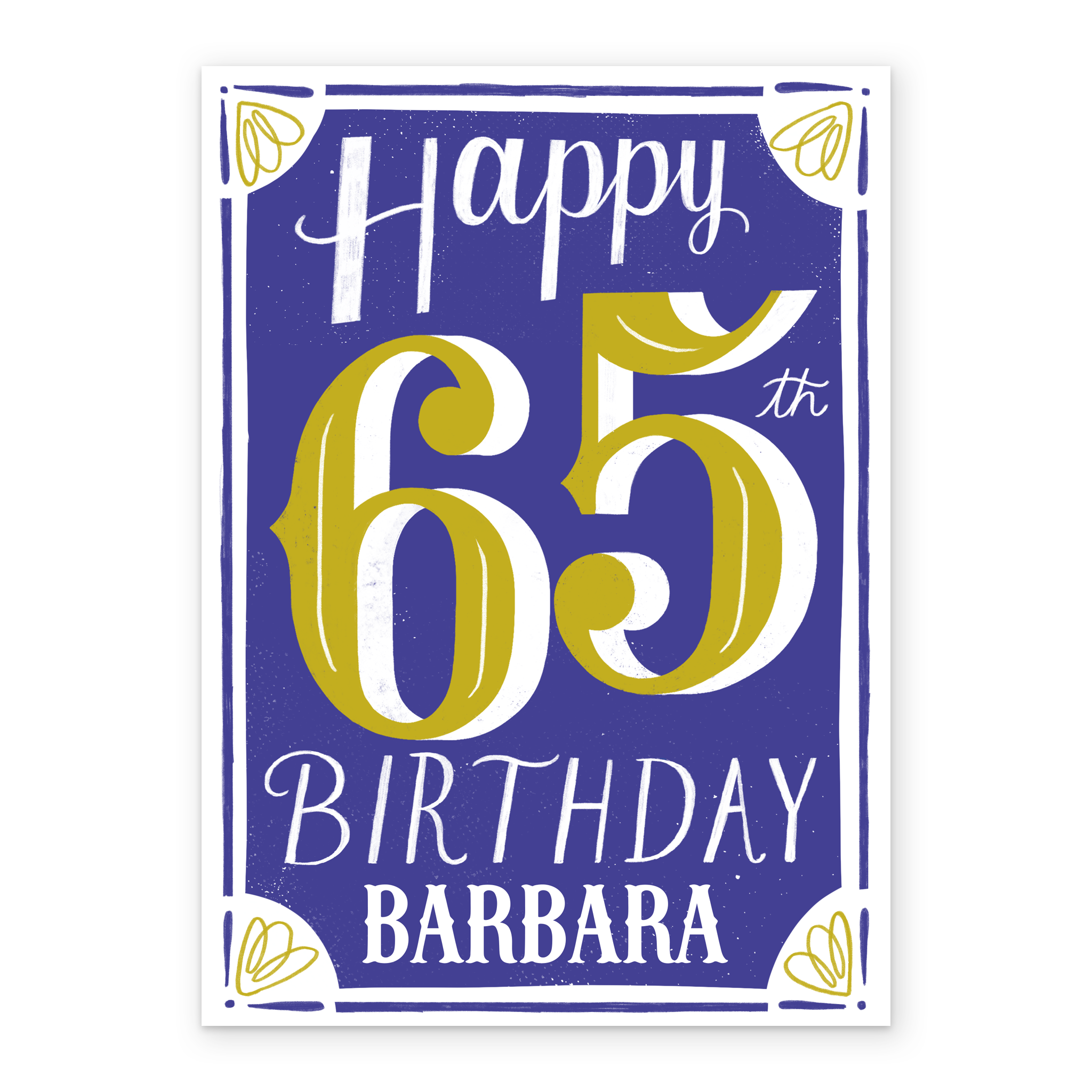Printed on premium-quality board, this card features classic yellow and white text on a blue background with white frame and illustrated yellow floral decoration, with the message 'Happy 65th Birthday', space to personalise a name, and comes complete with a co-ordinating white envelope.