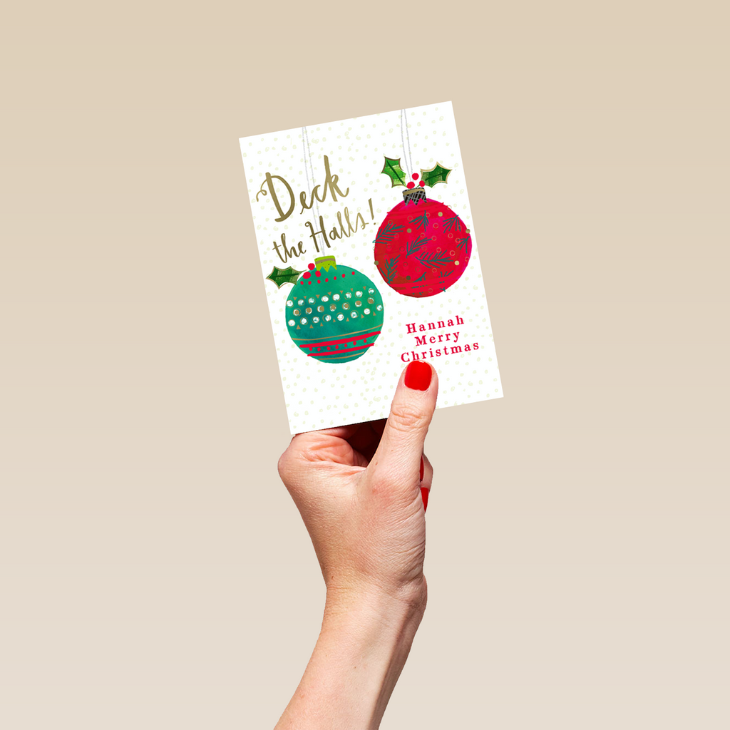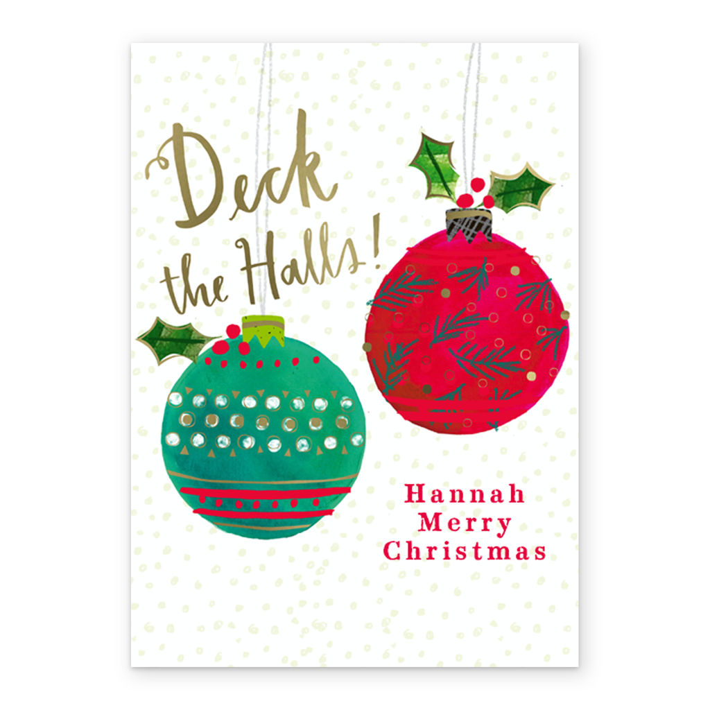 Personalised Classic Baubles and Holly Green & Red Christmas Card