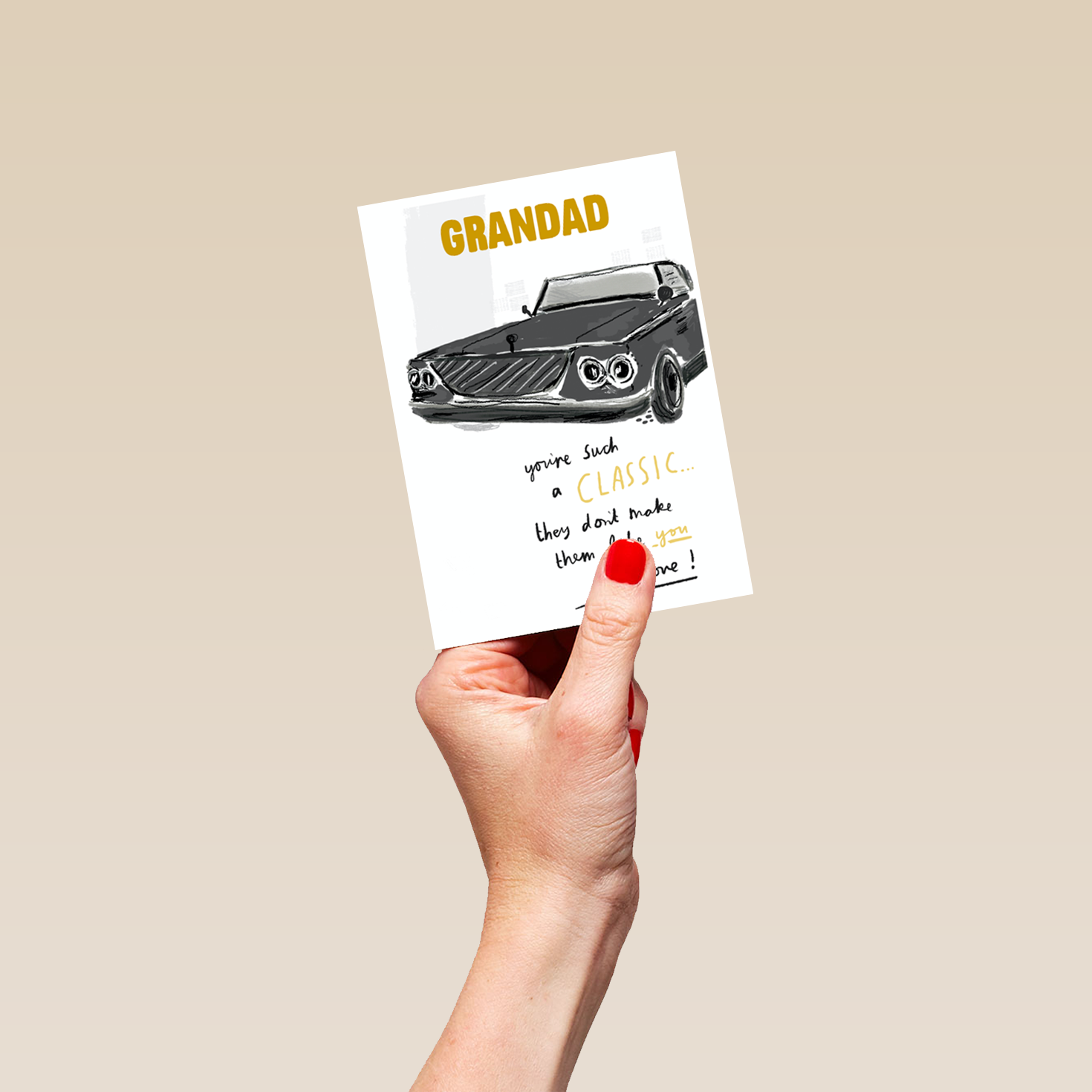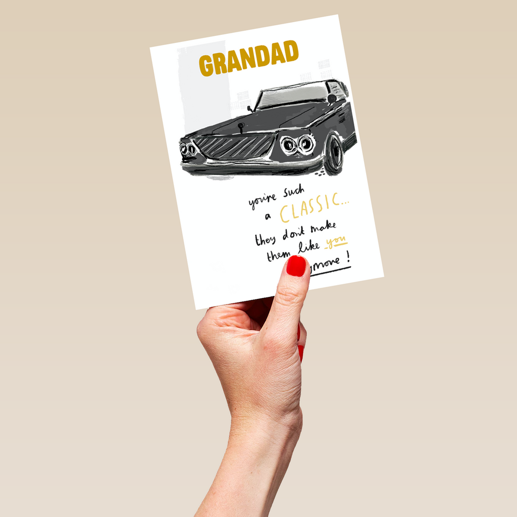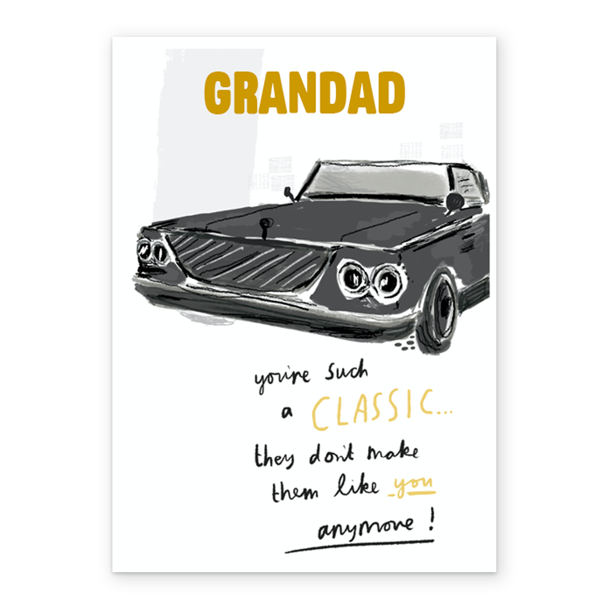 Show them you care with a personalised classic car Father's Day grandad card from Hallmark. Our greetings cards are printed on premium quality, FSC®-certified card & delivered nationwide.This card is available as standard 12cm by 16.7cm and large 15.5cm by 21.6cm.