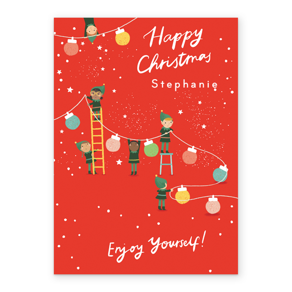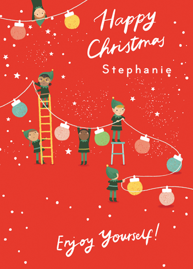 Show them you care with a personalised classic Christmas cute elves decorating card from Hallmark. Our greetings cards are printed on premium quality, FSC®-certified card & delivered nationwide. This card is available as standard 12cm by 16.7cm and large 15.5cm by 21.6cm.