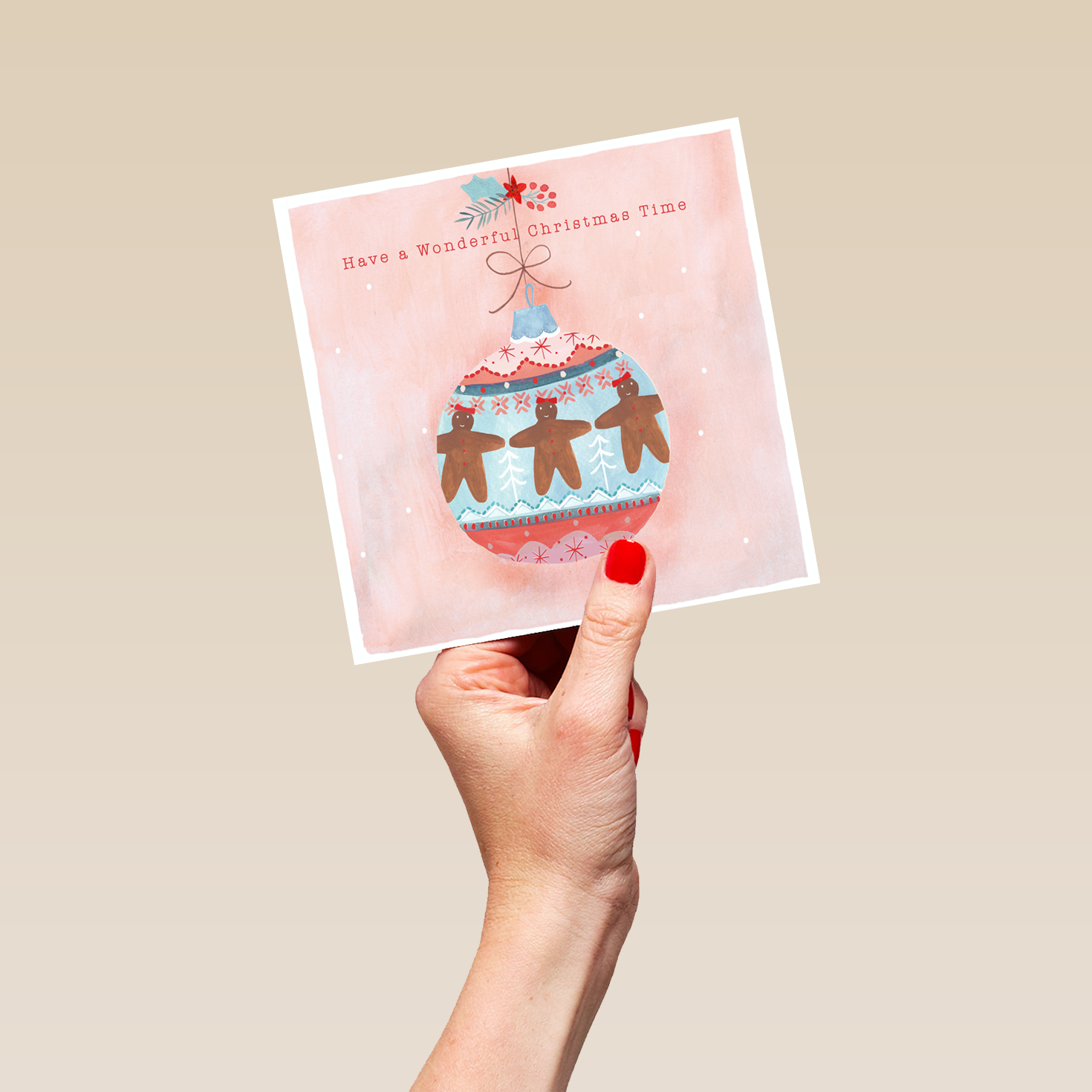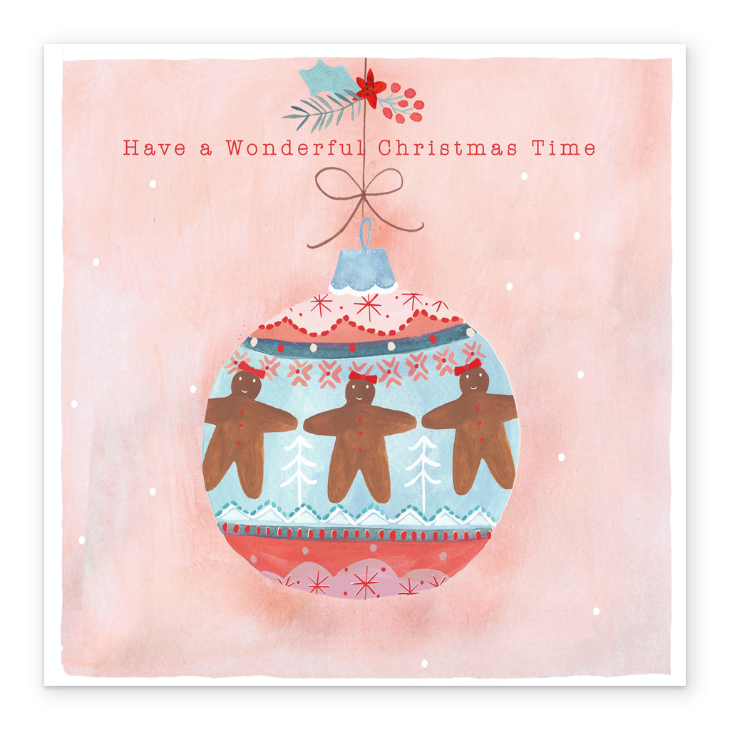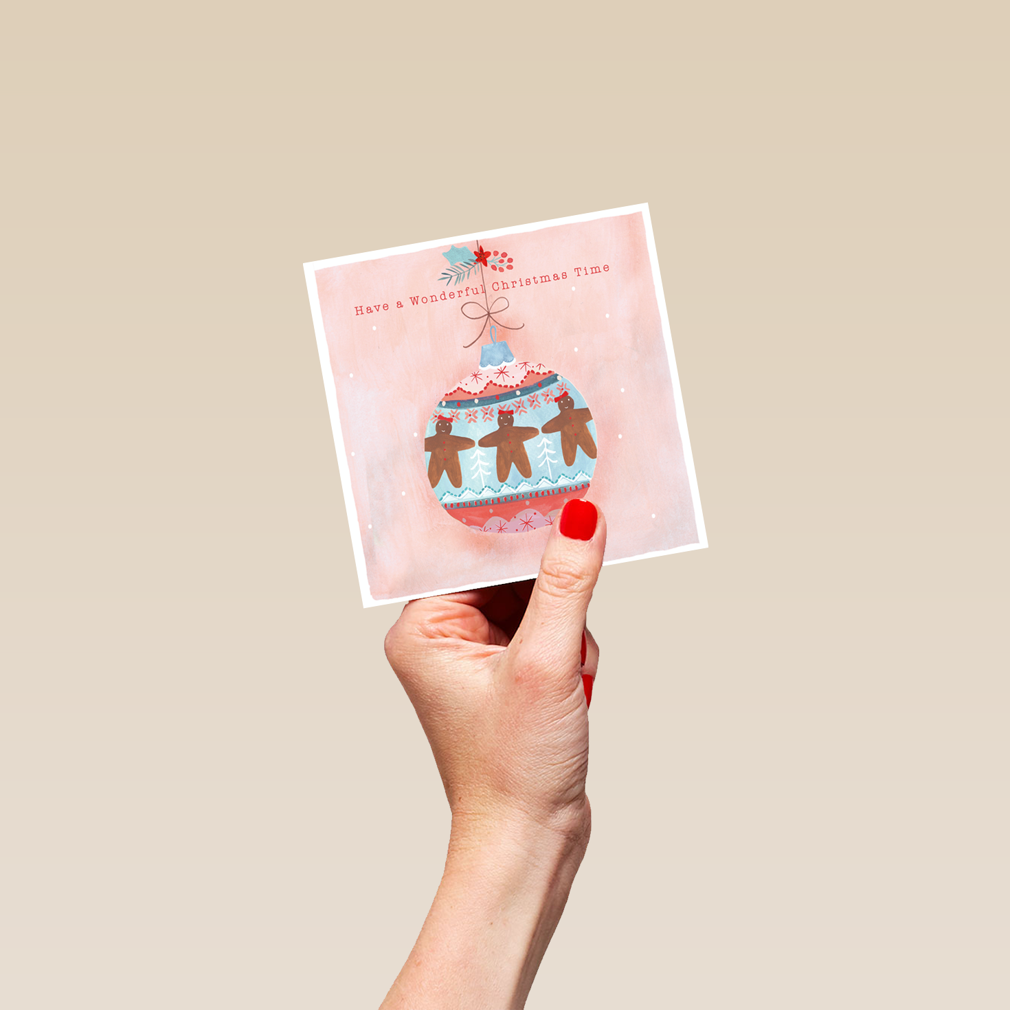 Show them you care with a personalised classic Christmas illustrated gingerbread bauble card from Hallmark. Our greetings cards are printed on premium quality, FSC®-certified card & delivered nationwide. This card is available as standard 12cm by 12cm and large 15cm by 15cm.