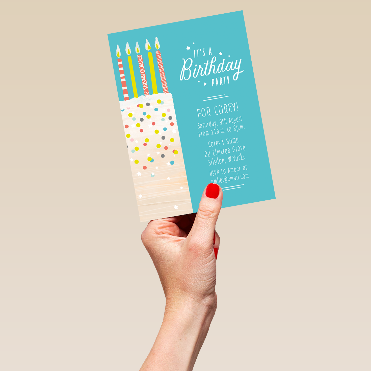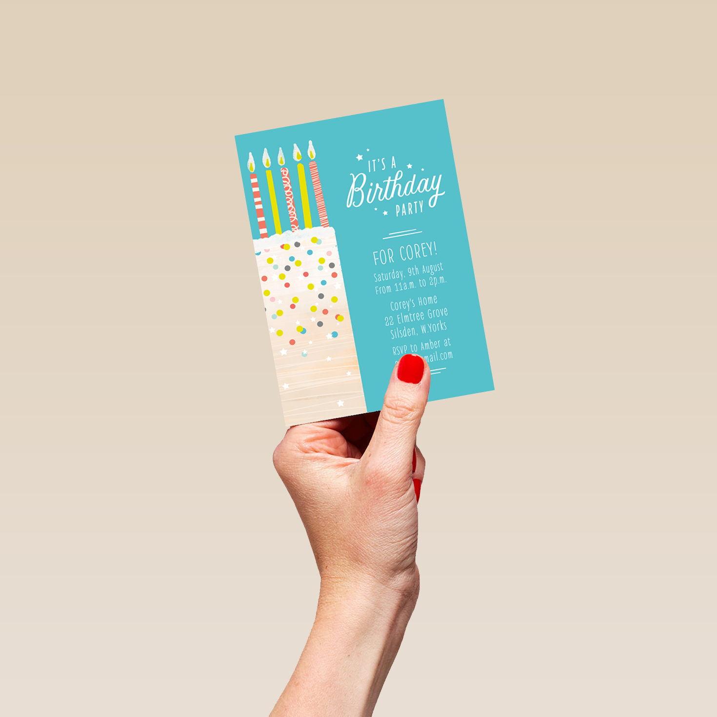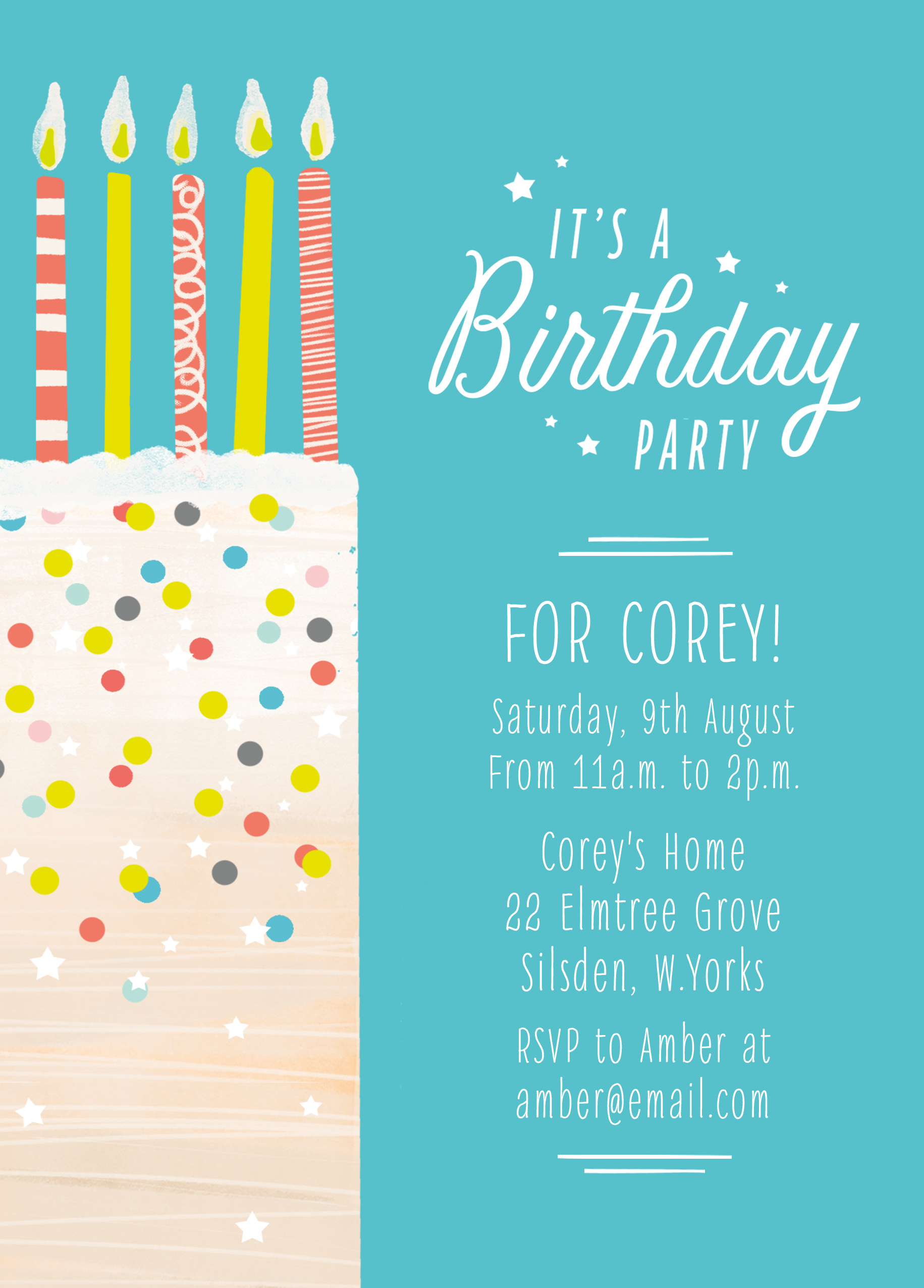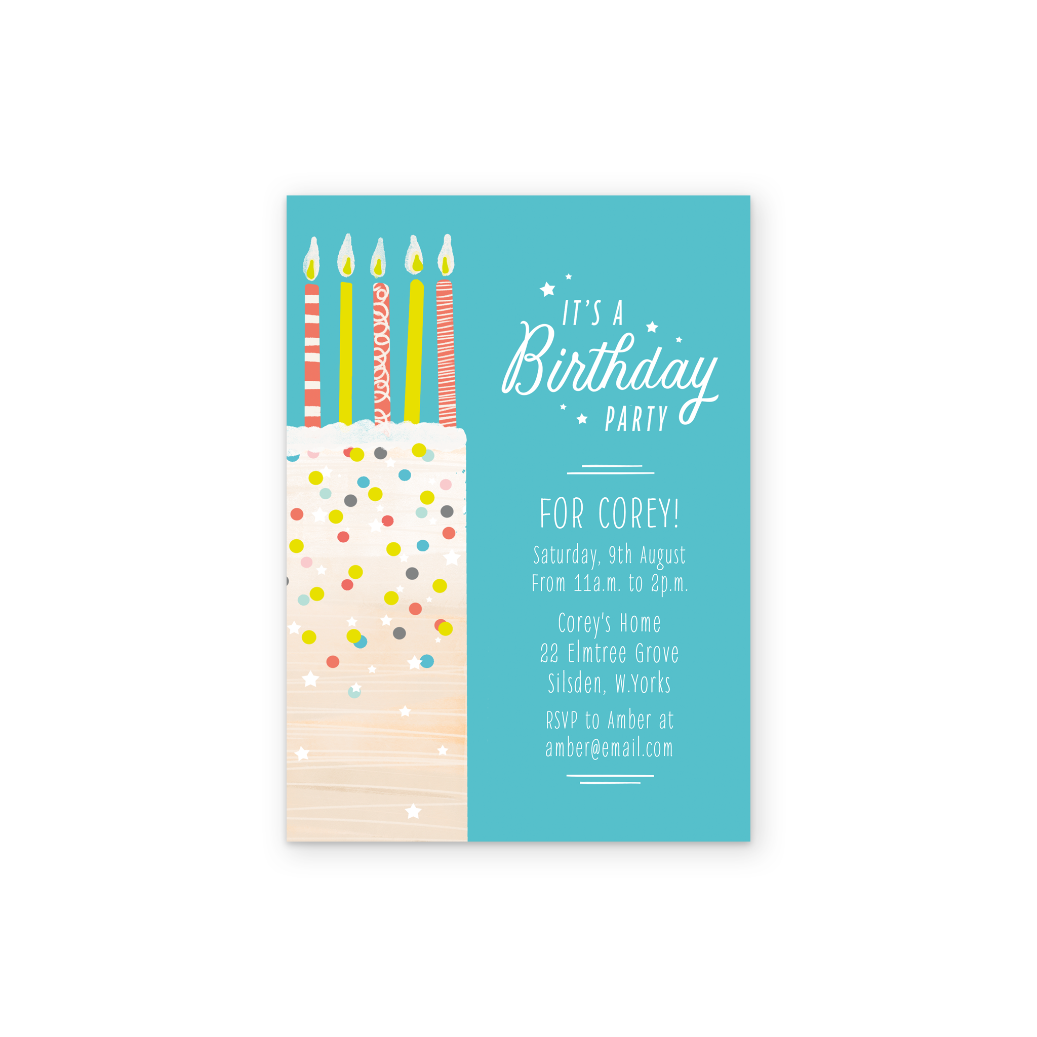 Printed on premium-quality board, this card features an illustrated cake covered with colourful sprinkles and decorated with 5 multi-coloured stripy candles, set against a vibrant turquoise background alongside white lettering, with the message 'It's A Birthday Party For [NAME] [DATE] [ADDRESS] RSVP to [NAME] at [EMAIL ADDRESS]', space to personalise your message, and comes complete with a co-ordinating white envelope.