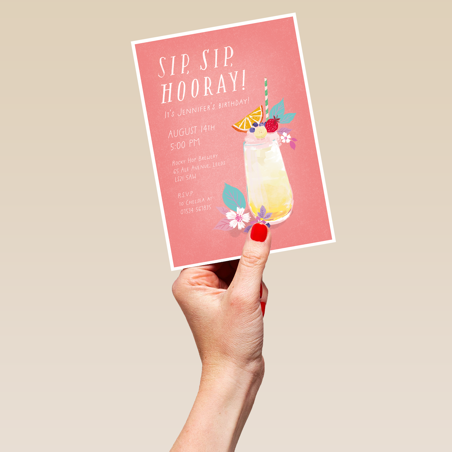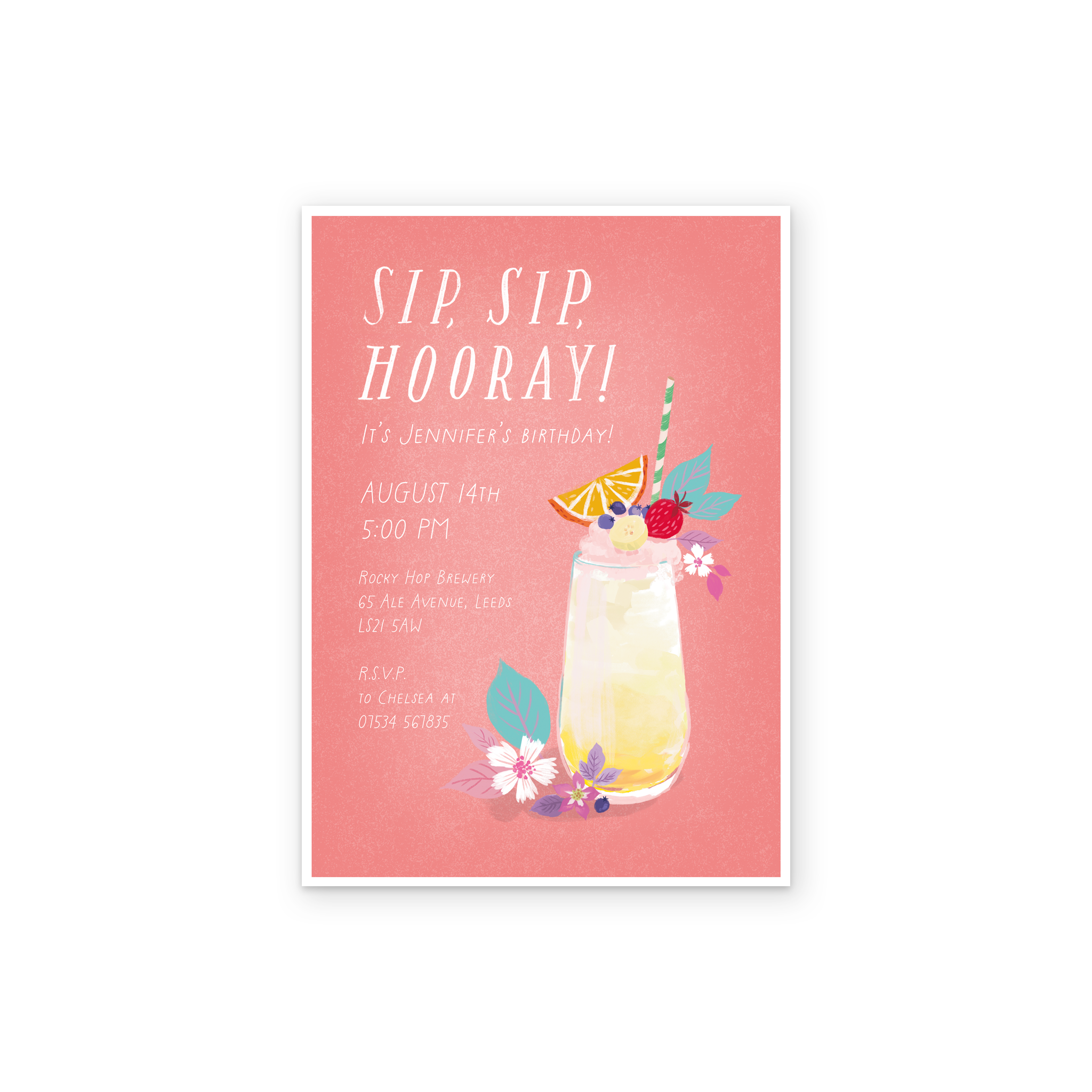 Printed on premium-quality board, this card features a tropically inspired, illustrated cocktail in a tall glass, garnished with fruit and flowers, set against a vibrant coral pink background alongside white lettering, with the message 'Sip, Sip, Hooray! It's [NAME]'s Birthday [DATE] [ADDRESS]', space to personalise your message, and comes complete with a co-ordinating white envelope.