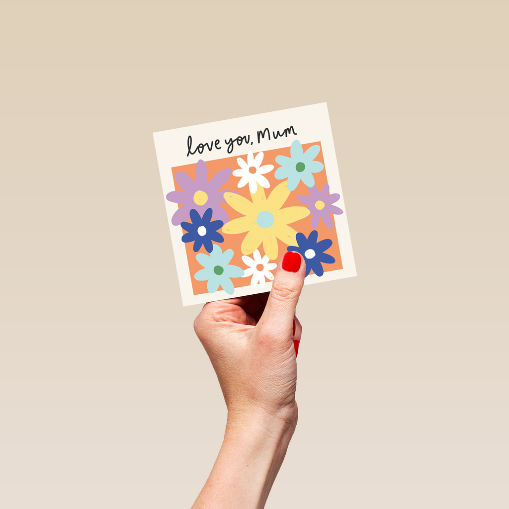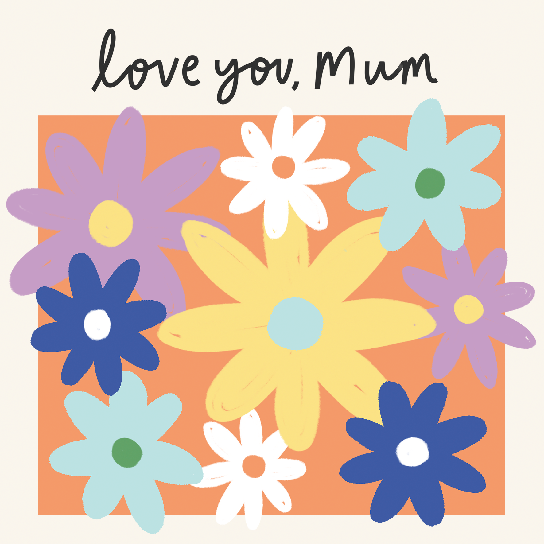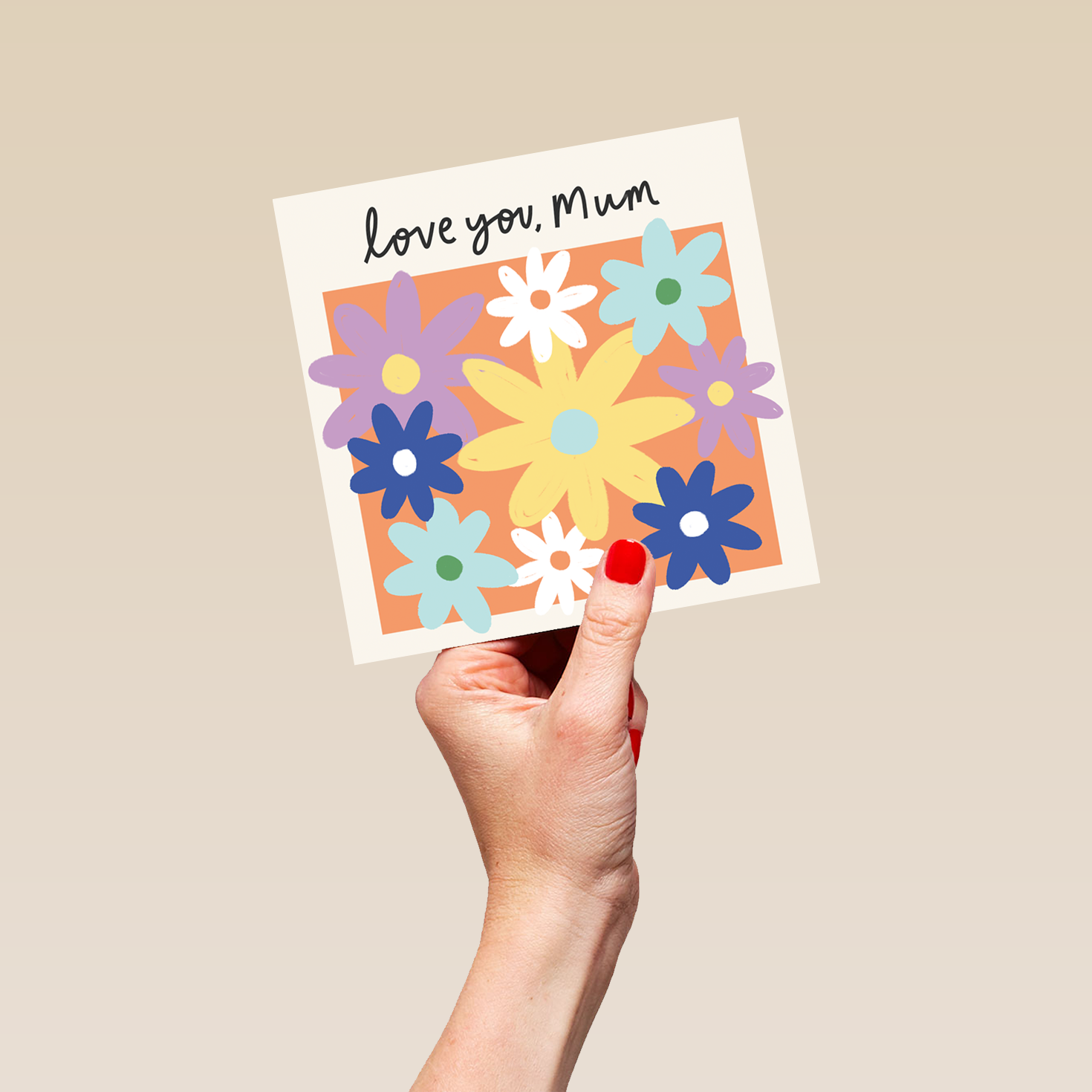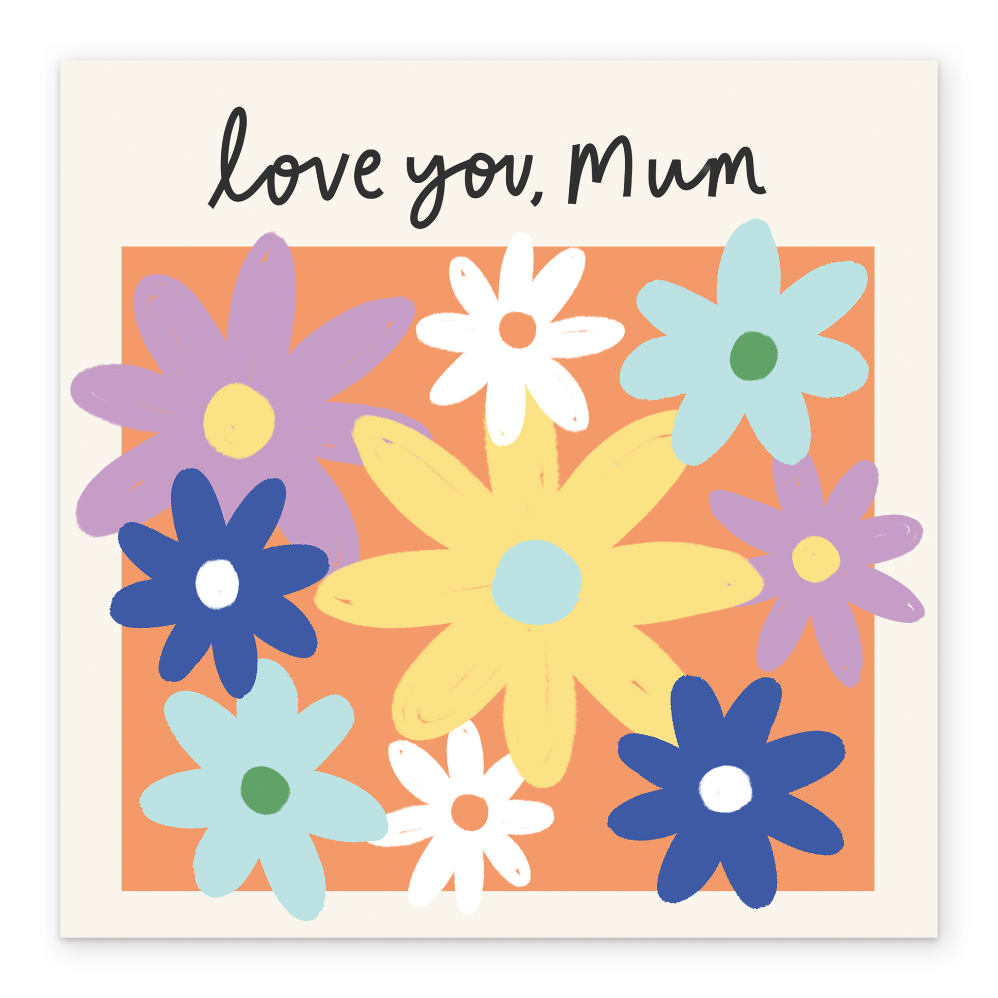 Printed on premium-quality board, this card features colourful flowers on an orange background, with the message 'Love you, Mum', and comes complete with a co-ordinating white envelope.